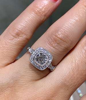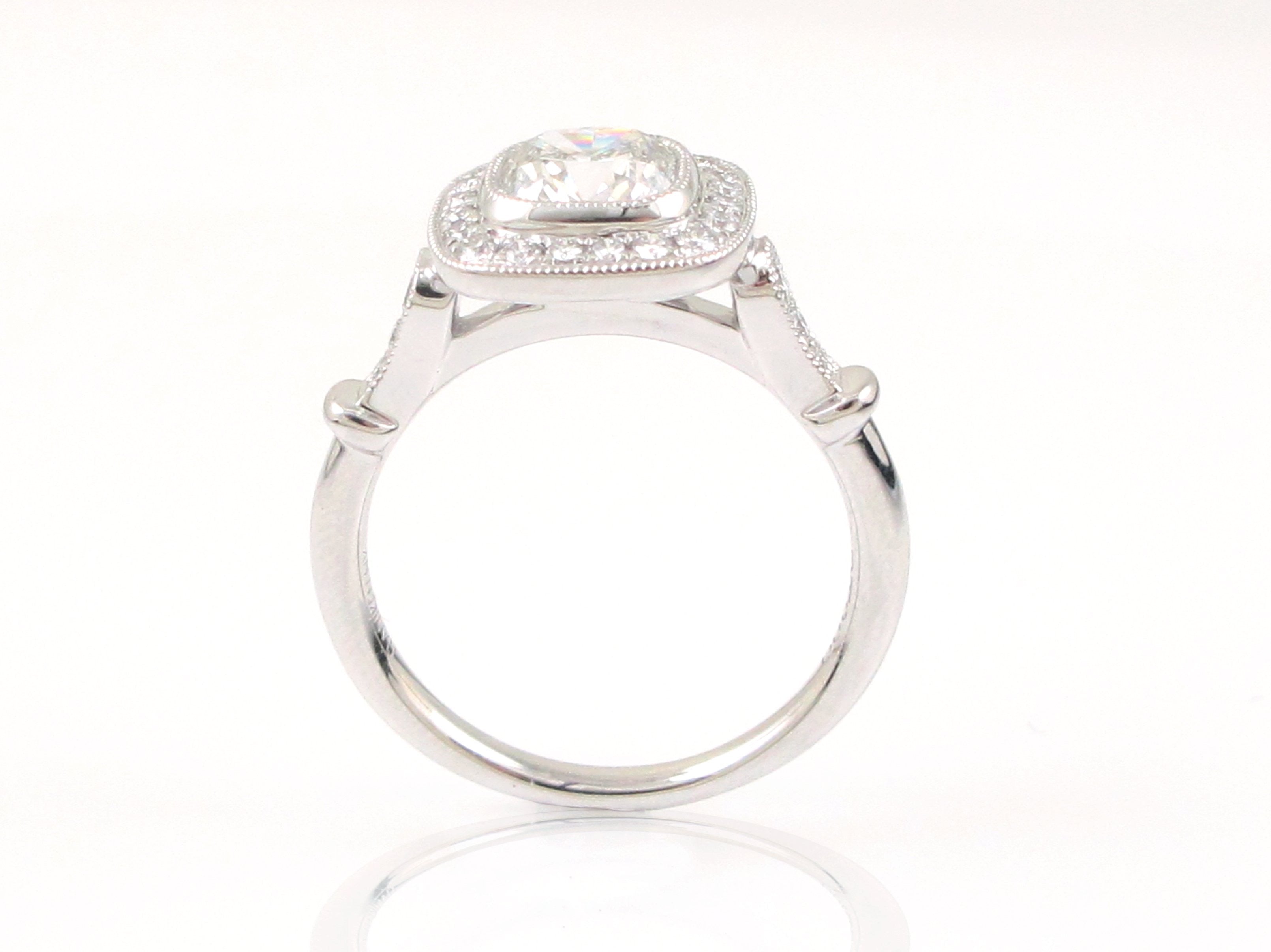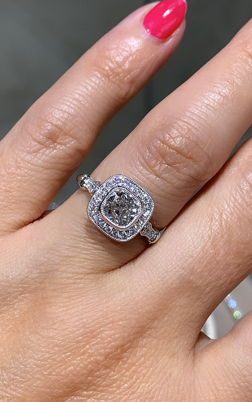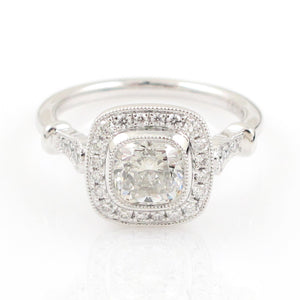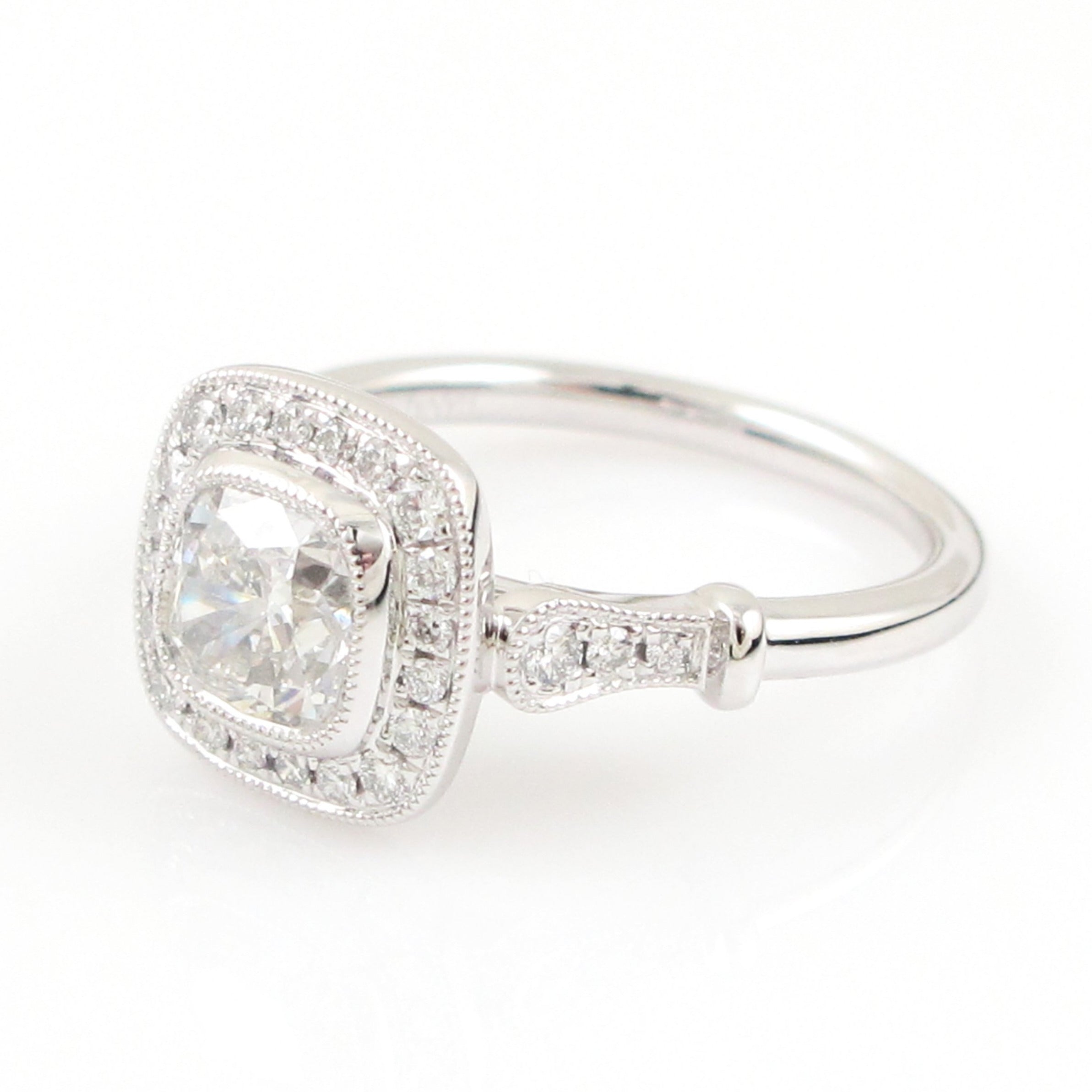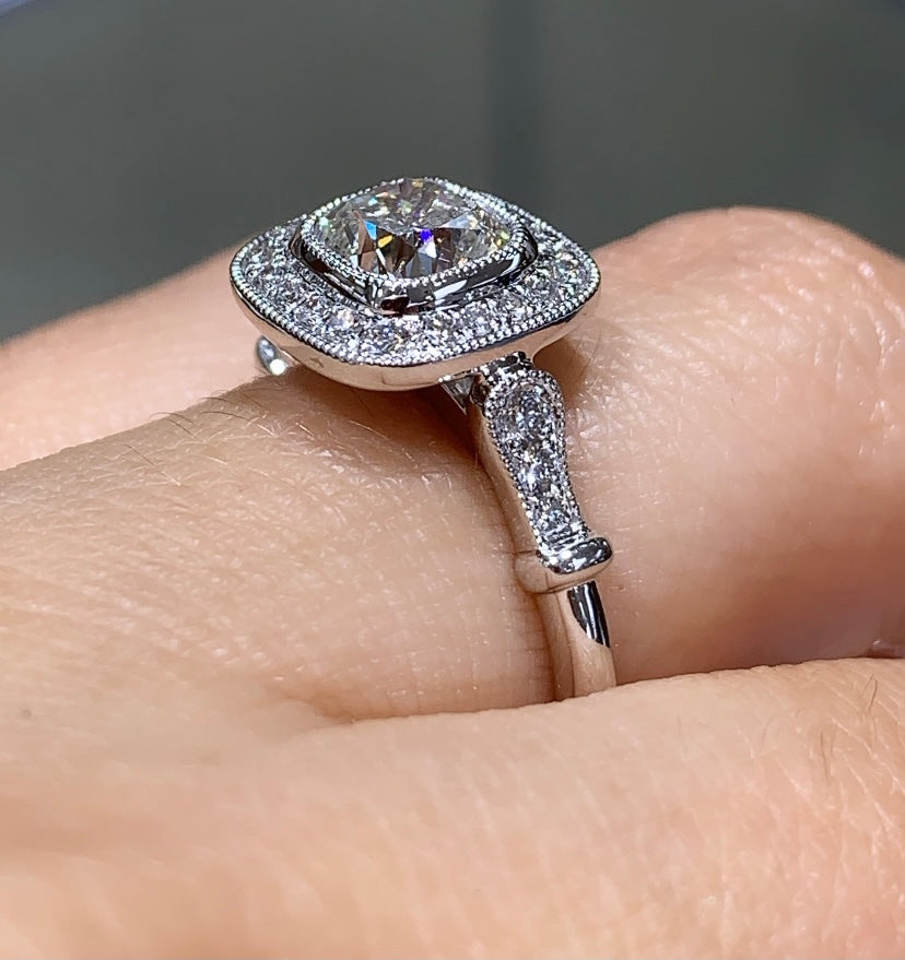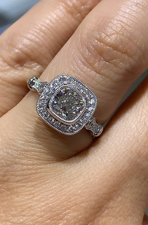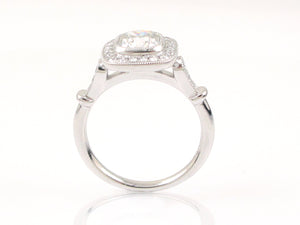 Exceptional and unique this Platinum diamond cushion cut engagement ring will become her favorite ring. Made with H color, VS2 clarity GIA certified cushion cut center diamond vintage inspired look. Metal: Platinum Center Diamond: 1.11ct cushion cut, H color, VS2 clarity (GIA) Side Diamonds: 0.23 ct tw 26 Round Brilliant Cuts