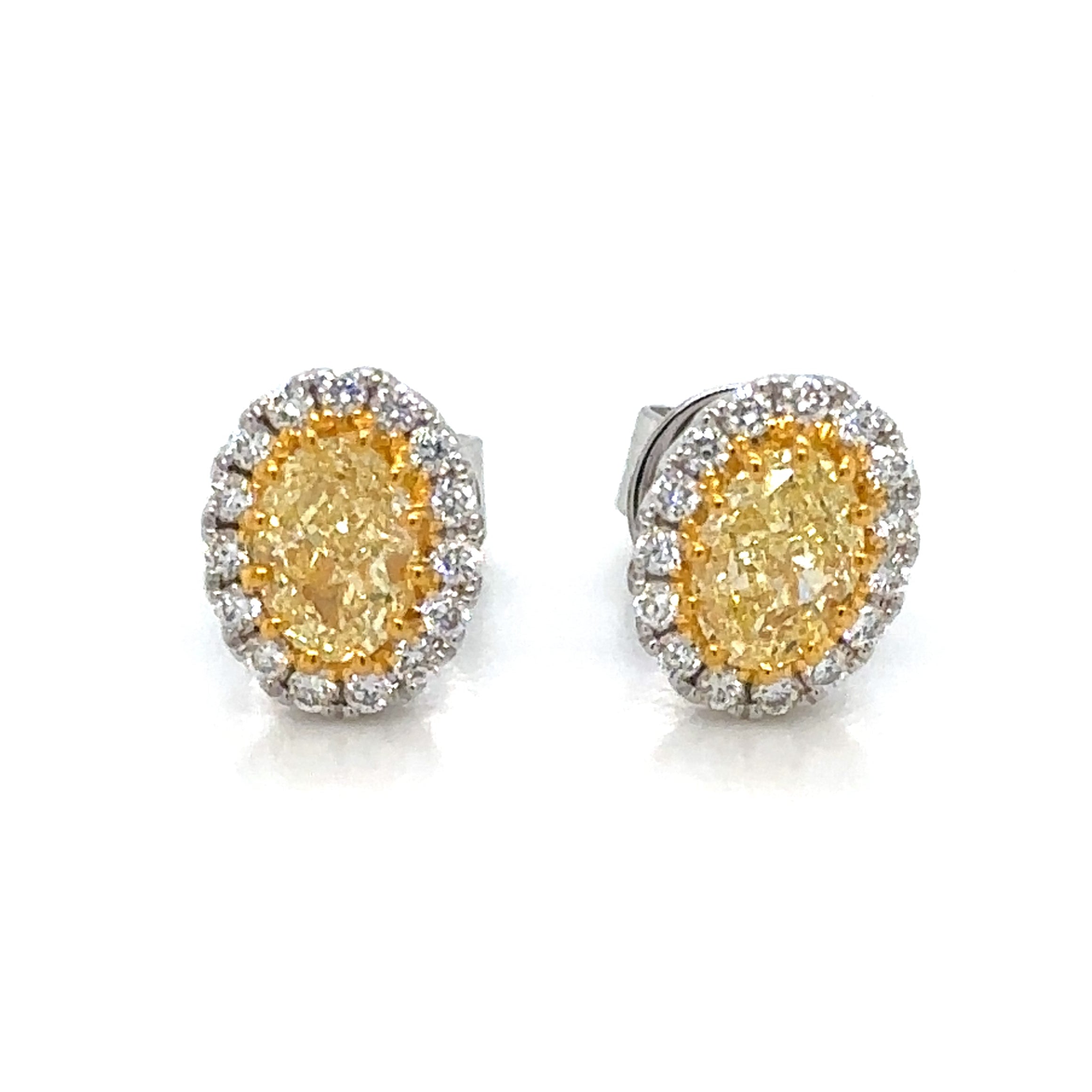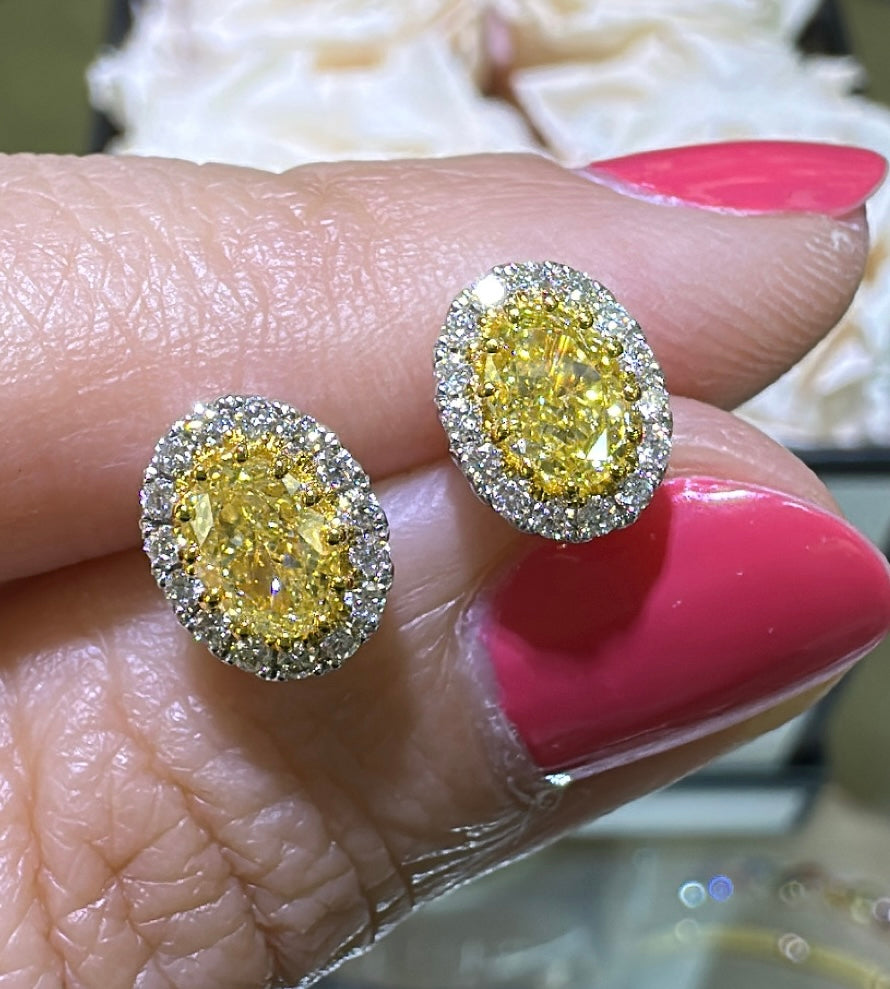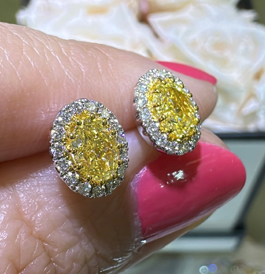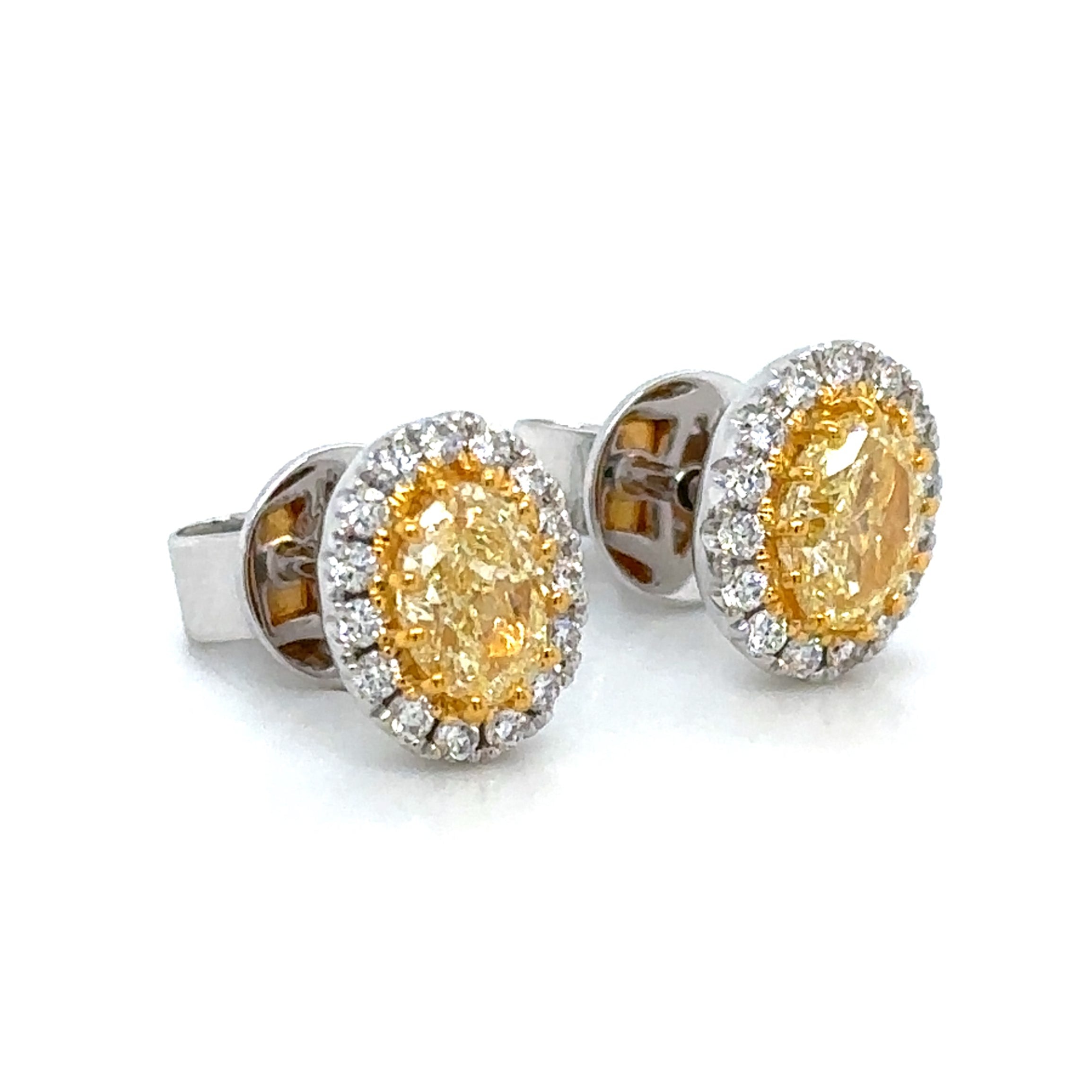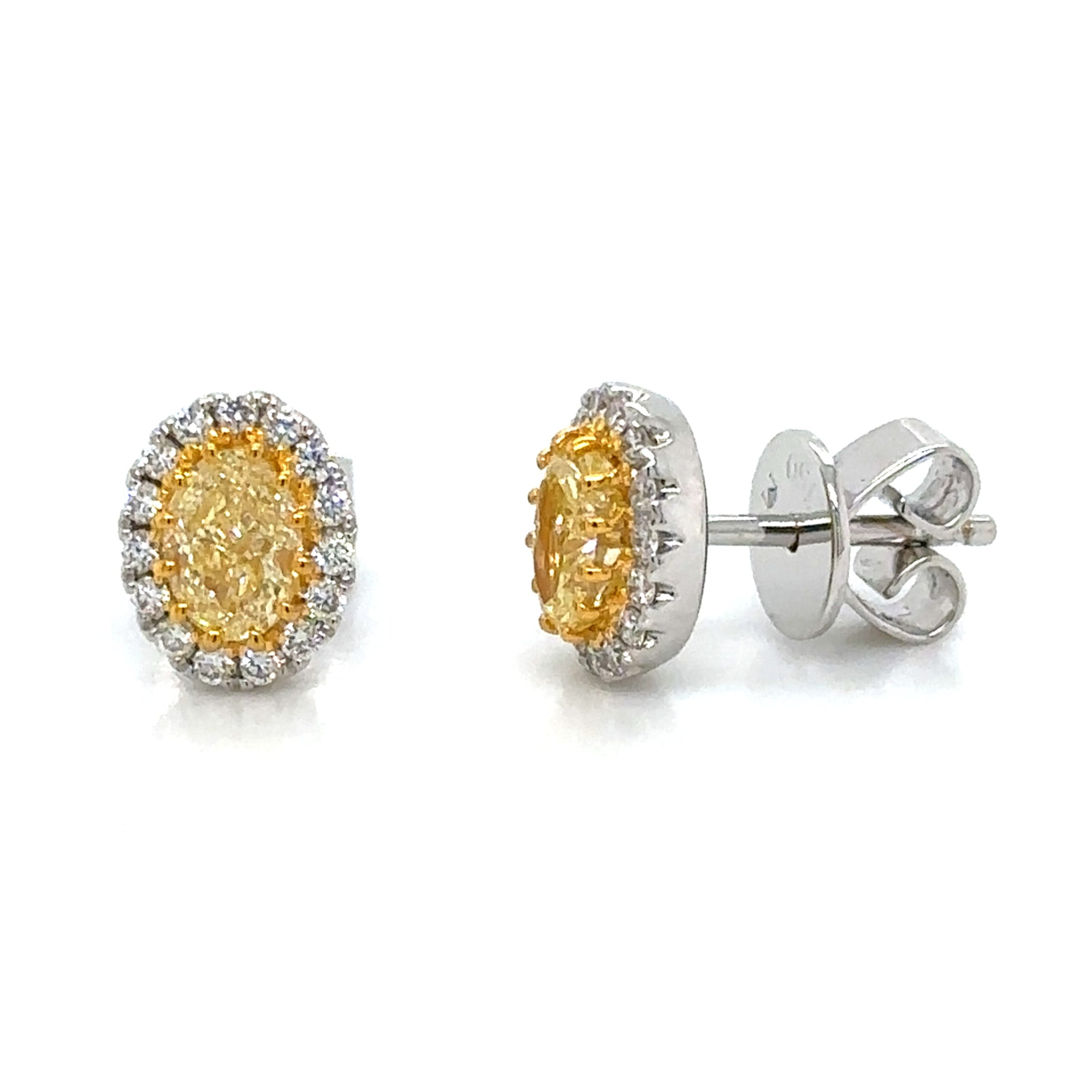 Elevate your style with these exquisite 1.38 carat total weight oval-cut fancy canary yellow diamond stud earrings. The rare, vibrant yellow hue captures light magnificently, creating a warm glow that flatters every skin tone. These premium studs make a bold statement while maintaining timeless elegance—perfect for special occasions or adding luxury to your everyday ensemble. An investment piece that transforms any outfit instantly.