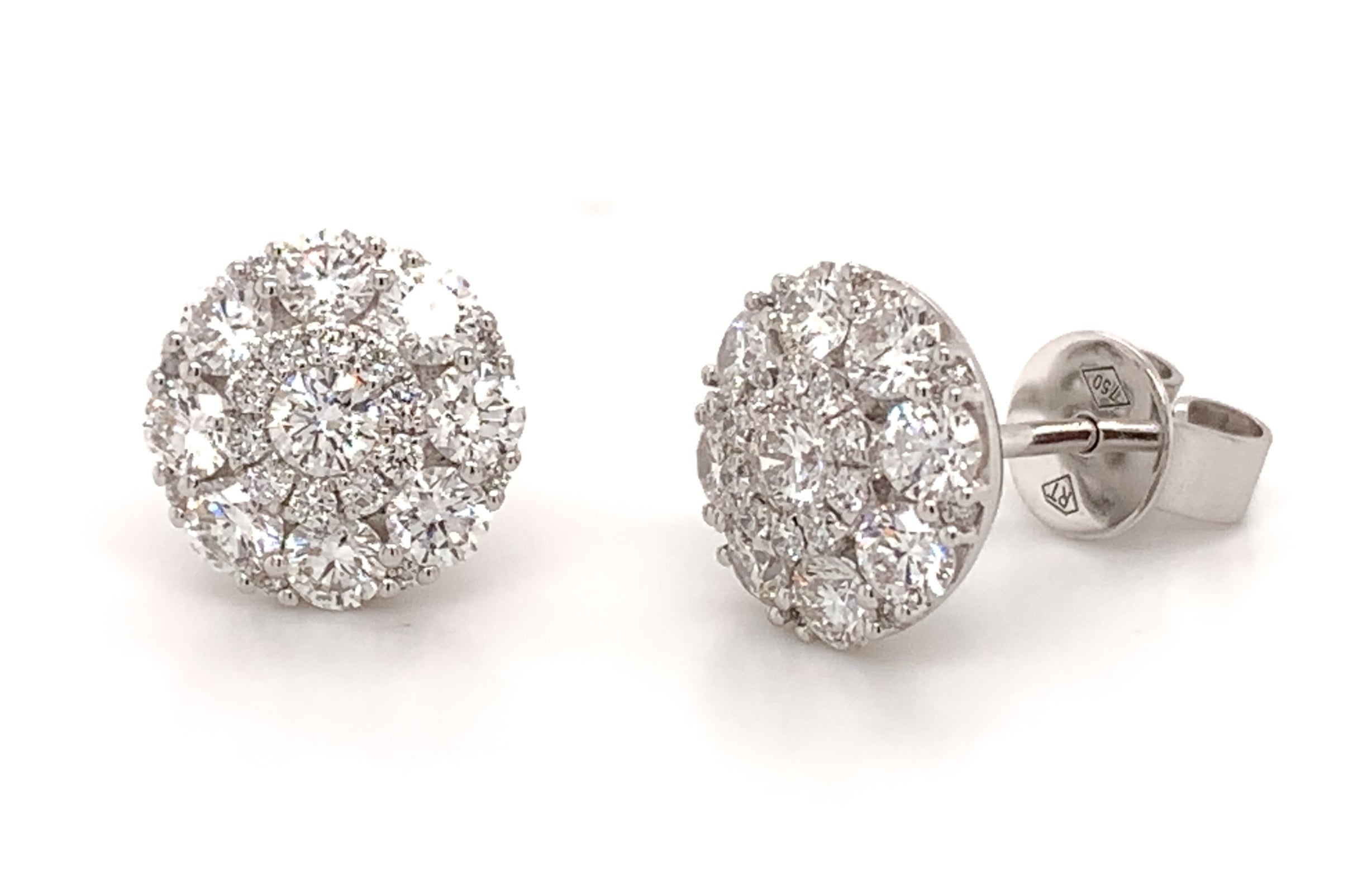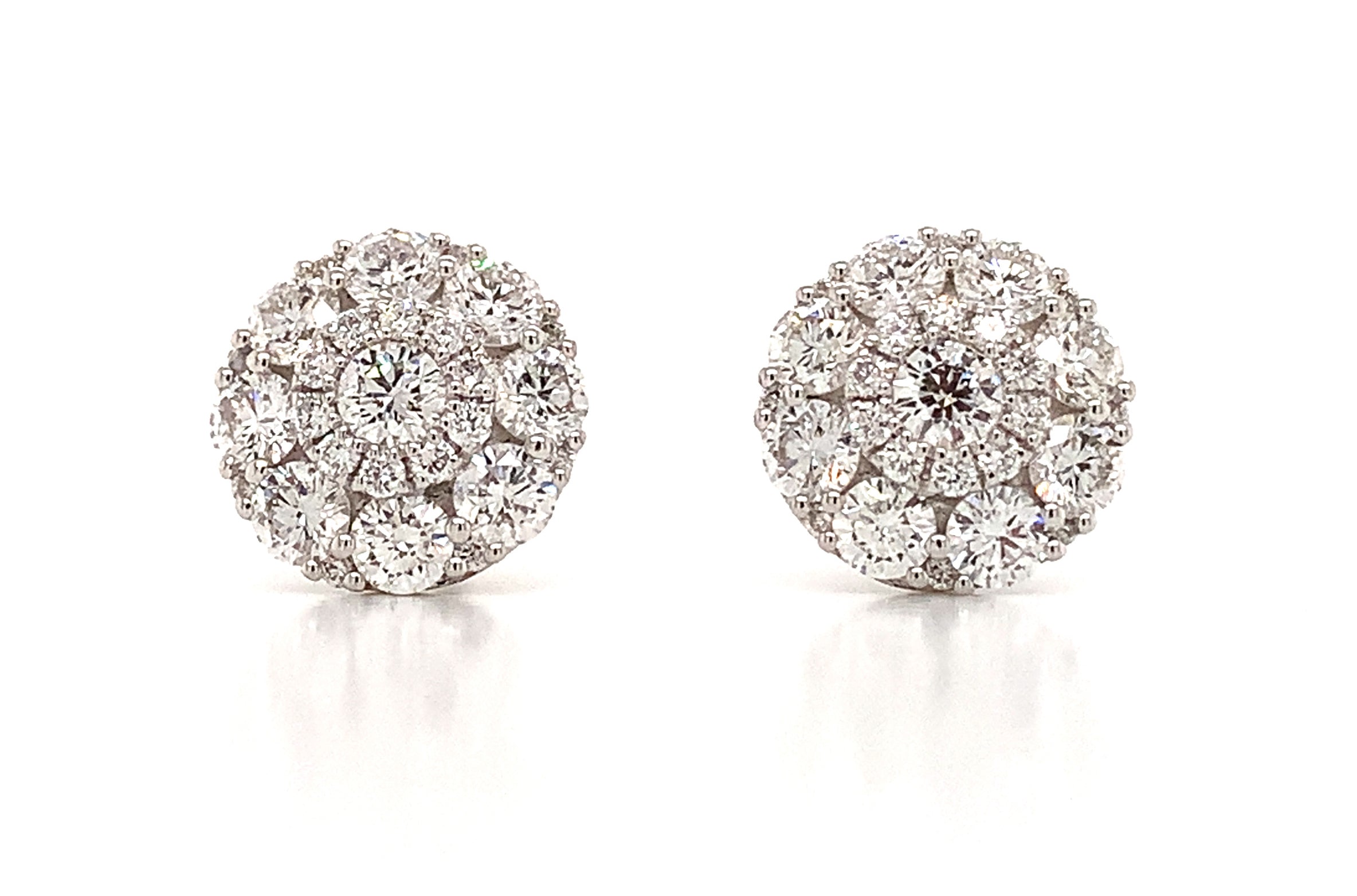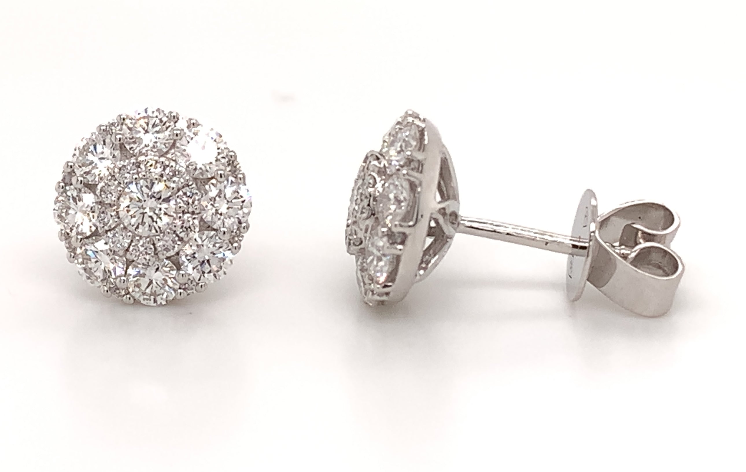 Cluster diamond stud earrings prove the age-old saying "Diamonds are a girl's best friend". Each elegant round cut prong set stud earring set with 54 round brilliant cut diamonds, totaling 1.38 carats of delicious pleasure. Crafted in genuine 18K white gold.