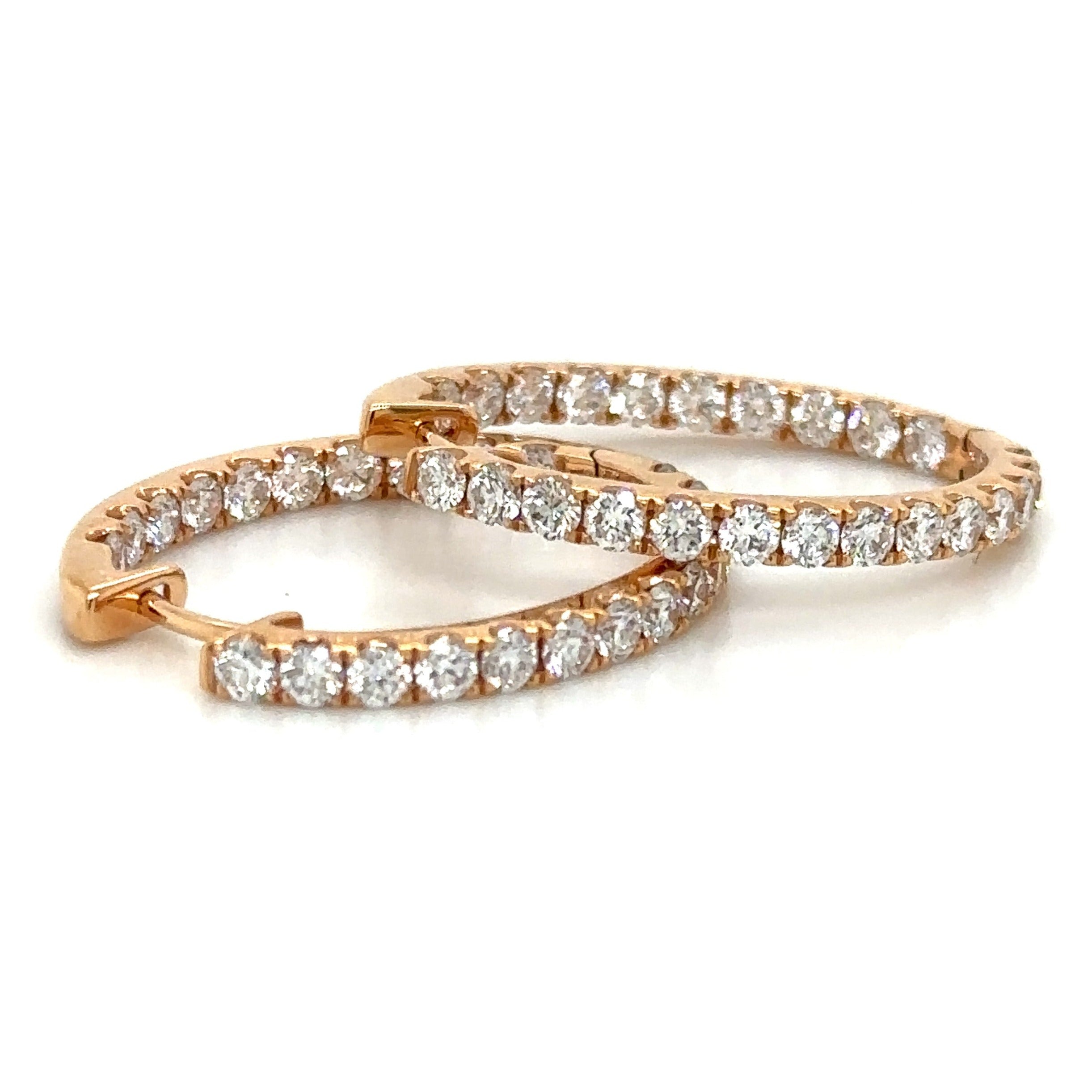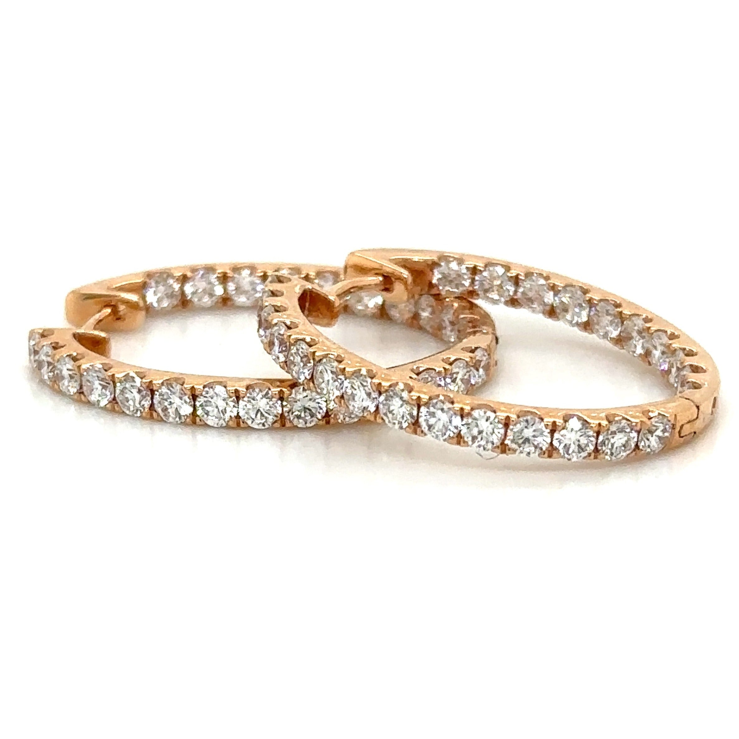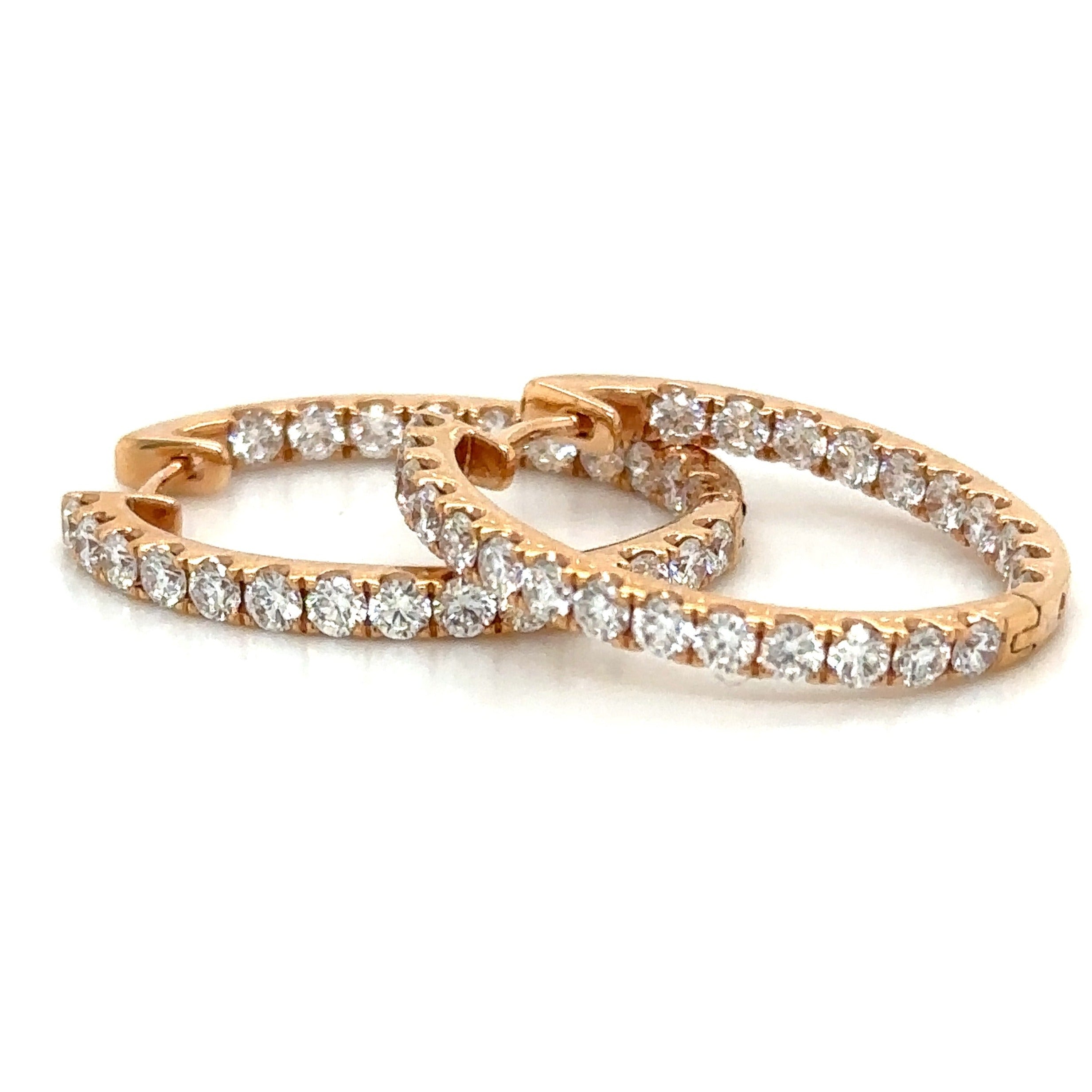 Capture her heart with these 1.92ct tw diamond oval inside out hoop earrings! Crafted with 18K rose gold for longevity, these earrings feature luxurious round cut trails of diamonds that dance in the light. A unique and timeless design with a sustainable quality, these earrings will be treasured by her forever!