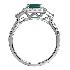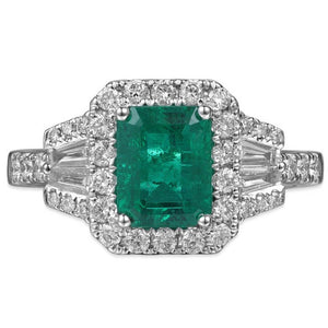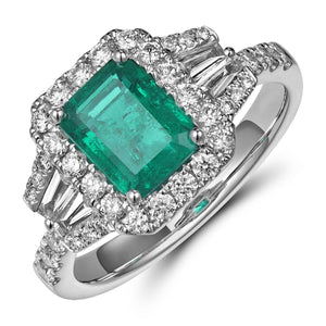 The center stone is emerald cut shape and has gorgeous facets. For extra sparkle, 4 Trapezoid cuts side 0.19ct tw diamonds and has been framed by 38 round brilliant cut 0.47ct tw diamonds forming a beautiful halo around.