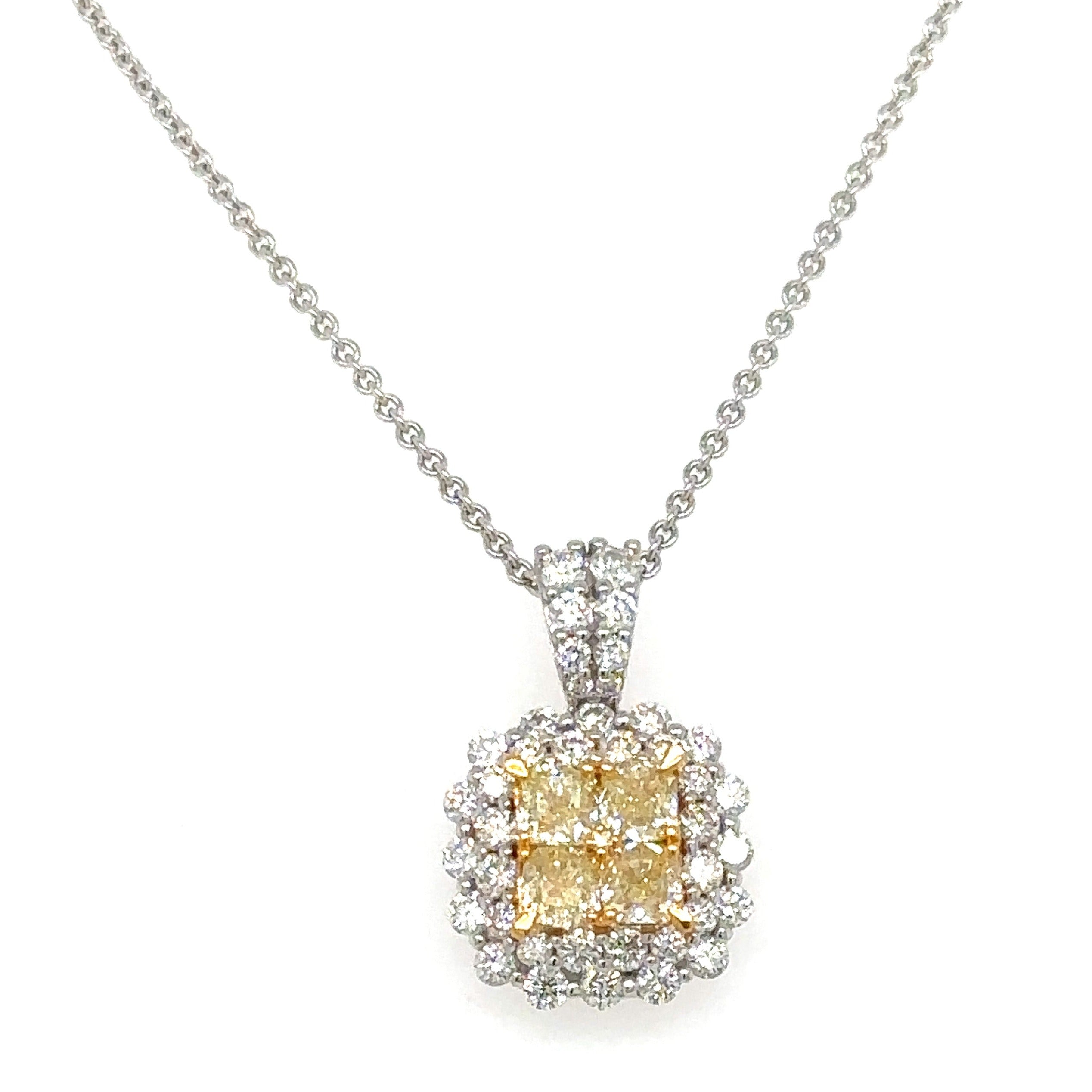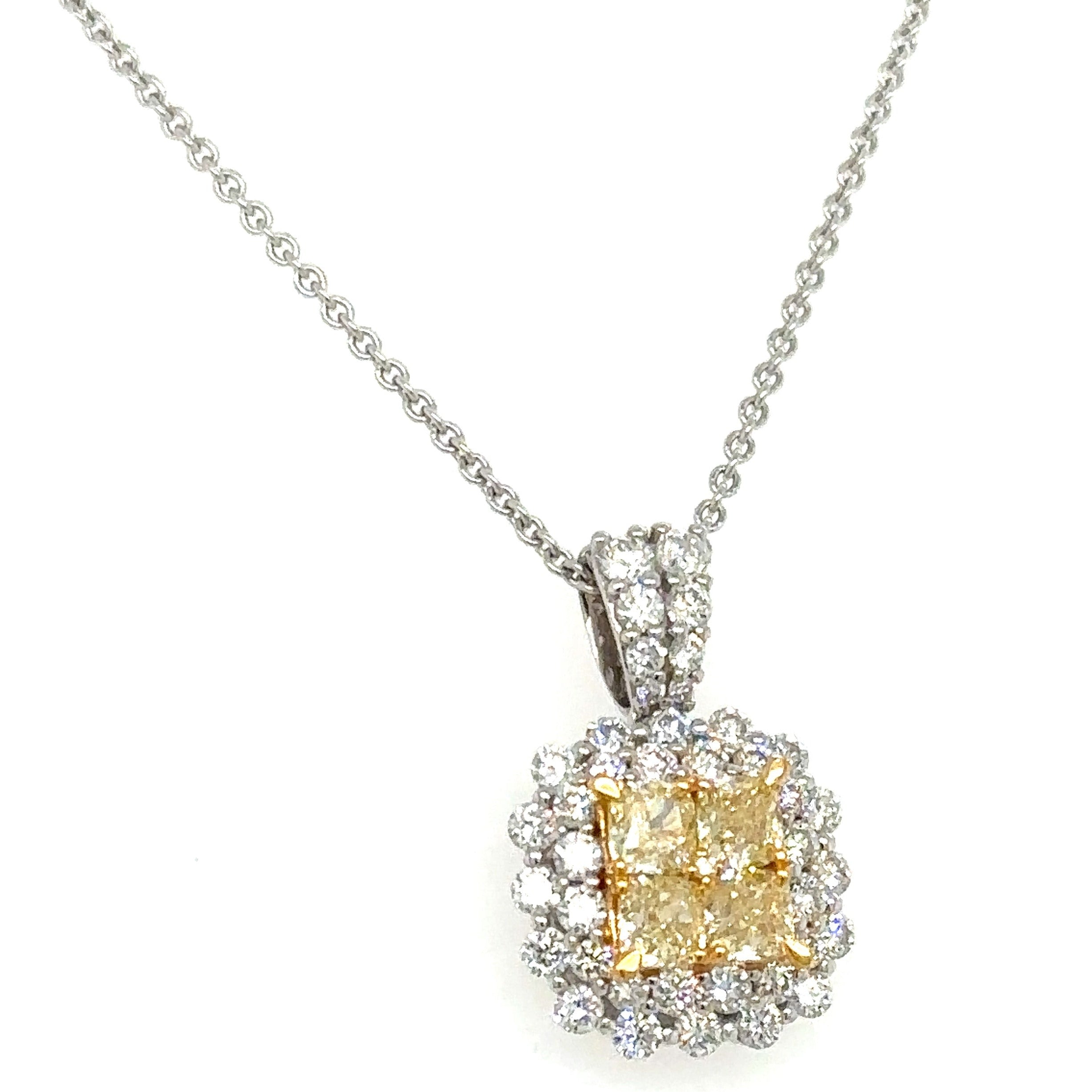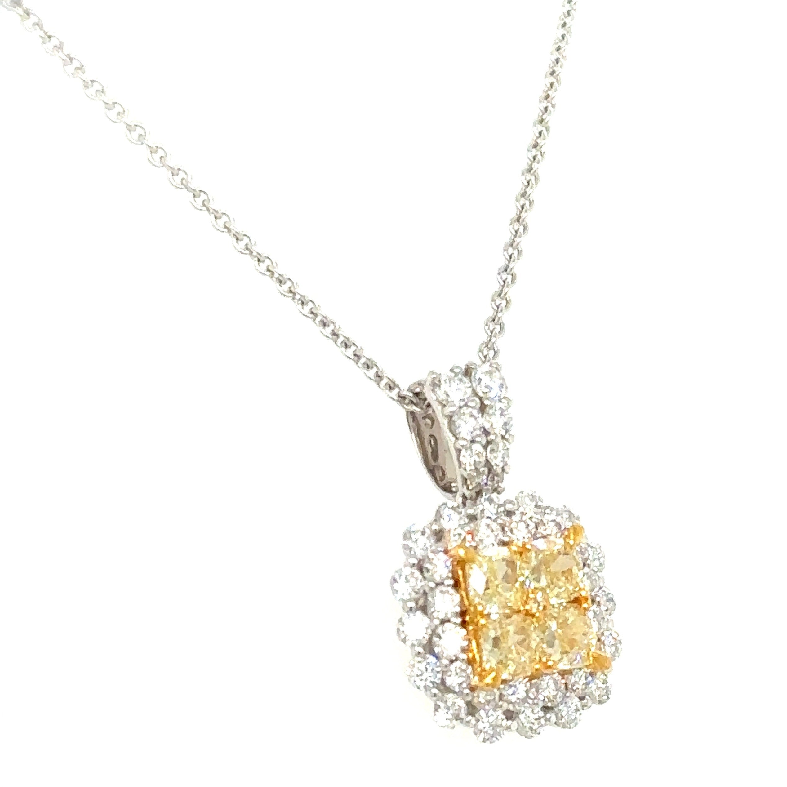 Introducing the perfect expression of your vibrant personality: A 1.47ct tw canary fancy yellow diamond pendant necklace. Delicate and intricate, this stunning double halo pendant will be a show-stopper, and bring a bright spot to your day. Get ready to dazzle!