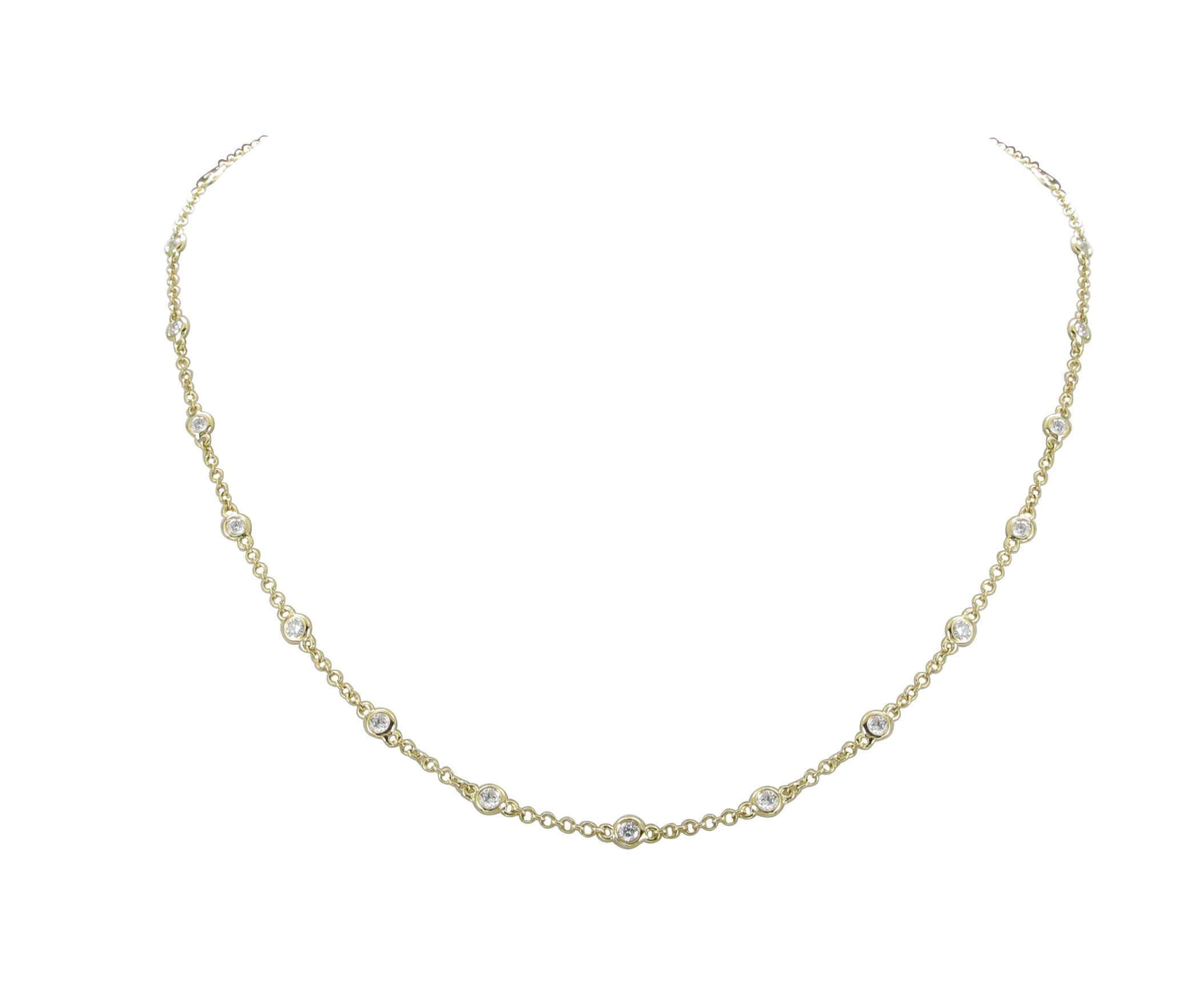 Do you want to add simplistic sophistication to your look? Look no further than this stunning 1.50ct t.w. Diamond By The Yard Necklace. Each diamond is encased in a stylish bezel setting and outlined with milgrain detail for a timeless, classy look. Add elegance to any outfit with this exquisite necklace.