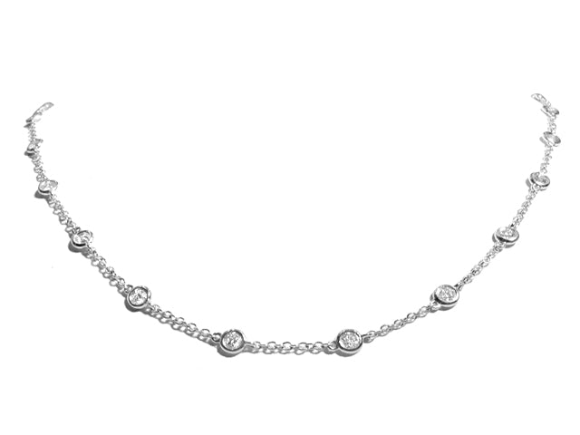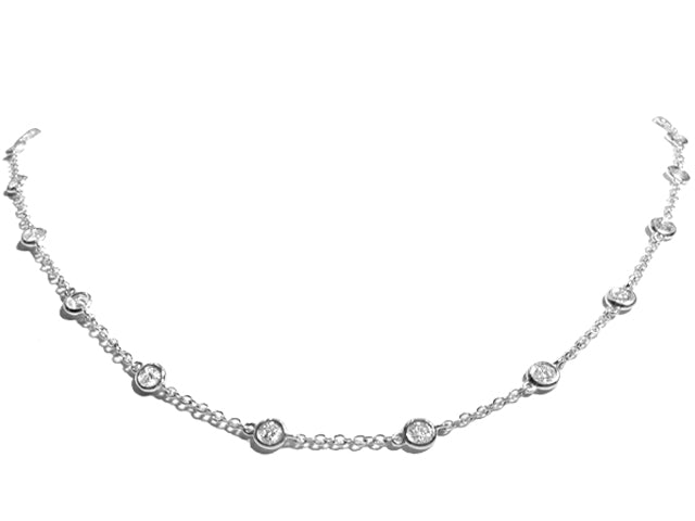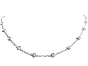 We all love diamonds by the yard necklaces. It is so simple and yet so glam. She will absolutely love the trendy look and besides it will make her mind wonder of million ways to wear it. Metal: 18K White Gold 5.33 gr Diamond Weight: 1.51ct t.w. Amount Of Diamonds: 23 Diamond Shape: Round Brilliant Setting: Bezel Chain Length: 22" Finish: High Polish