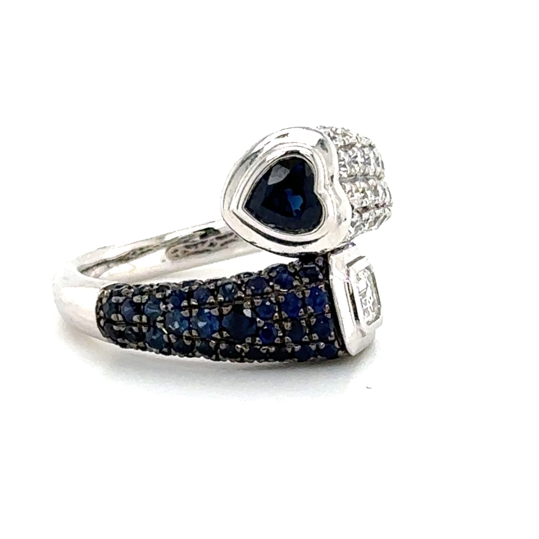 This stunning 1.60carat blue sapphire wrap pinky emerald and heart moi & toi pave diamond ring exudes elegance and charm. The striking blue sapphire and sparkling pave diamonds create a luxurious and captivating look.