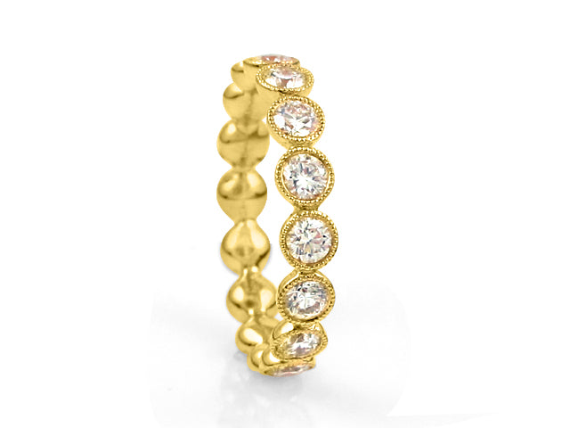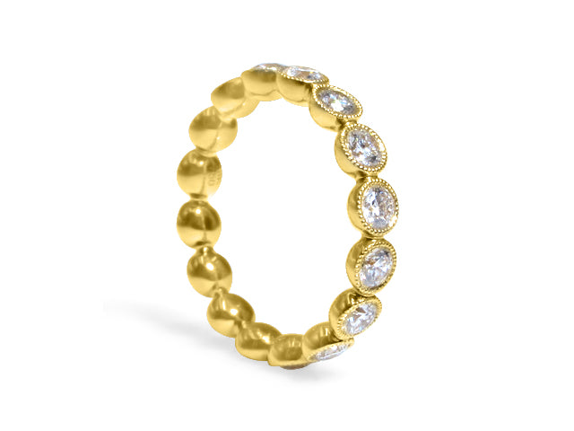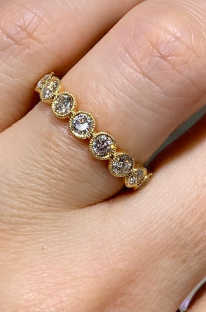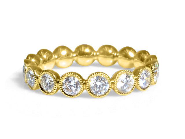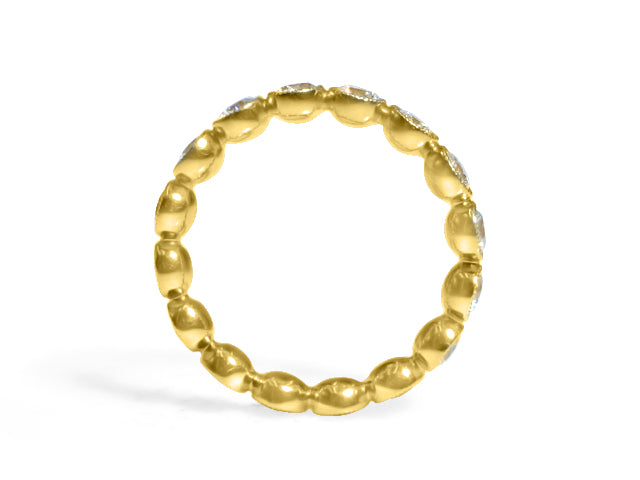 Ladies diamond eternity ring made in 18k Yellow gold and is bezel set with 16 round brilliant diamonds. Total carat weight 1.59ct tw