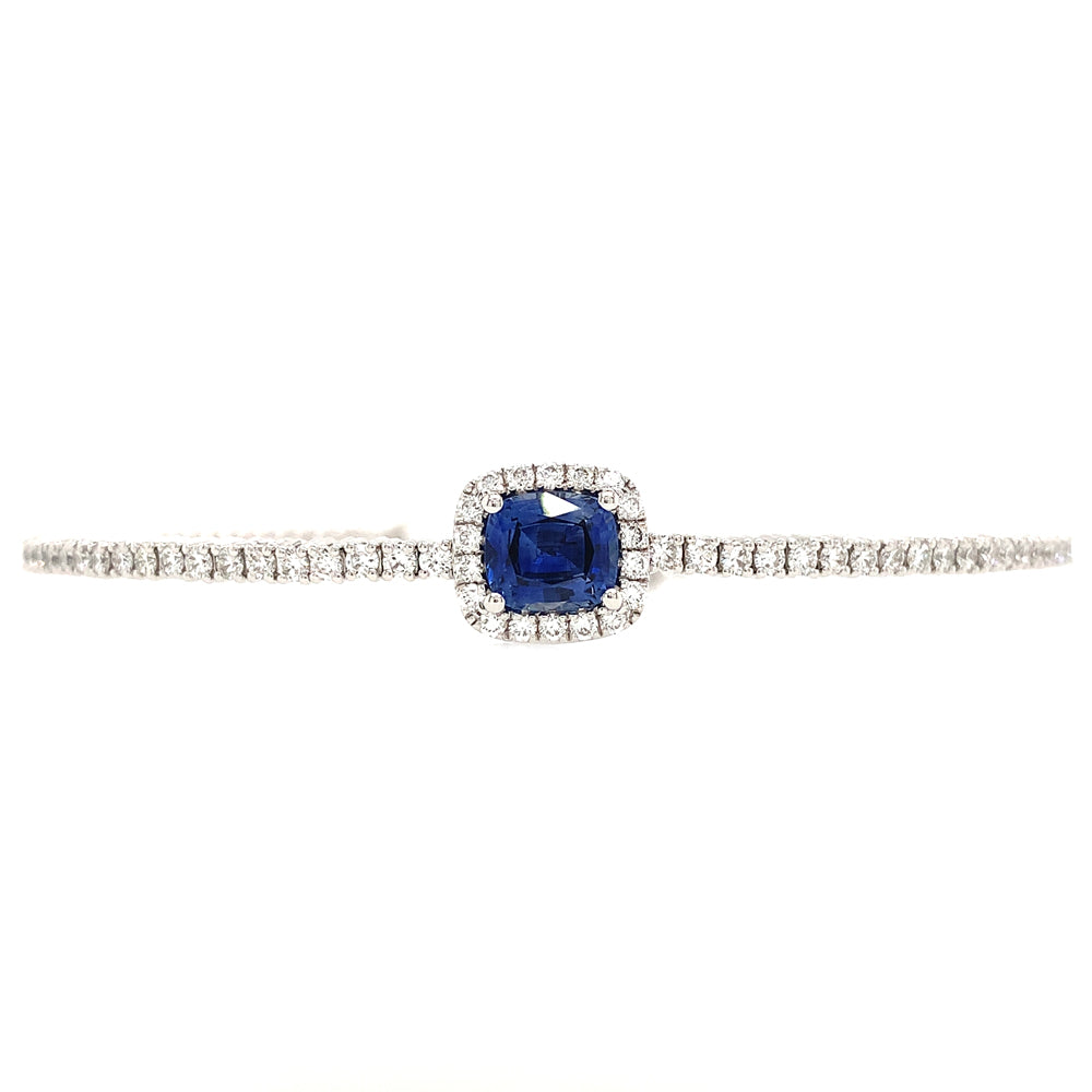 Experience the stunning beauty of our 1.65carat cushion cut blue sapphire center semi flexible diamond bracelet. With its vibrant blue color, elegant cushion cut and semi-flexible design, elevate any outfit with a touch of sophistication. The perfect blend of luxury and versatility, this bracelet is sure to become your go-to accessory for any occasion.