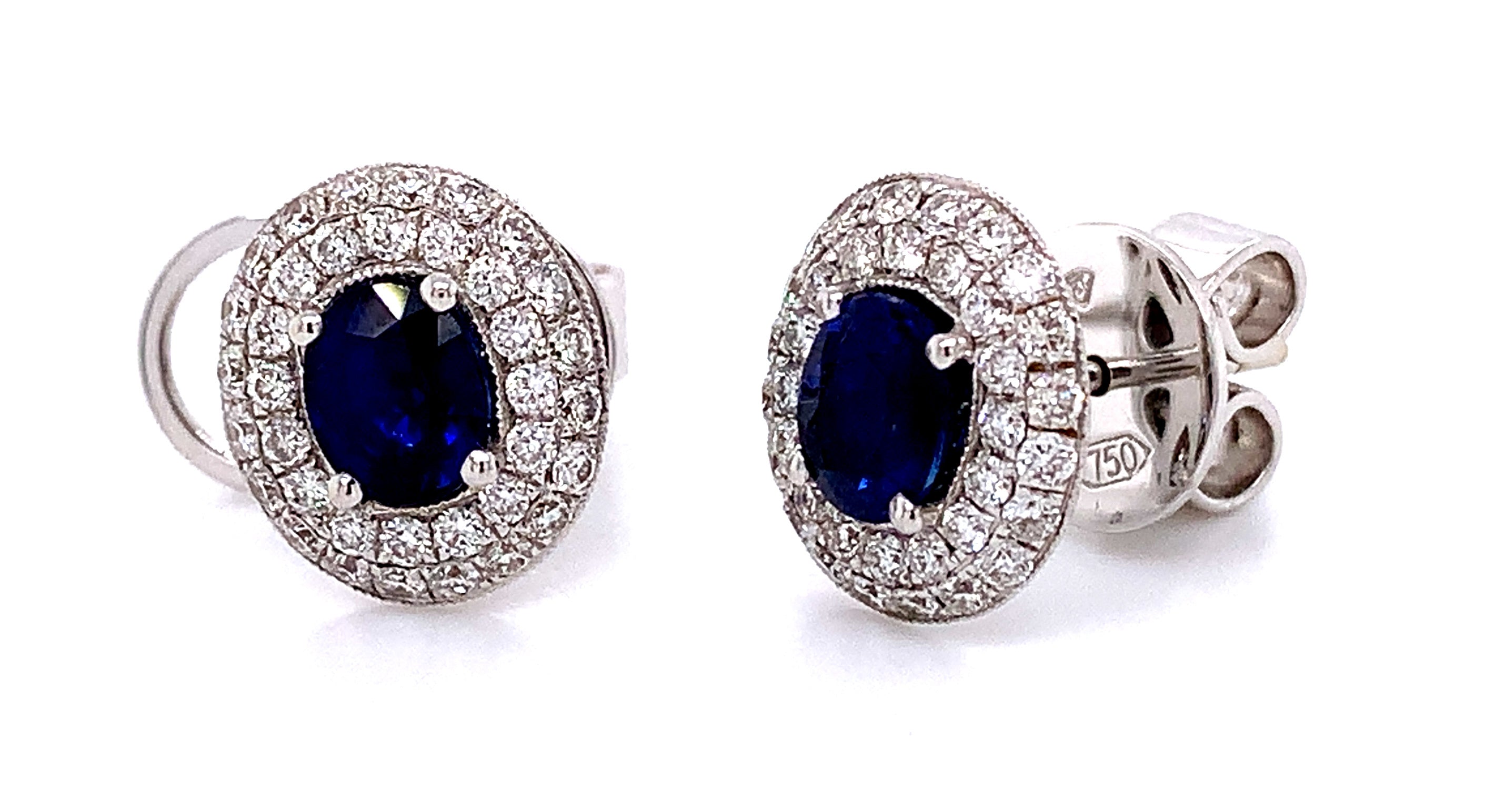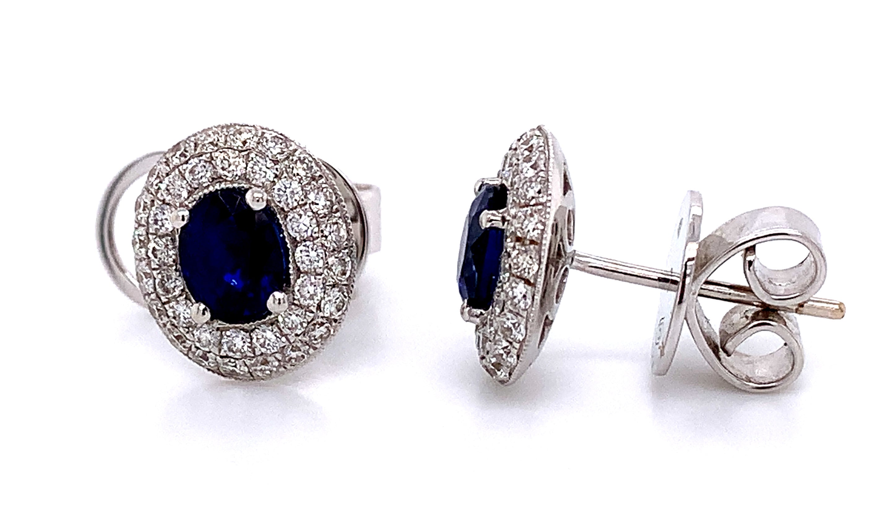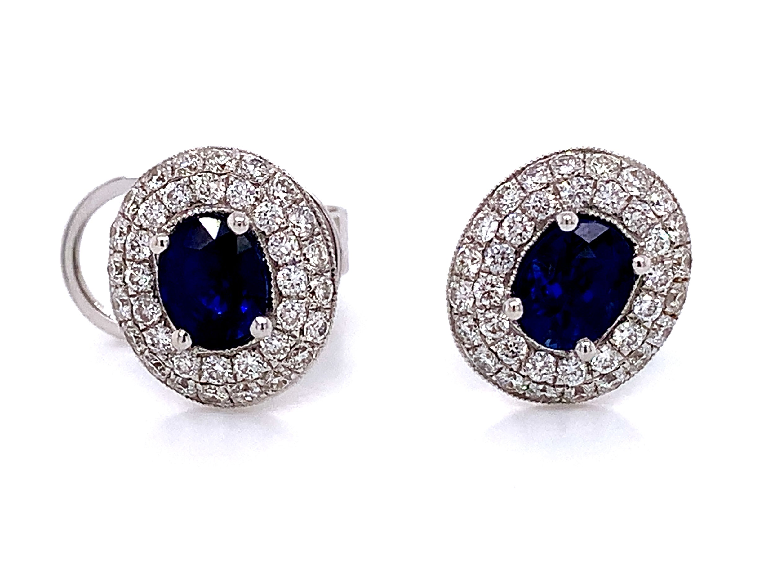 This 1.70ct oval center sapphire earrings is complimented by round diamonds to set off its beauty even more. white gold and the rich color complements the deep blue hue perfectly.