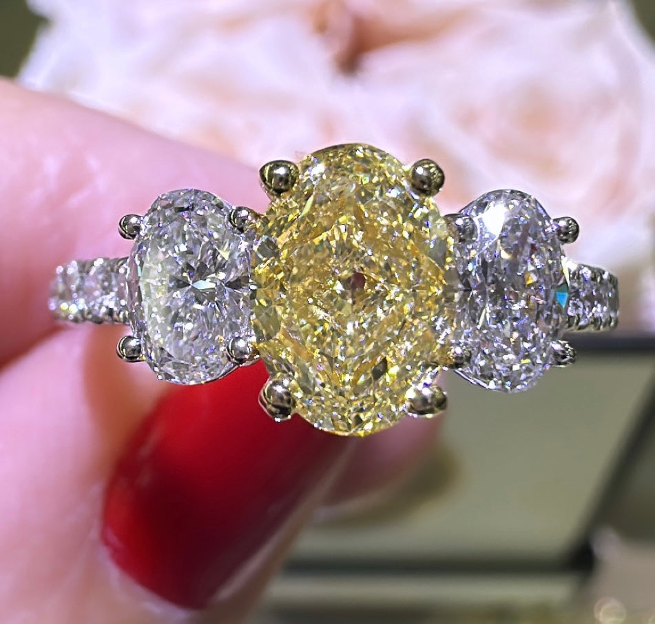 Experience the luxury and brilliance of our 1.97ct tw oval canary fancy yellow three stone diamond ring. With its elegant design and vibrant canary diamond, this ring will make a statement and add a touch of glamour to any outfit. Perfect for special occasions or as a symbol of your love and commitment.