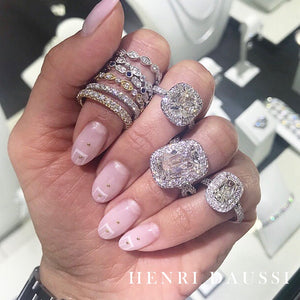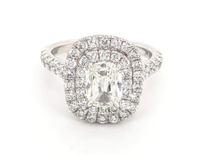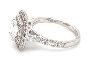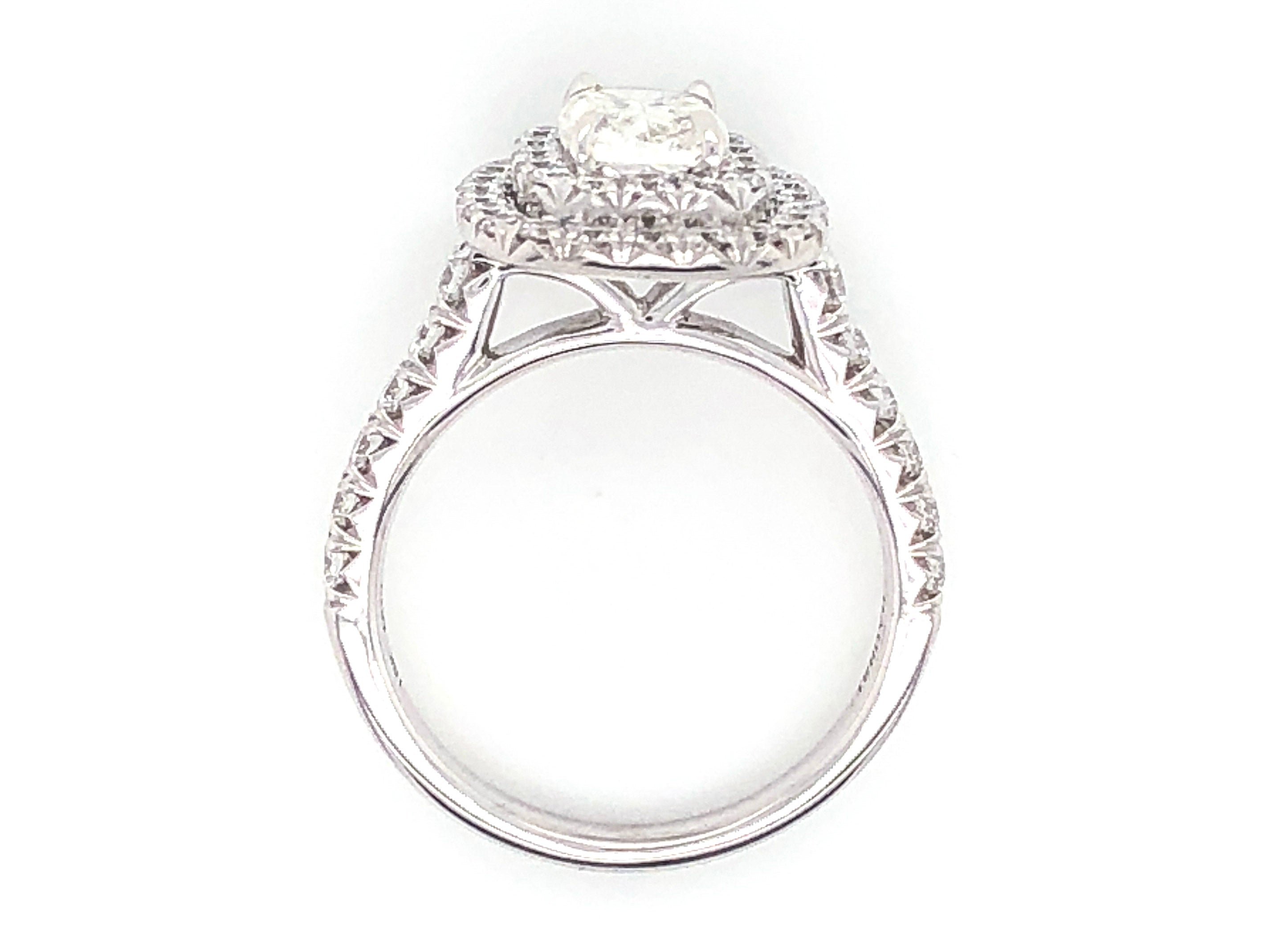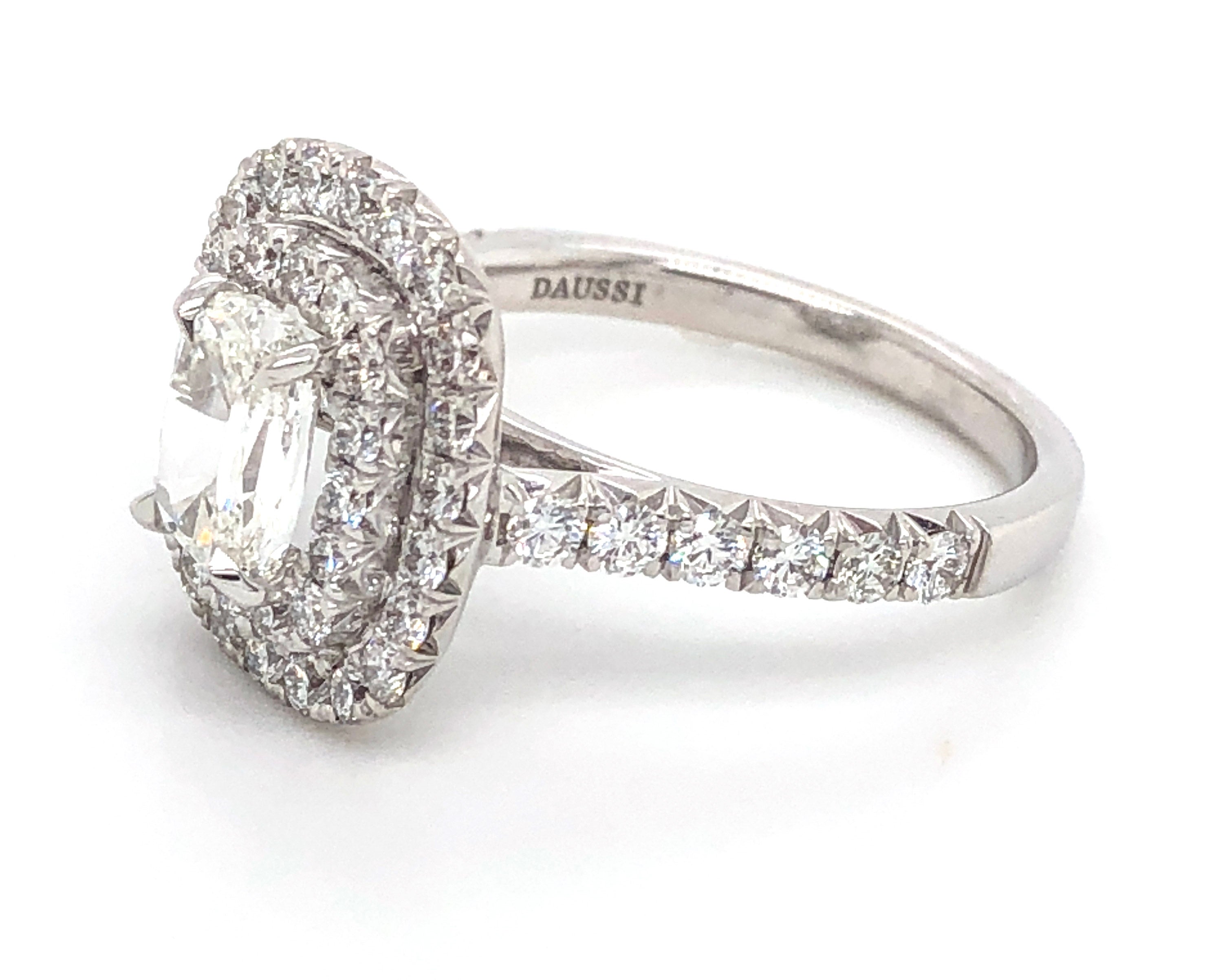 Henri Daussi diamond engagement ring featuring a double pave halo and totaling 1.99 carats. This ring comes with GIA certificate, signature cushion cut white diamond in the center surrounded by double halo. Metal: 18KT White Gold Cushion Center: 0.91 ct Color / Clarity: G / SI1 Double Halo: 1.08ct t.w. White round brilliant cut diamonds Certified: GIA