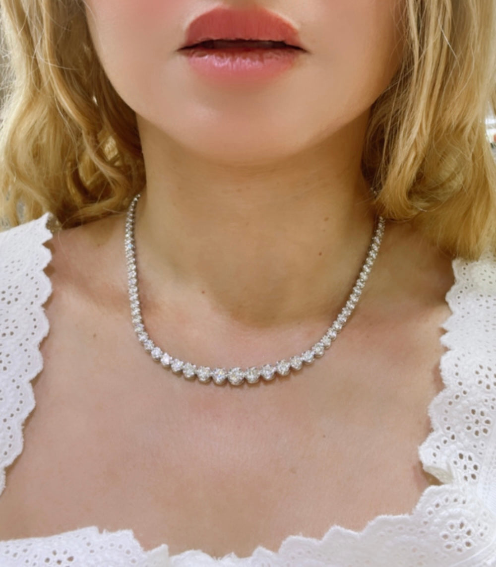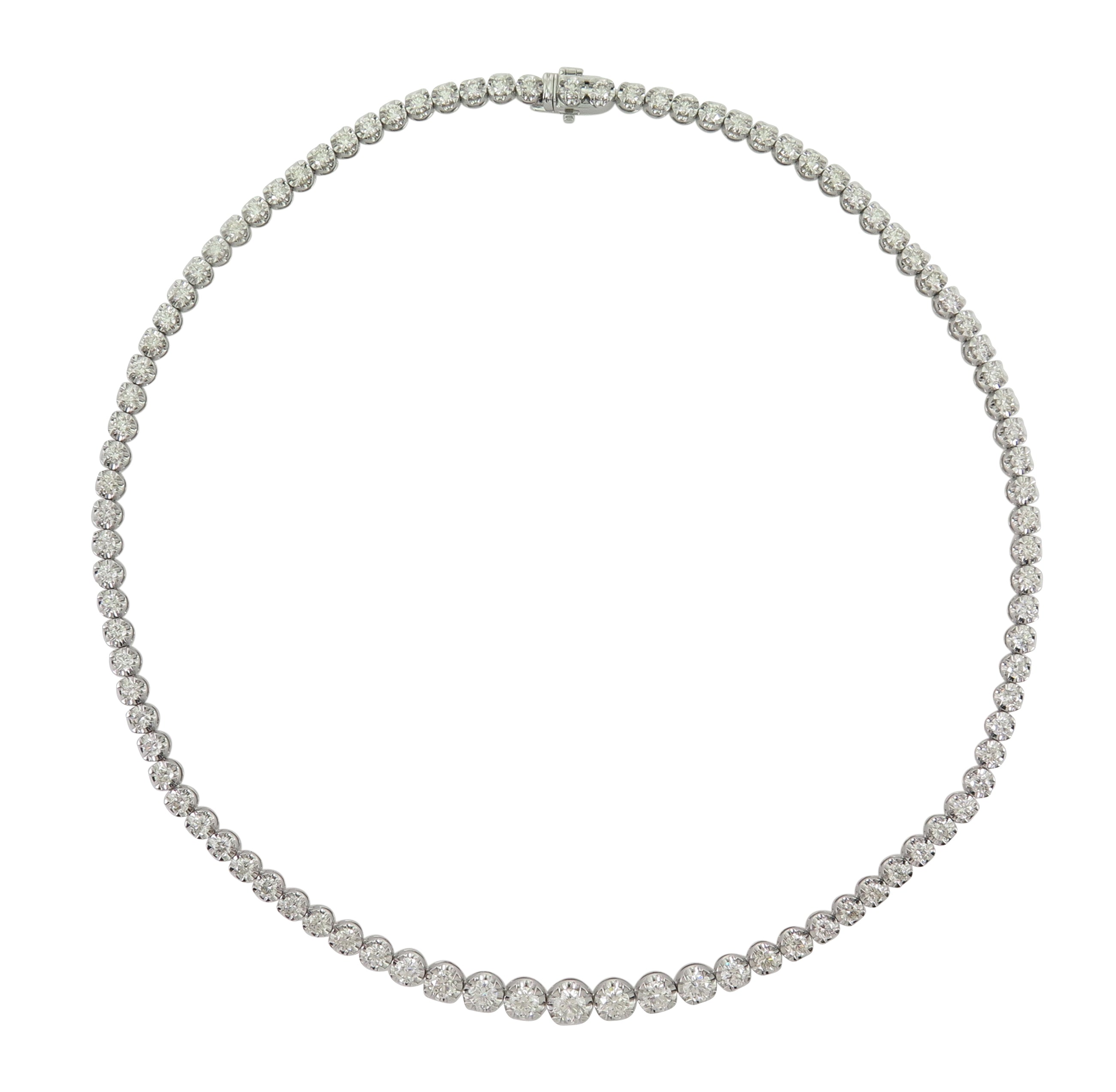 Elevate your style with our stunning 10.45ct tw diamond riviera line tennis statement necklace. This luxurious piece features sparkling diamonds set in a classic riviera line design for a bold and glamorous look. Perfect for any special occasions, this necklace is sure to make a dazzling statement and elevate any outfit.