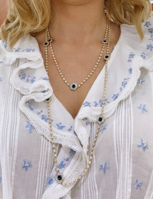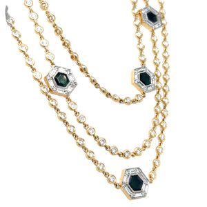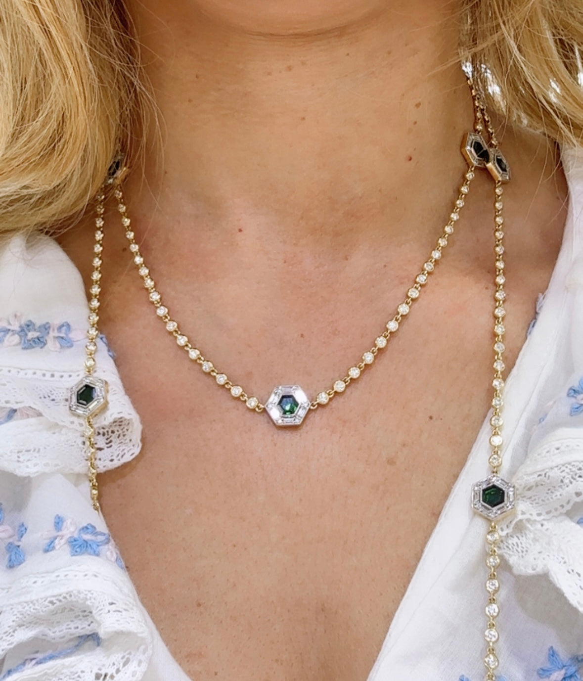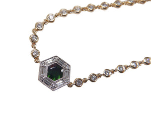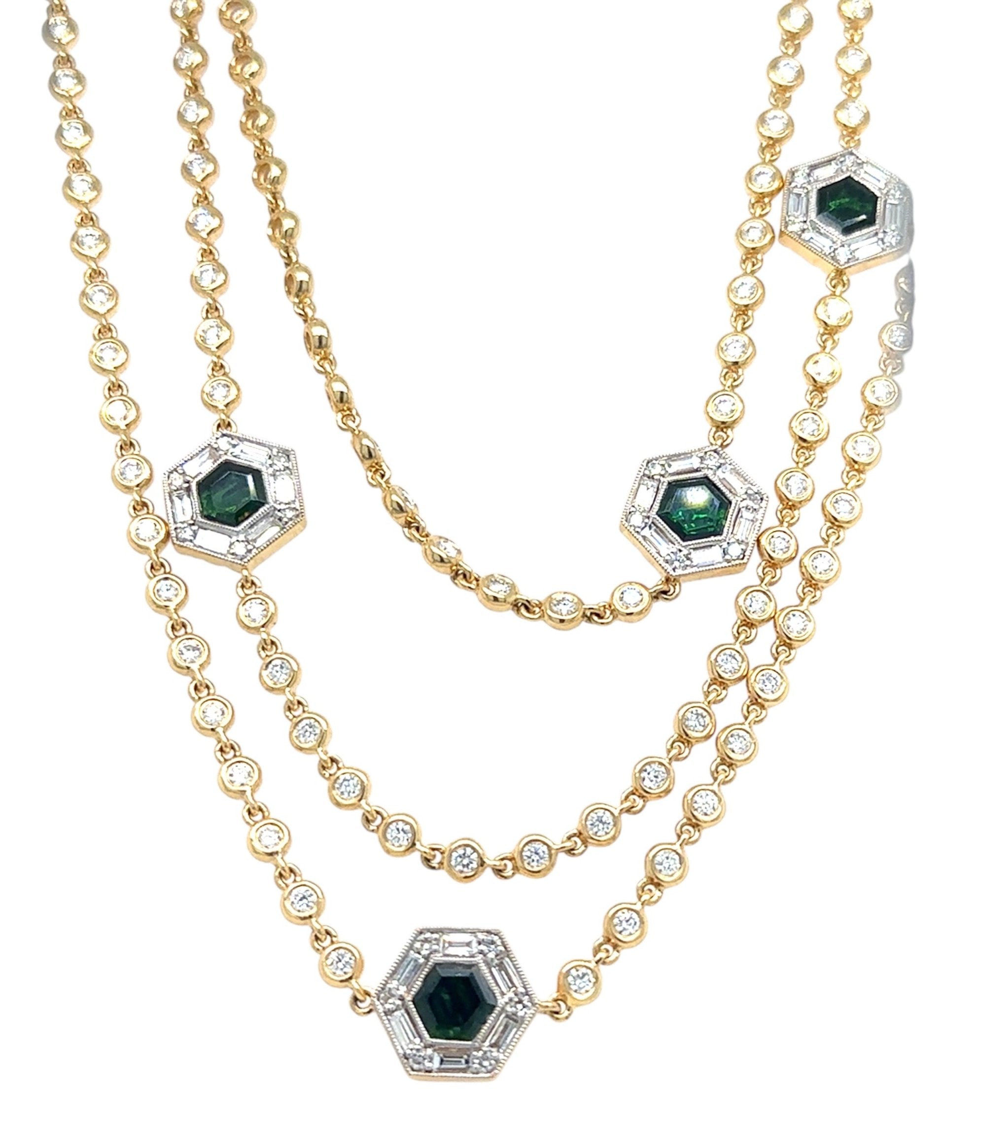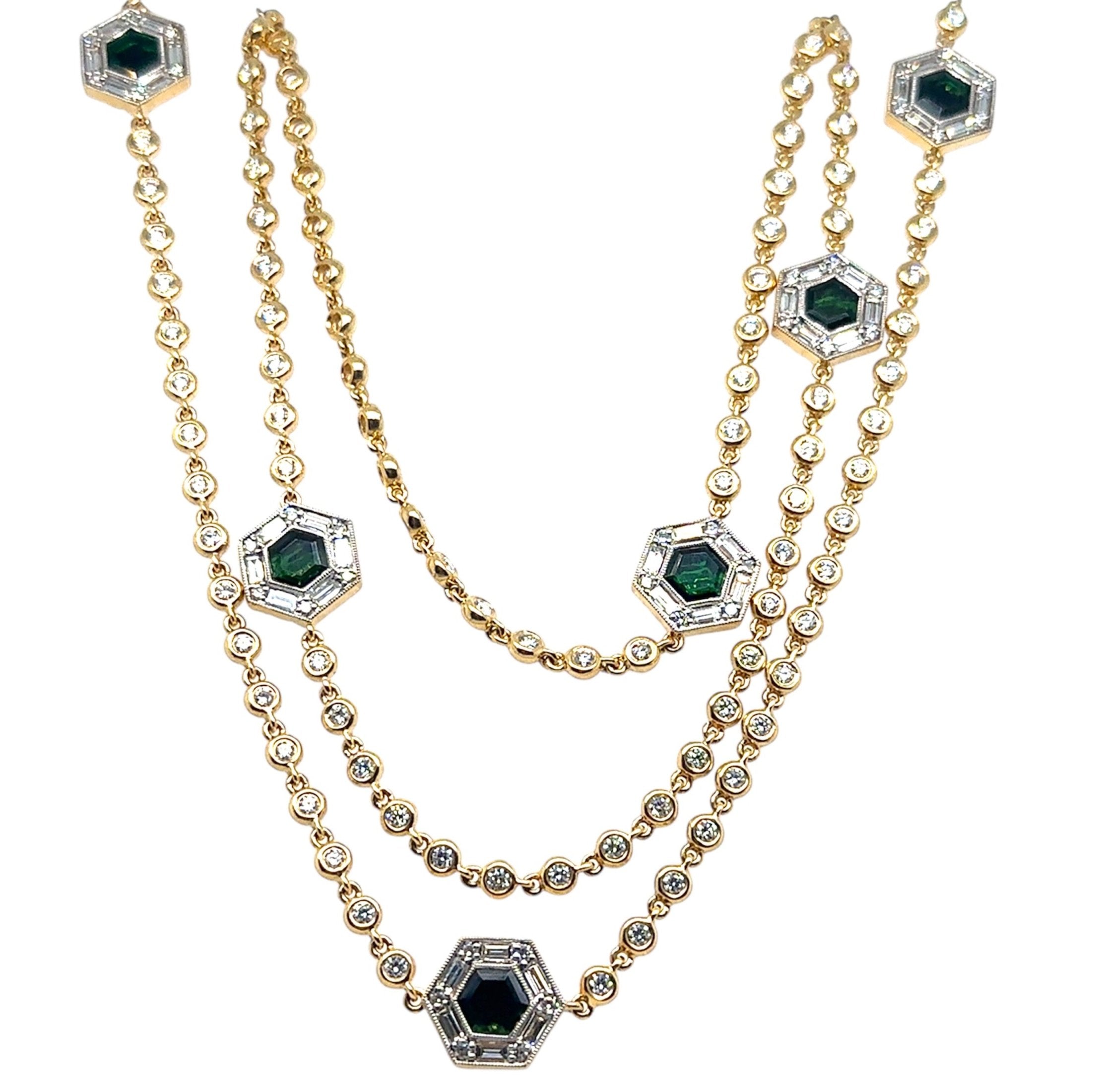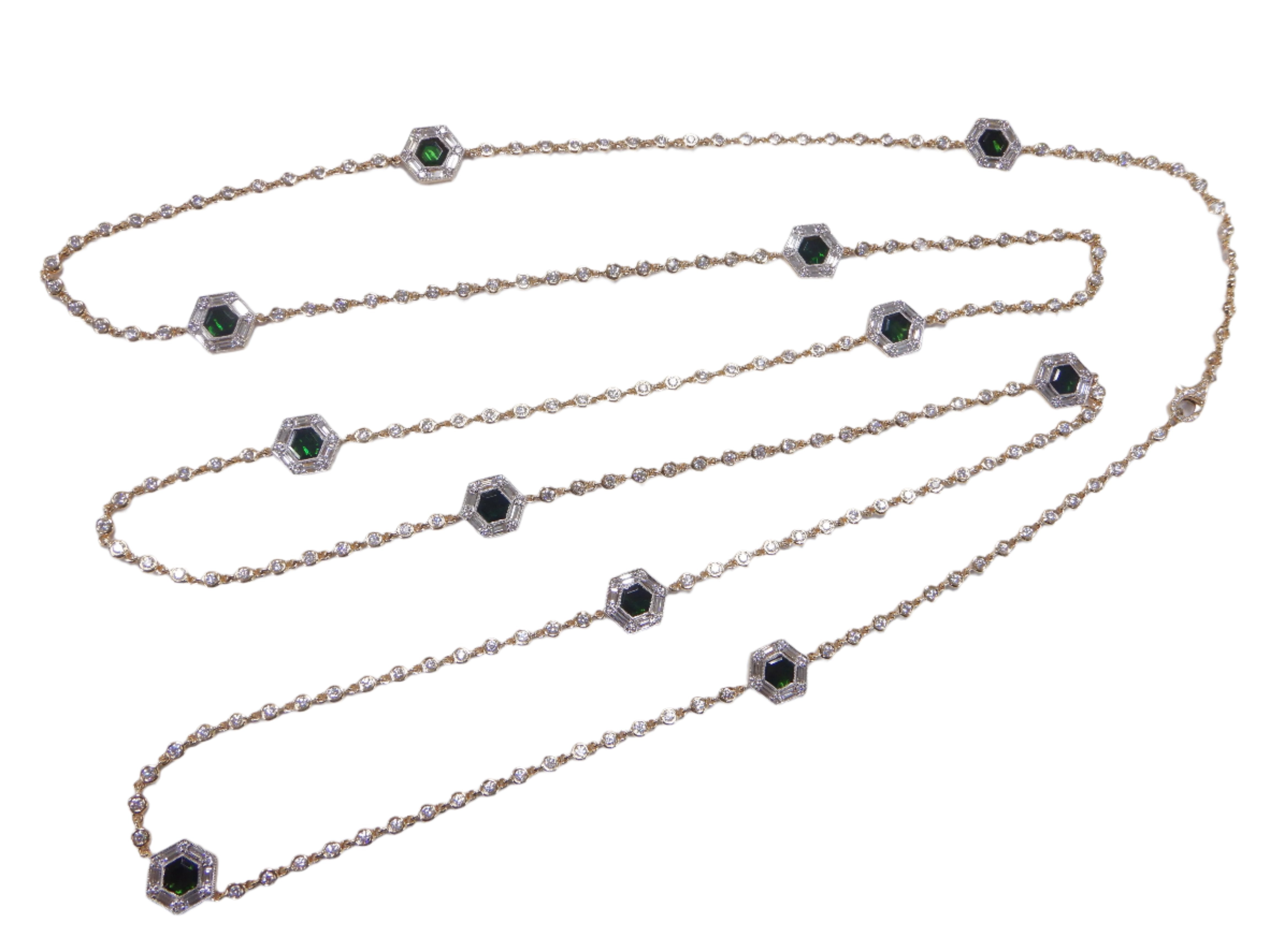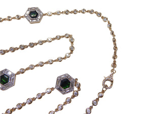 Experience luxury with our gold diamond by the yard necklace, featuring stunning 14.22ct tw diamonds and vibrant green tourmaline accents. Make a statement with this elegant and eye-catching piece, sure to turn heads and elevate any outfit. Add it to your collection for a touch of sophistication and glamour!