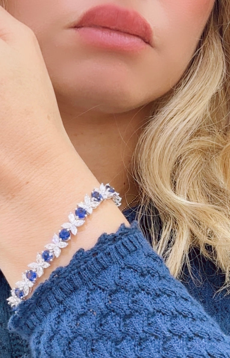 Splendid 14.40carats marquise-cut diamond & blue sapphire bracelet will make her shine with glory once you put it on her wrist. Absolutely gorgeous setting and with marquise- cut diamonds and round shape royal blue sapphires will sit comfortably on her wrist without ever breaking.