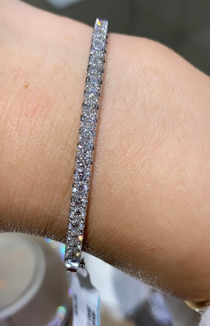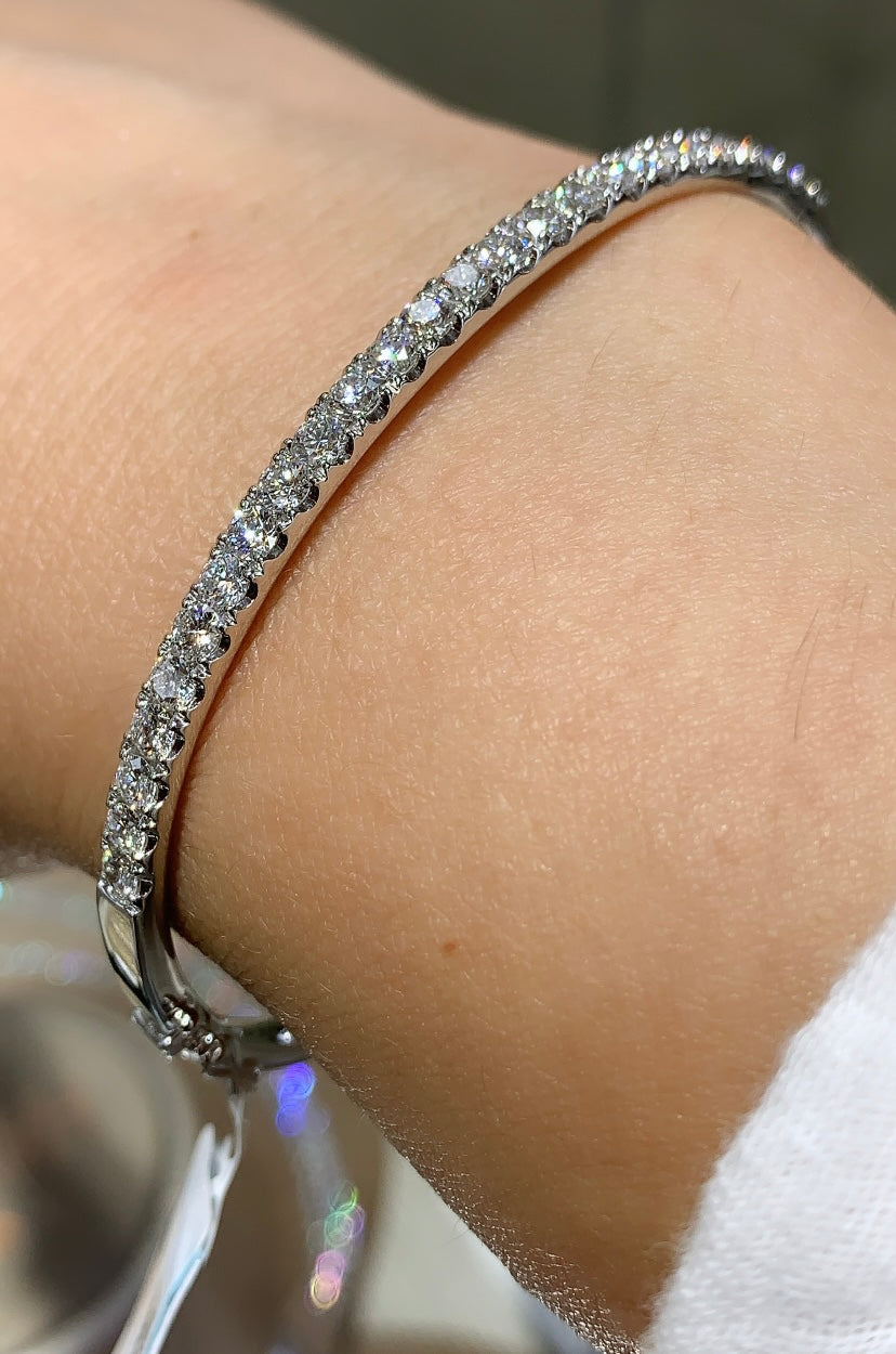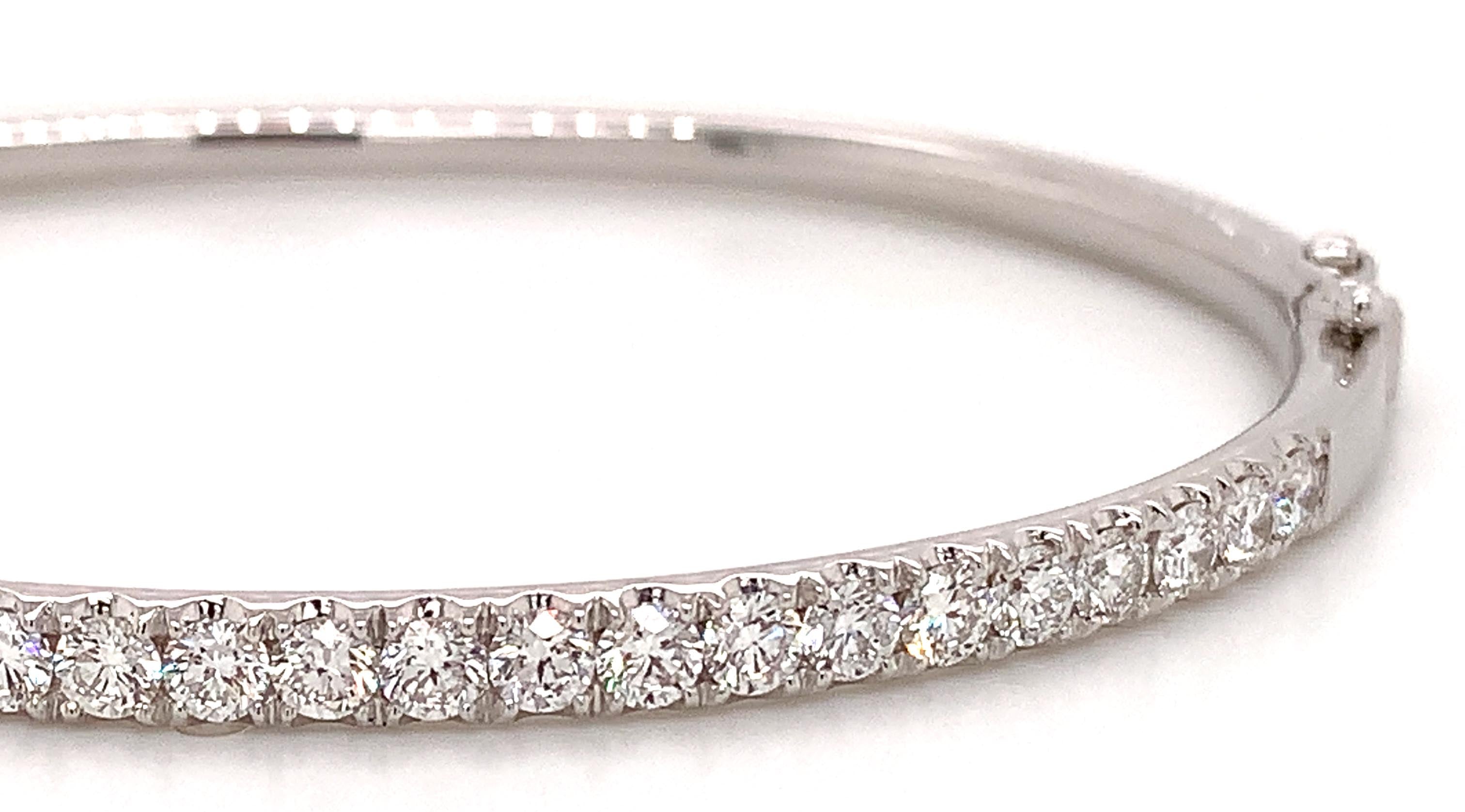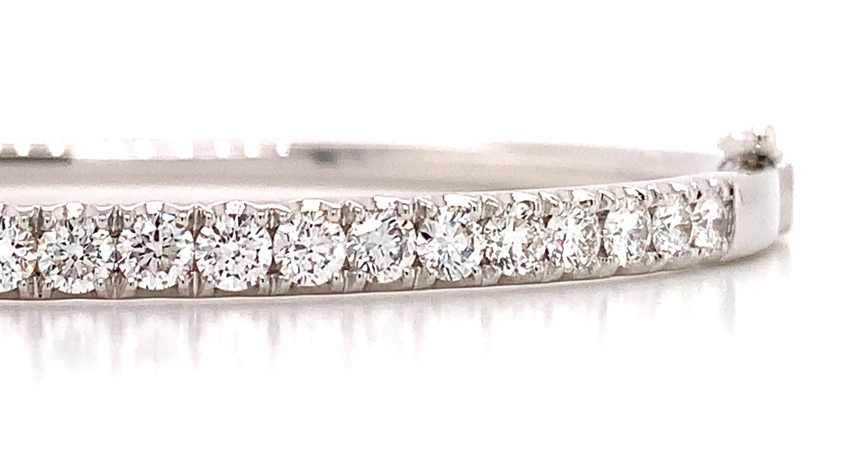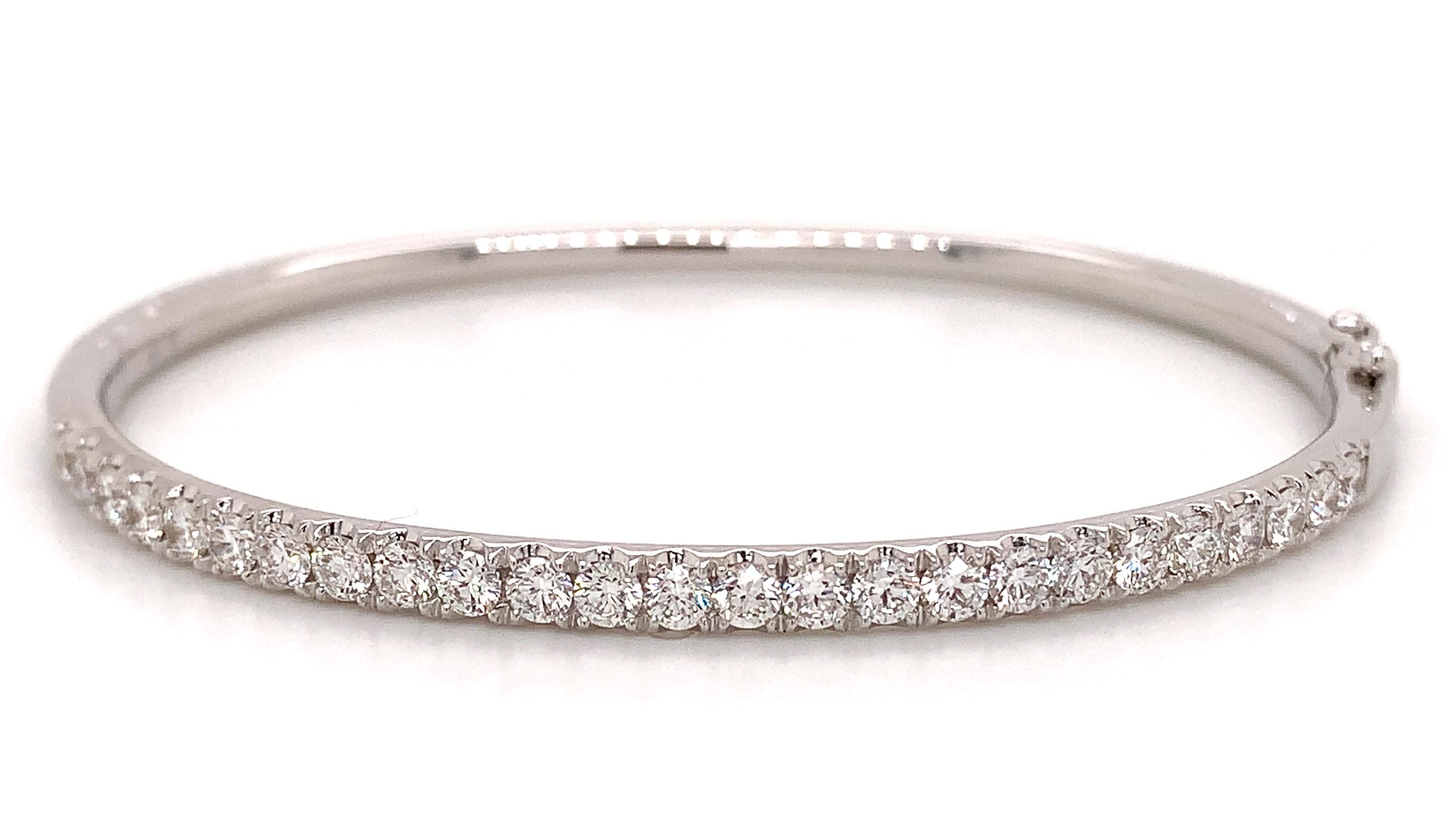 Bangles are great for stacking, but with this bold and beautiful diamond bangle bracelet, you only need one! This 18kt white gold bracelet is covered in 25 large round diamonds...