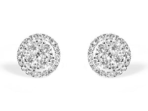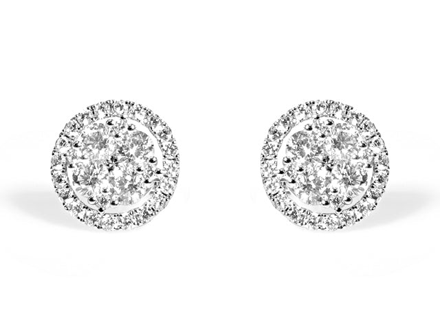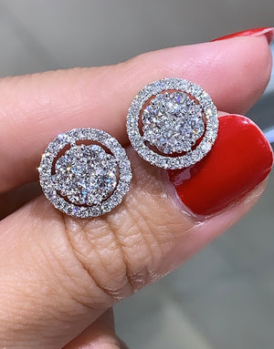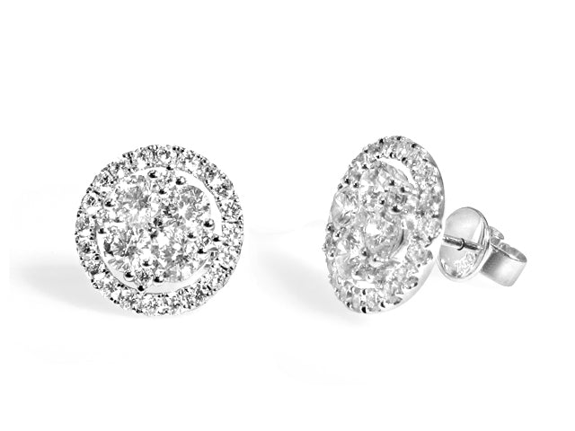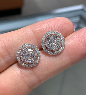Cluster diamond stud earrings proves the age old saying "Diamonds are a girls best friend". Each elegant round cut pave set stud earring set with 58 round diamonds, totaling 2.14 carats of delicious pleasure. Crafted in genuine 18kt white gold.