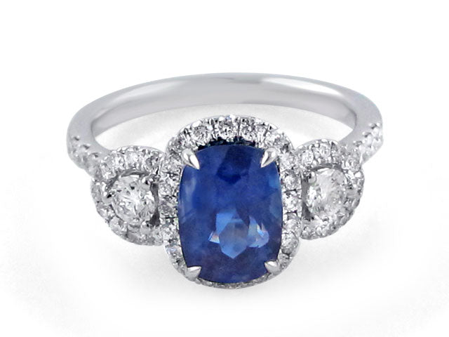 Dazzle everyone around you whenever you are wearing this mesmerizing sapphire and diamond ring. It looks so royal, and that is exactly what you will feel whenever you slip it on. This ring is made up of white gold that has been polished to perfection. The main stone is royal blue color and weighs 2.30 carats with (2) side diamonds 0.22ct t.w., (48) 0.45ct t.w. round diamonds around it this ring will take your breath away when you see it in person.