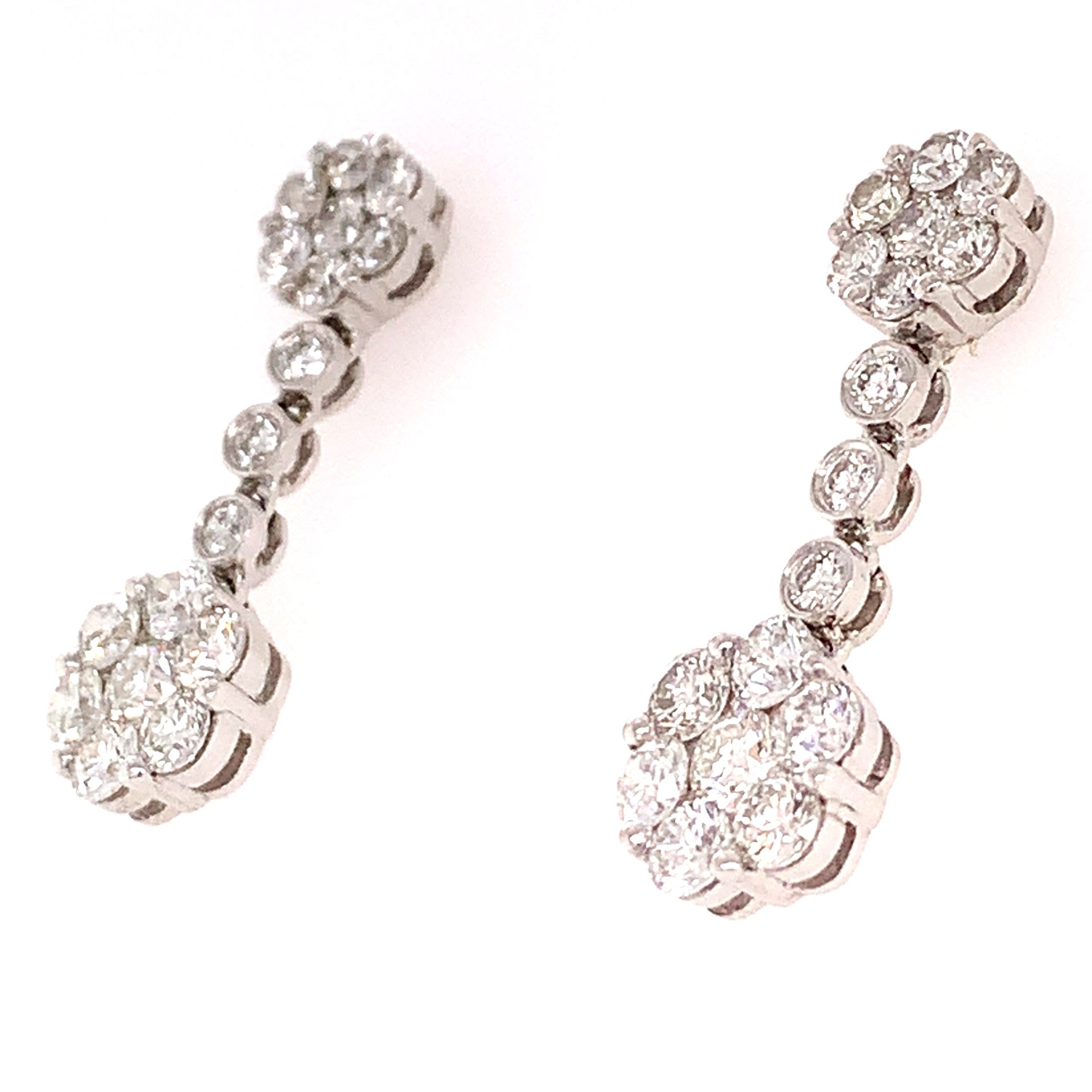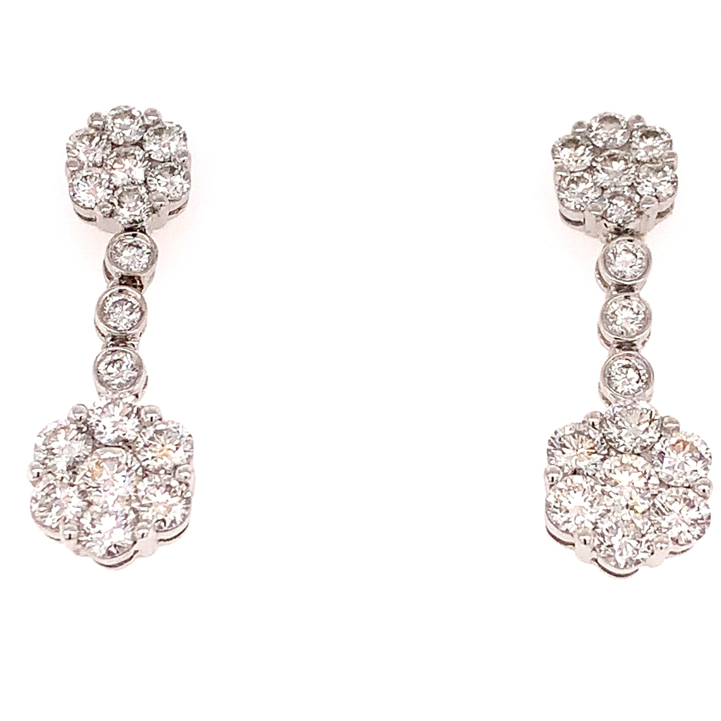 These gorgeous diamond flower earrings are a must-have for your jewelry box. They are beautifully glimmer with every move that you make. Metal: 18K White Gold Diamond Shape: Round Brilliant Cut Round Diamonds Weight: 2.30ct tw Setting: Prong, Pave Backing: Push Backs