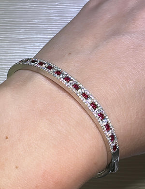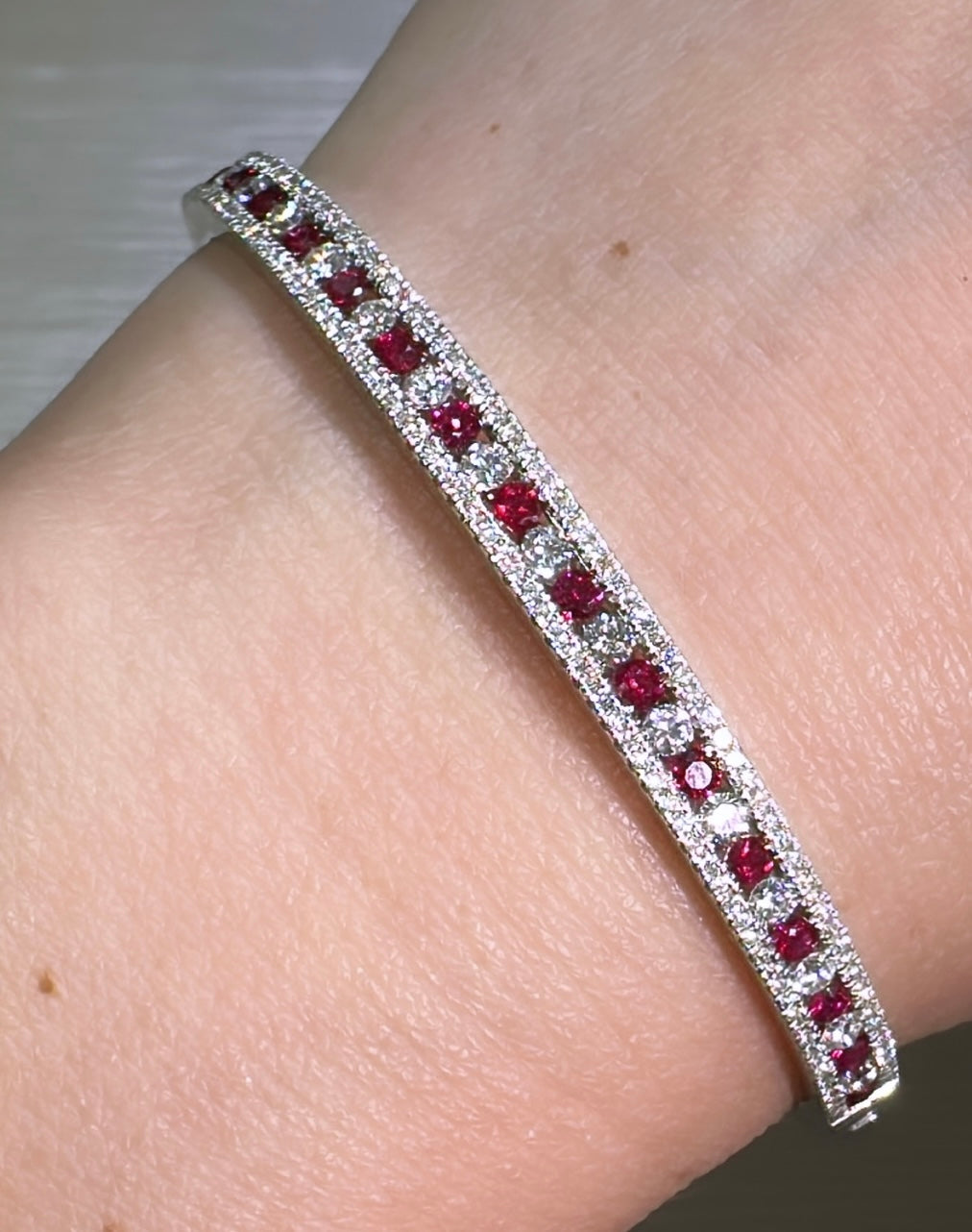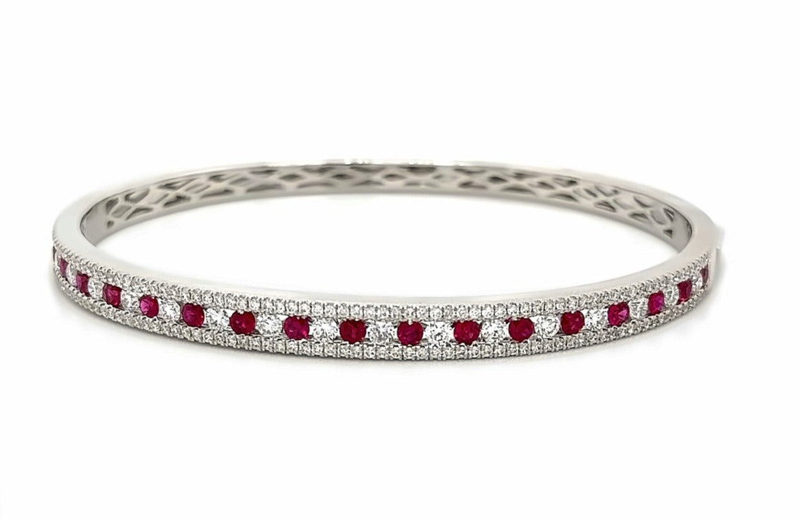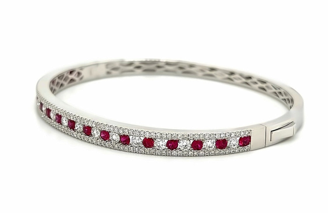 This luxurious 2.56ct tw ruby & diamond white gold bangle bracelet is a stunning piece of artistry. Expertly set in 18K white gold, it features a dazzling diamond and ruby combination that will add lustrous elegance to any ensemble. Adorn yourself with this highly exclusive and sophisticated bracelet for a timelessly chic look. Metal: 18K White Gold Ruby Weight: (18) 1.07ct tw Diamond Shape , Weight: (173) Round Brilliant Cuts 1.49ct tw Bangle/Wrist Width: 58mm x 48mm Bangle Weight: 5mm