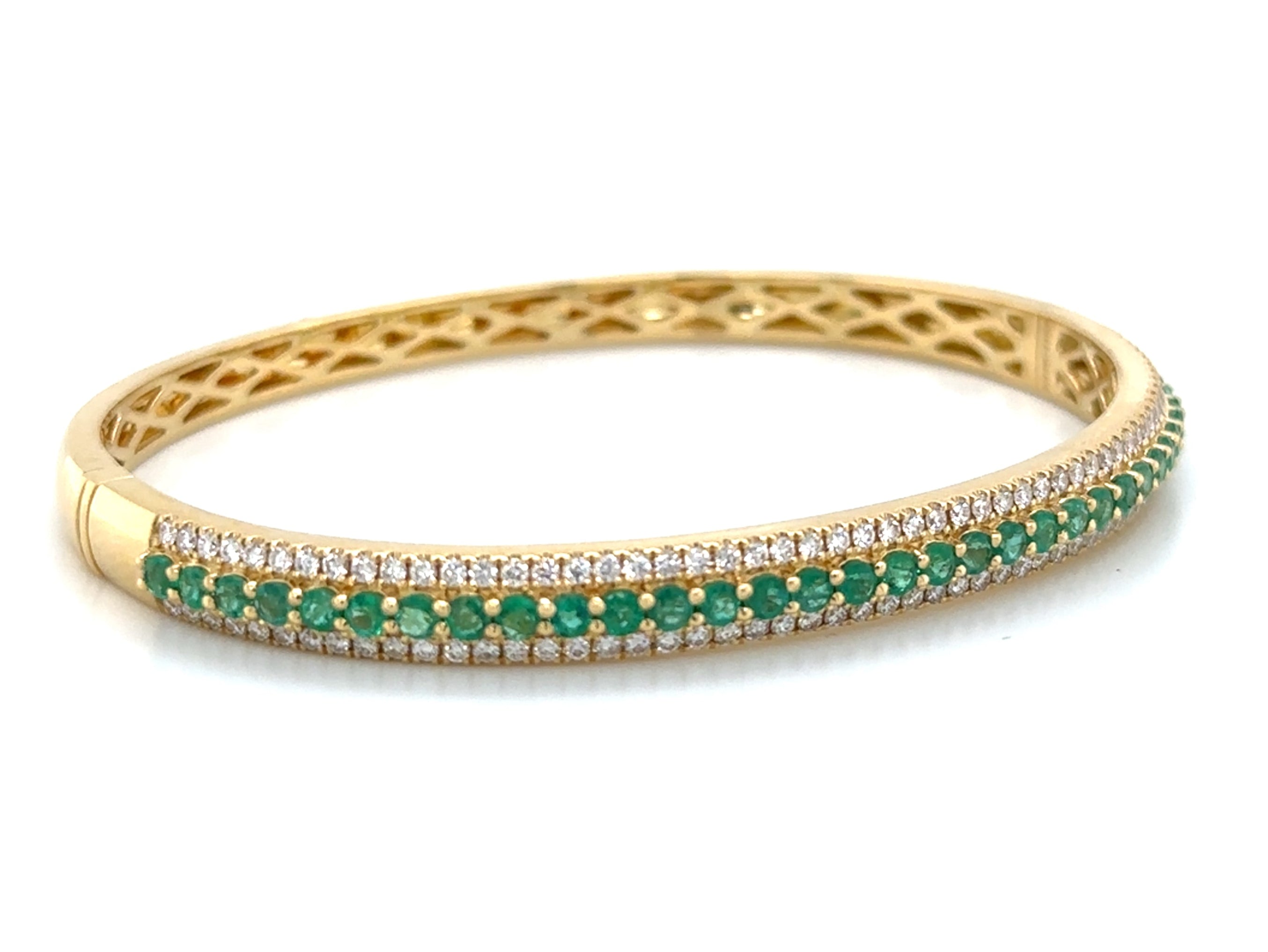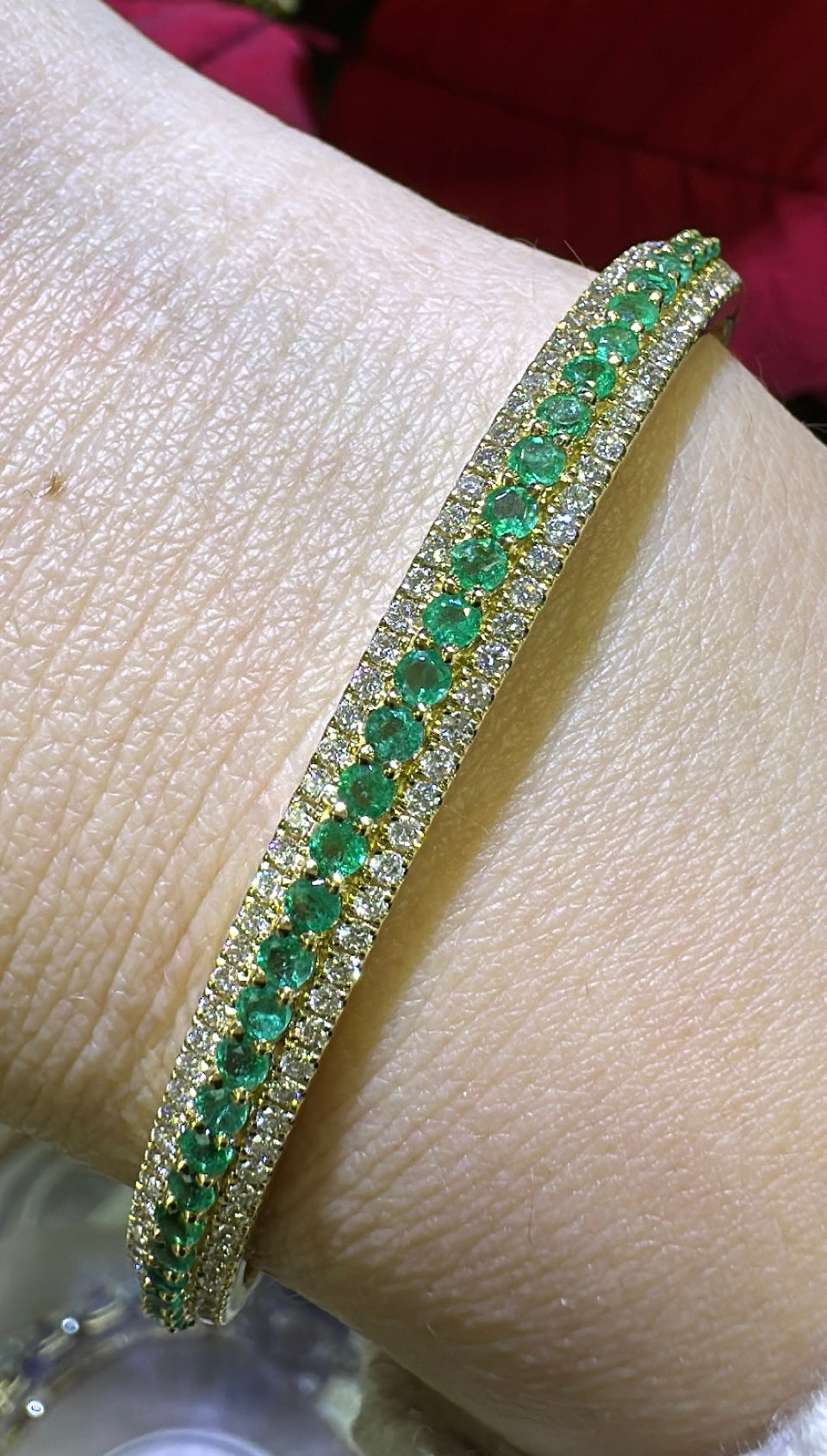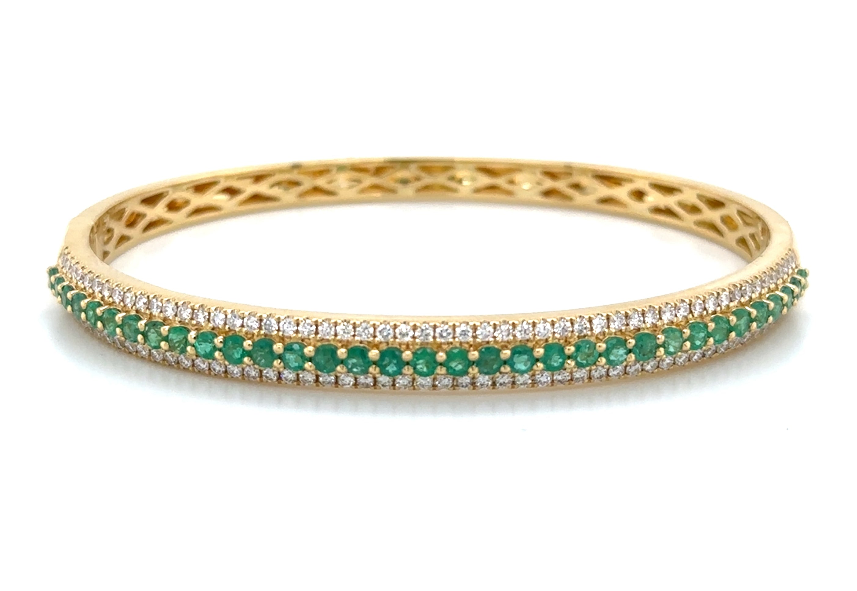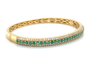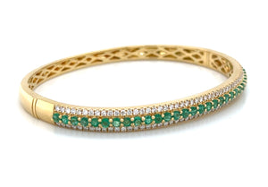 Dazzling and luxurious, our 2.59ct t.w. round brilliant cut diamond and emerald bangle bracelet is a true statement piece. The stunning combination of diamonds and emeralds will elevate any outfit, making you feel confident and glamorous. Indulge in the timeless elegance and undeniable beauty of this exquisite bangle bracelet.