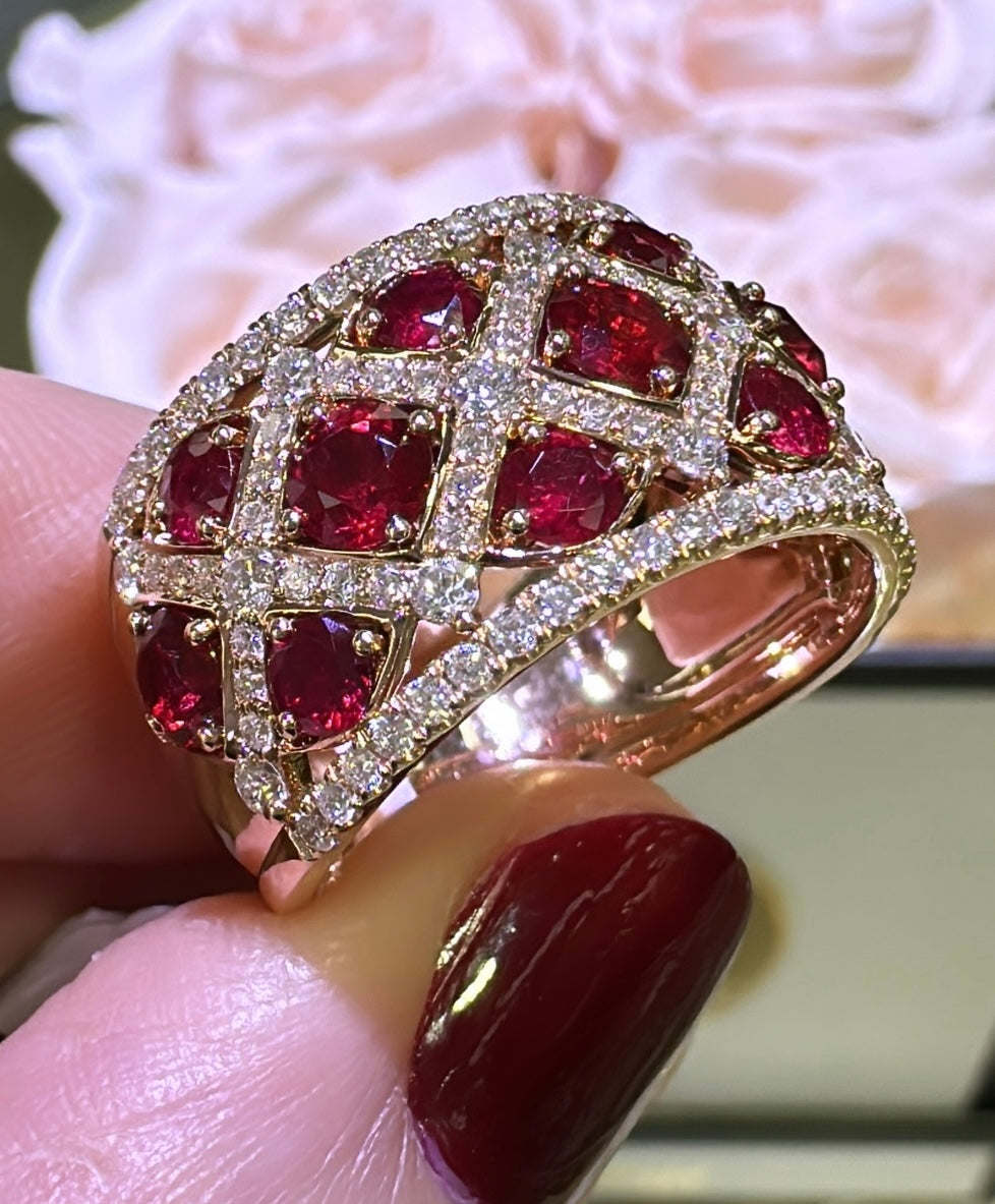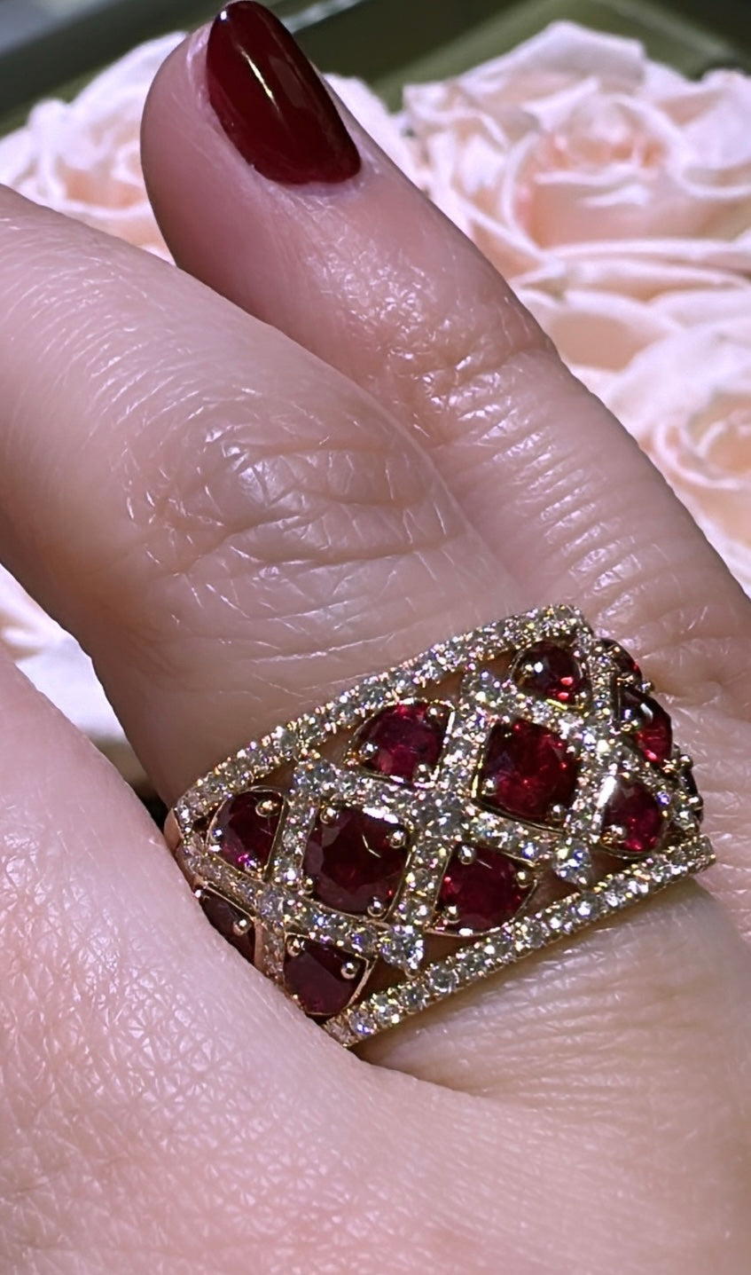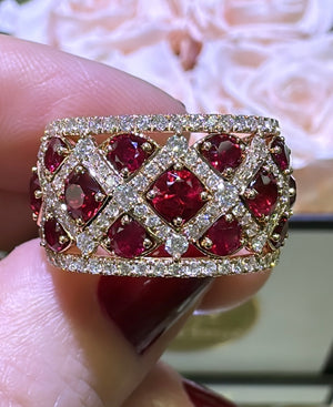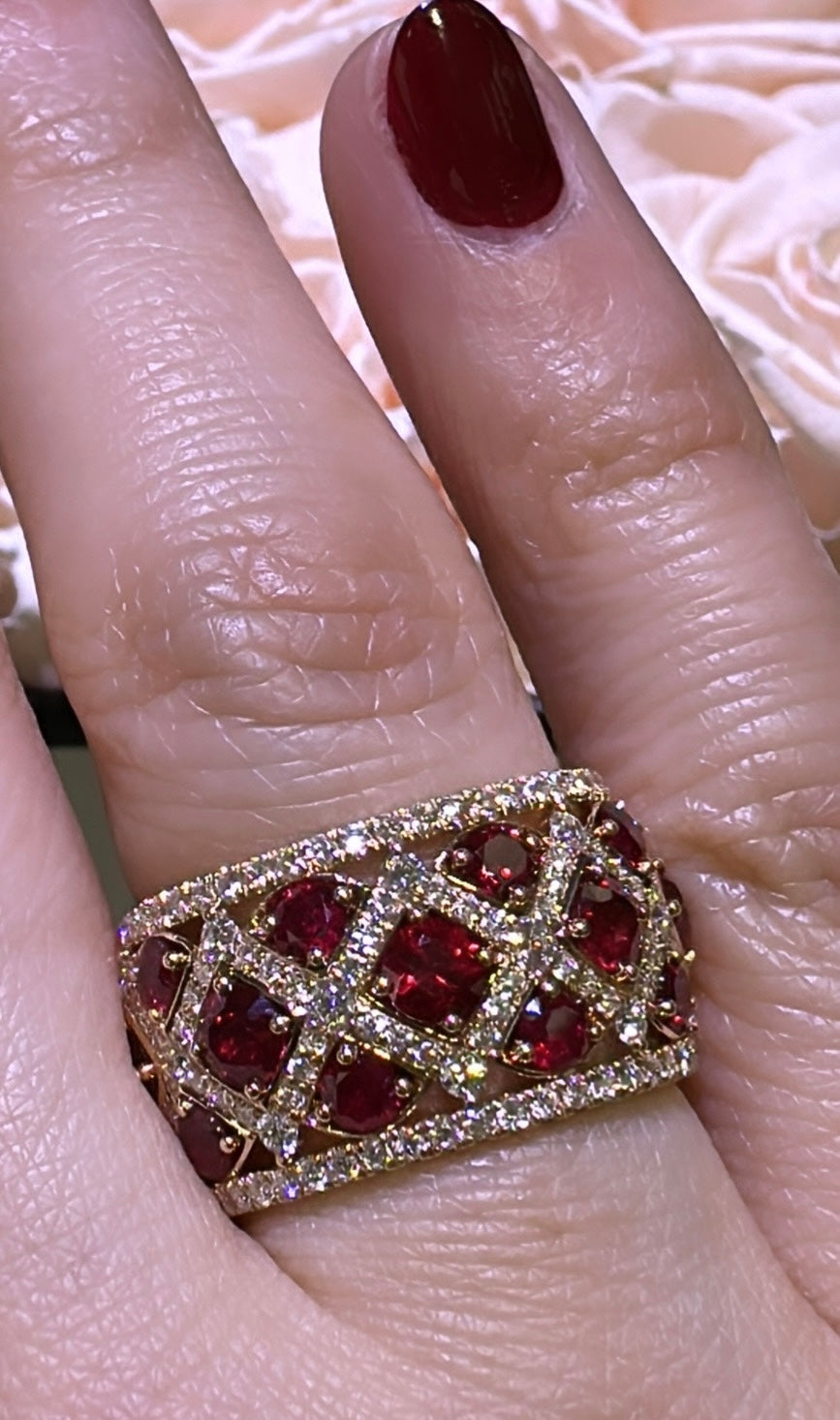 Experience luxury and elegance with our 2.91carat ruby and white diamond cocktail ring. This exquisite ring features vibrant rubies and sparkling white diamonds, adding a touch of glamour to any outfit. Perfect for special occasions or as a statement piece, this ring is sure to turn heads and impress.