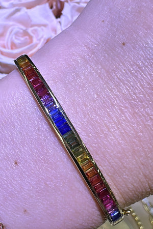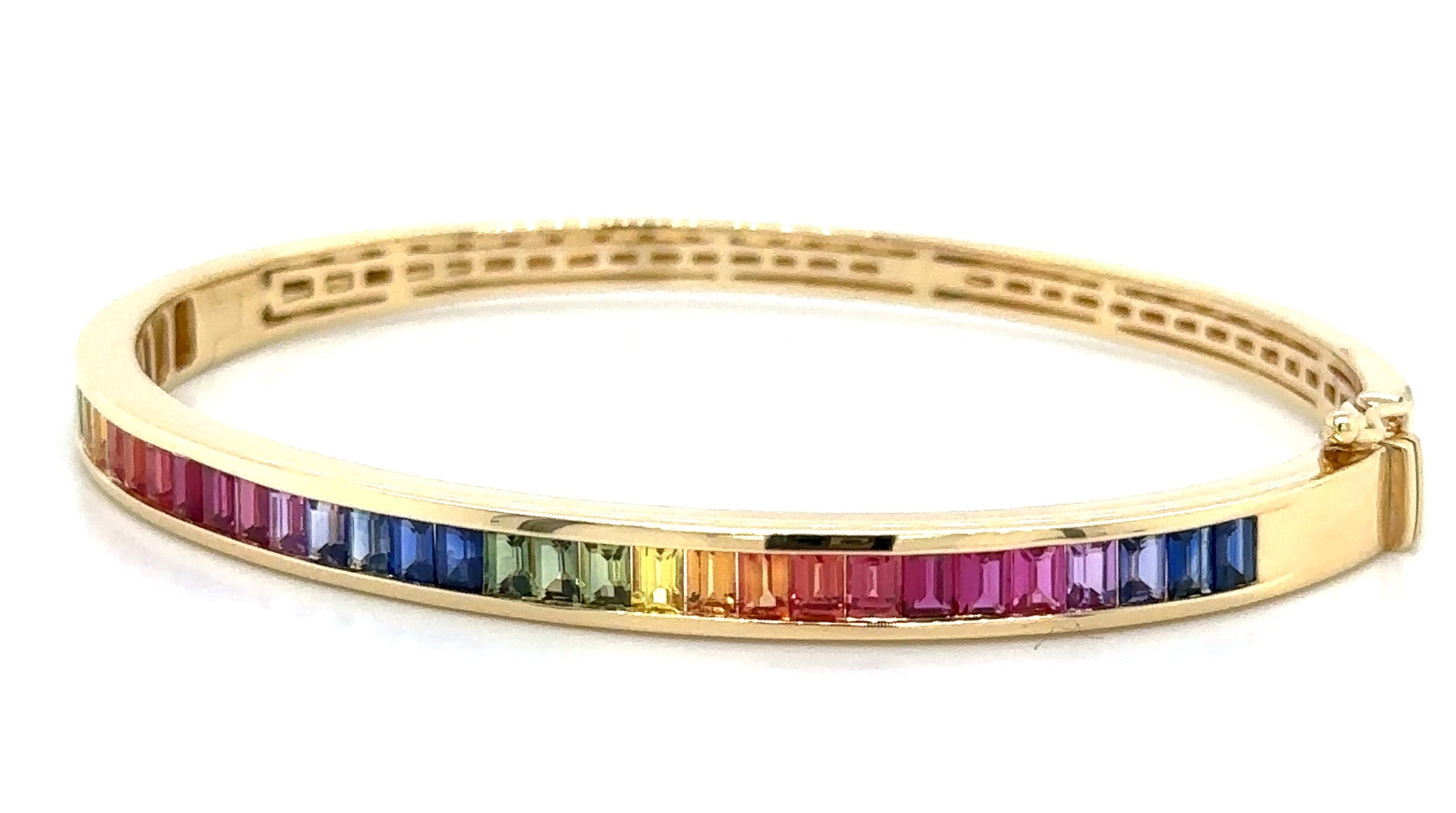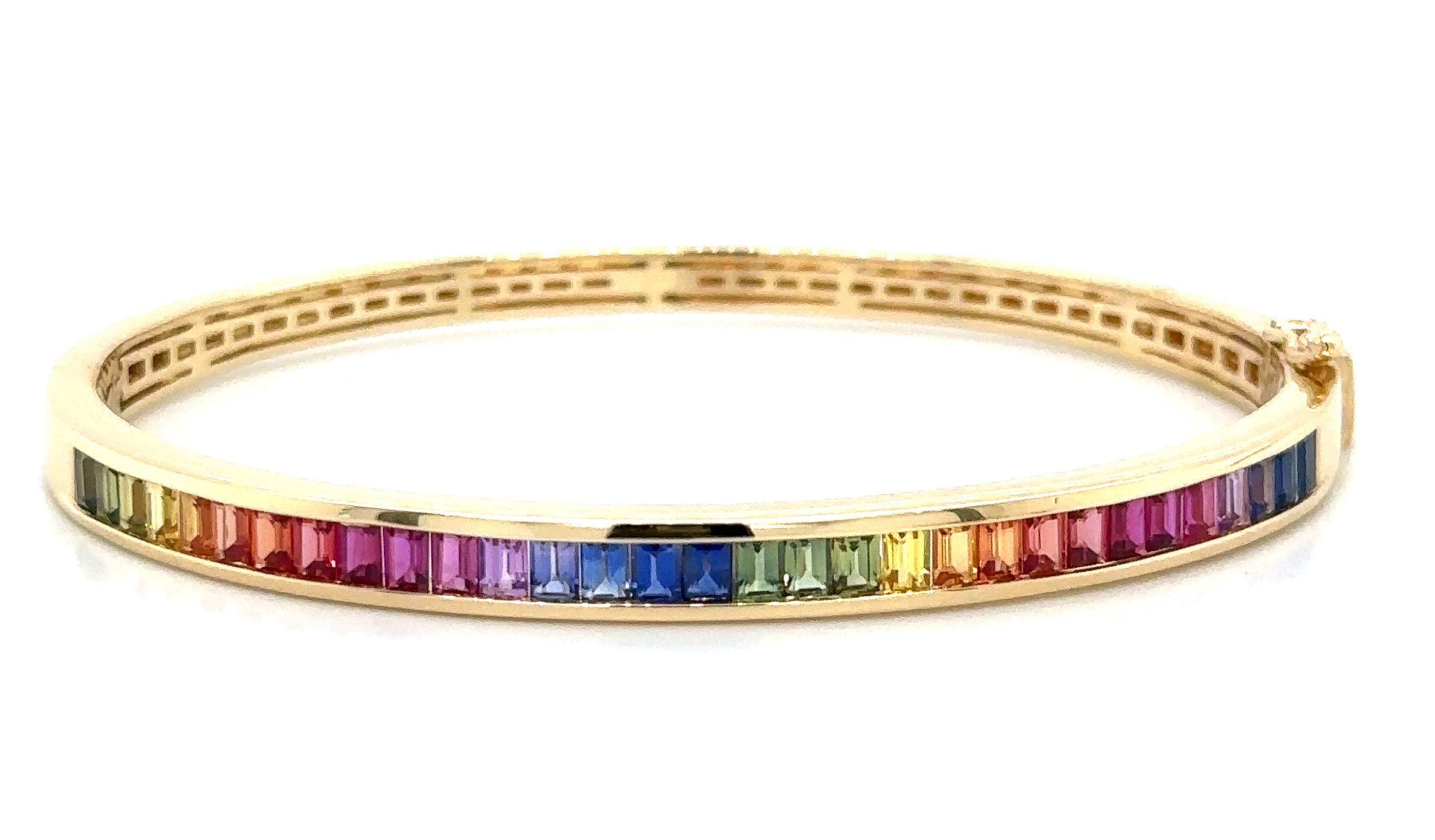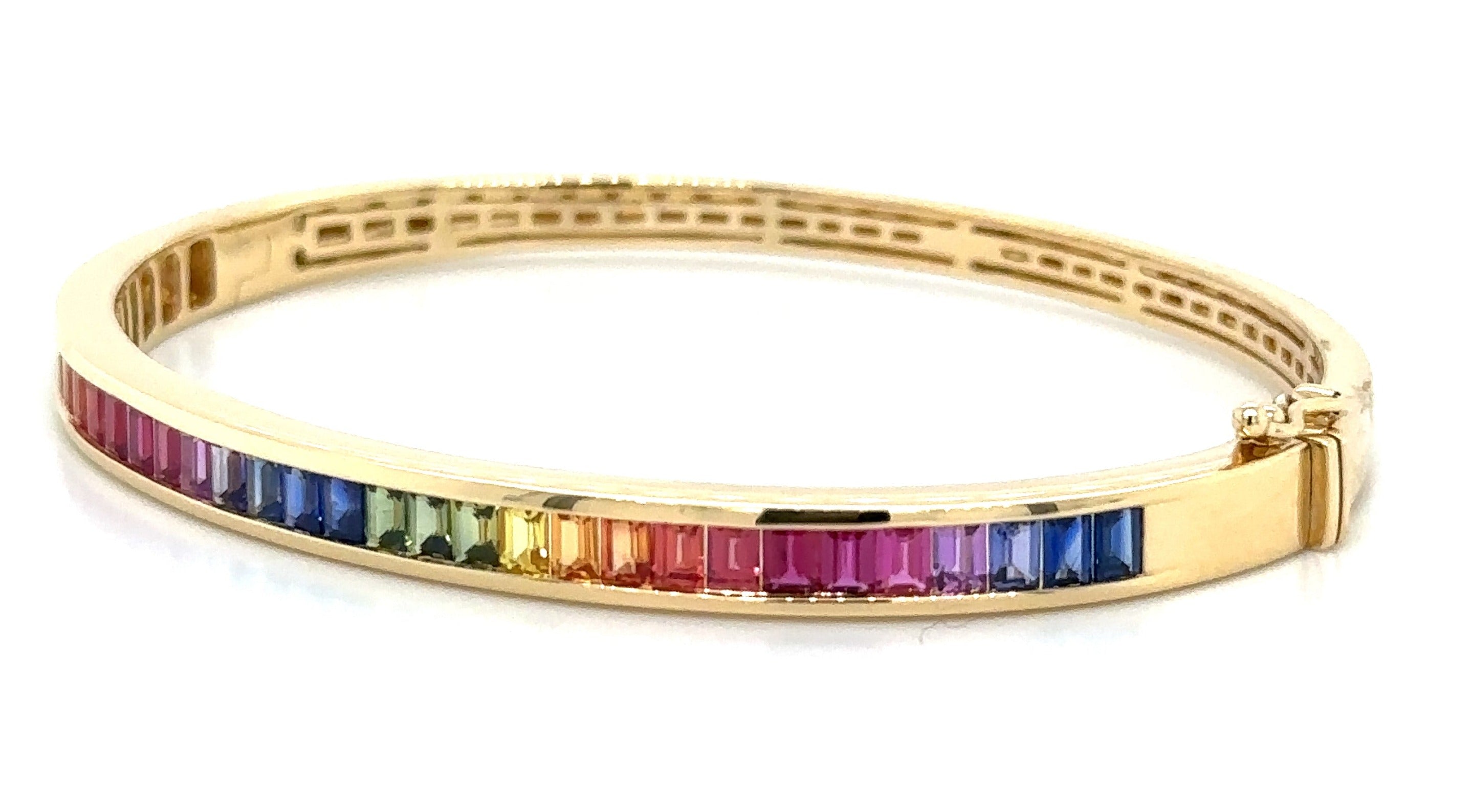 Sparkle and shine with our 3.00 carat fancy color rainbow sapphire bangle bracelet. This stunning piece features a vibrant rainbow of sapphires on a sleek bangle, creating a unique and eye-catching look. Add a touch of color and elegance to any outfit. Elevate your style with this must-have bracelet!