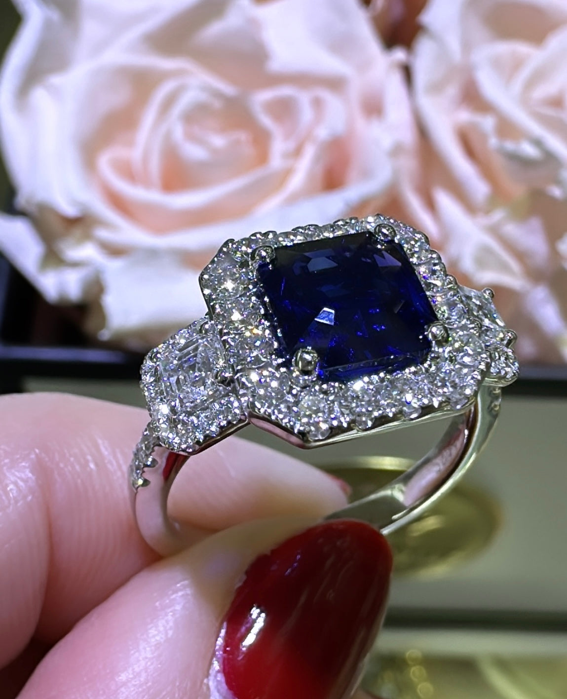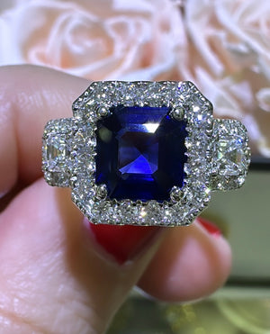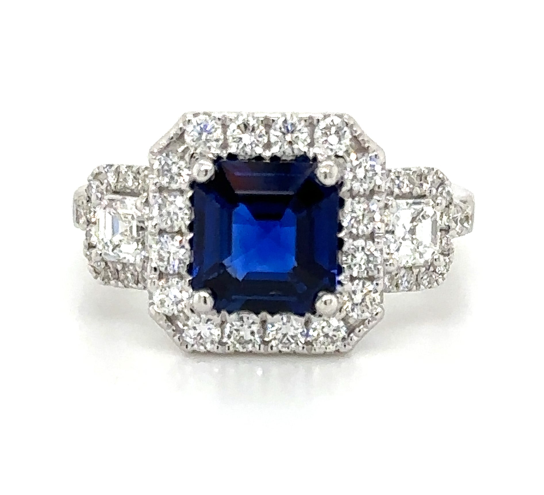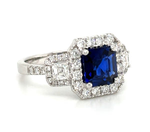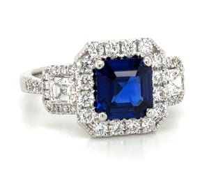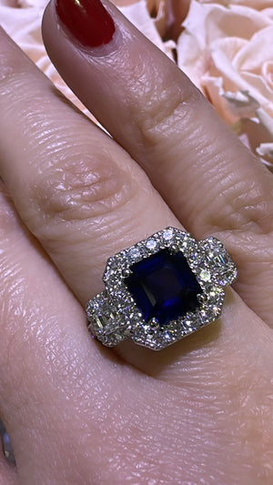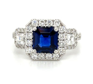 Experience pure elegance with our 3.03ct tw sapphire emerald-cut diamond ring. Beautifully crafted with a stunning emerald-cut sapphire and diamonds, this ring exudes luxury and sophistication. Perfect for any special occasion or as an unforgettable gift. Add a touch of glamour to your jewelry collection today!