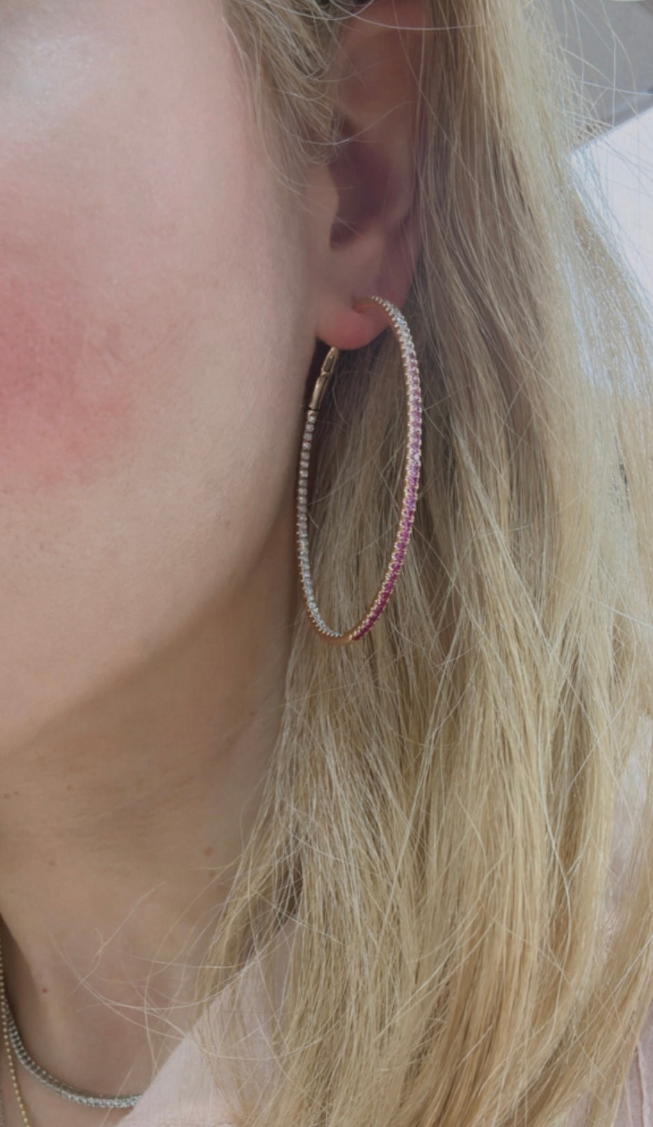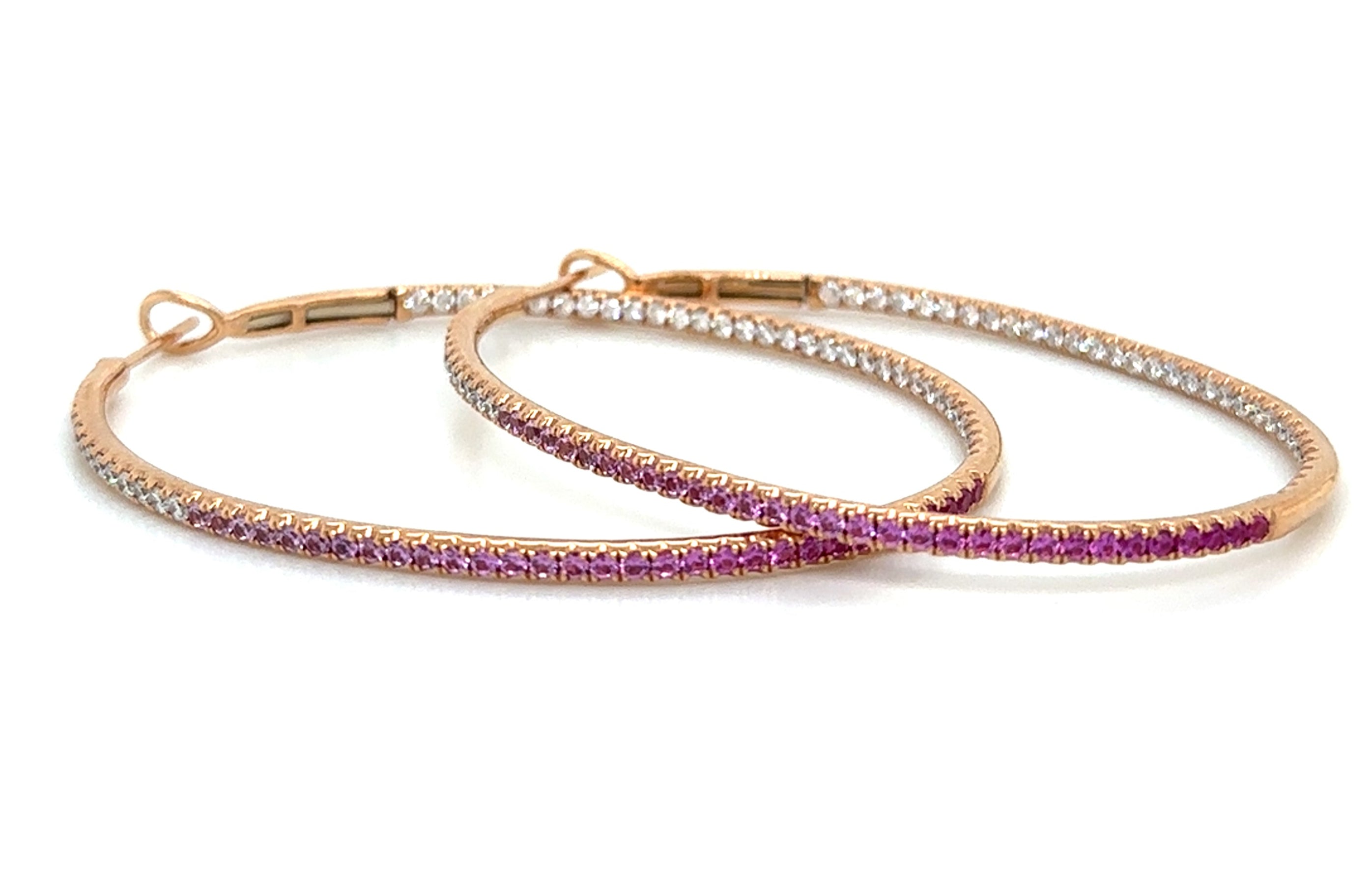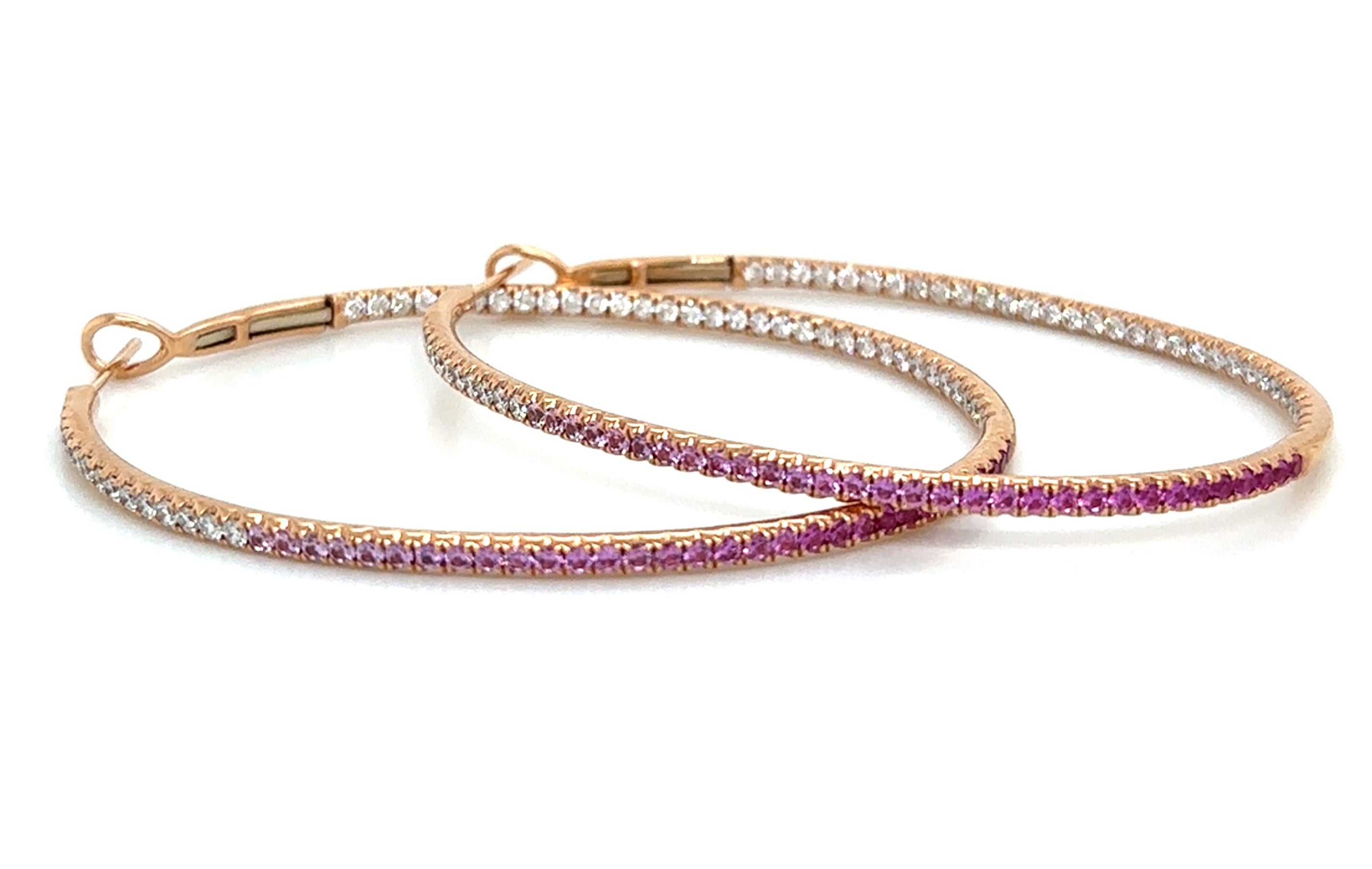 Take your jewelry collection to the next level with our stunning 3.06ct tw pink sapphire & inside-out diamond gold hoop earrings! These luxurious earrings feature a dazzling combination of pink sapphires and diamonds, set in a classic gold hoop design. Elevate any outfit and express your unique style with these exquisite earrings!