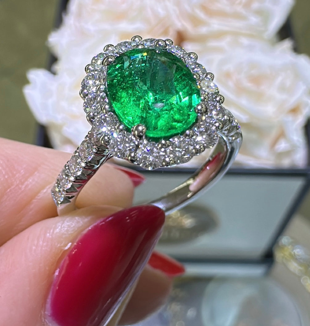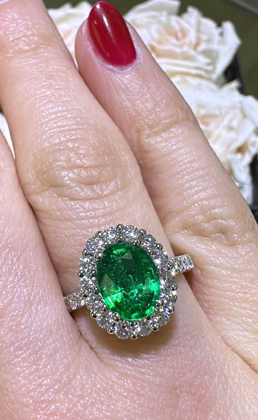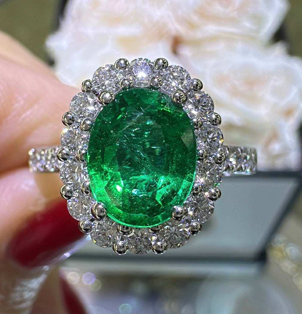 Elevate your elegance with this stunning 3.08-carat green emerald ring, beautifully complemented by sparkling diamonds. The vibrant emerald centerpiece captures attention with its rich color, while the surrounding diamonds add a brilliant shimmer, making it perfect for special occasions or everyday luxury.