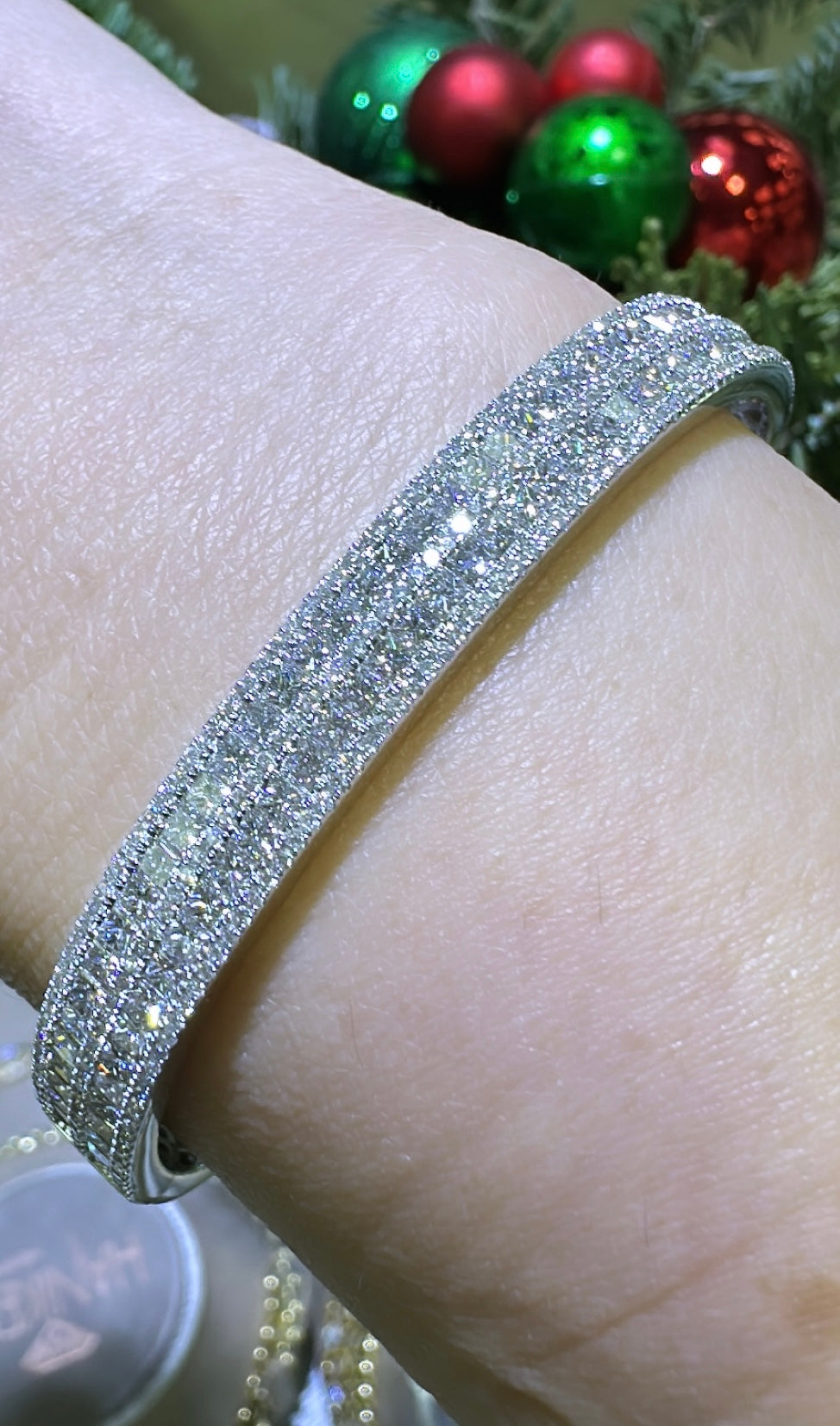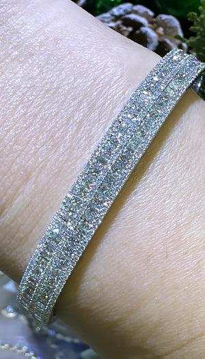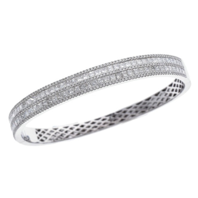 Elevate your style with our 4.37ct tw princess-cut double row diamond gold bangle bracelet. This elegant piece features a dazzling display of sparkling princess-cut diamonds set in a double row for maximum impact. Made with high-quality 18K gold, this bracelet exudes luxury and sophistication. Elevate any outfit with this stunning and timeless accessory.