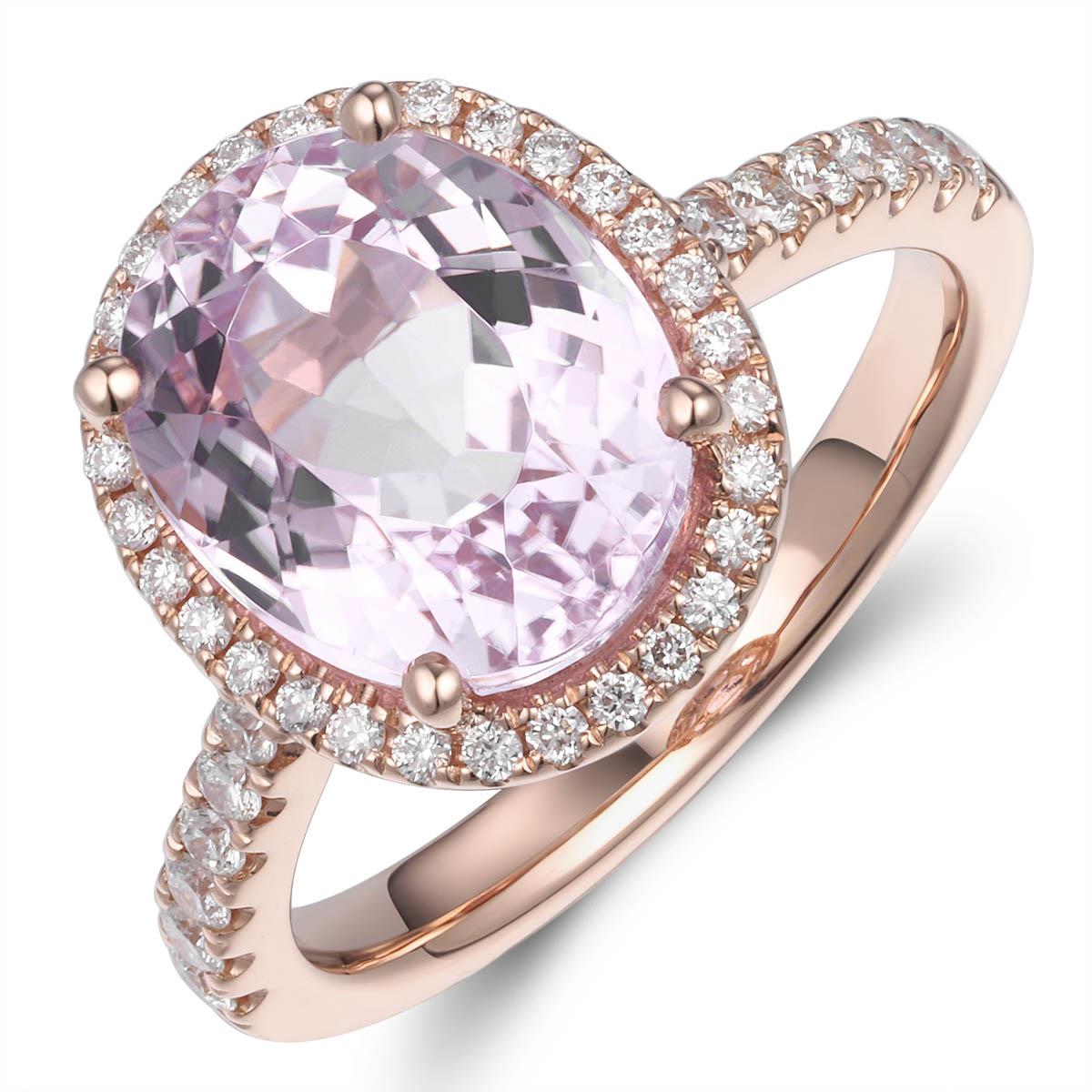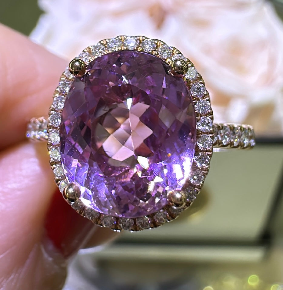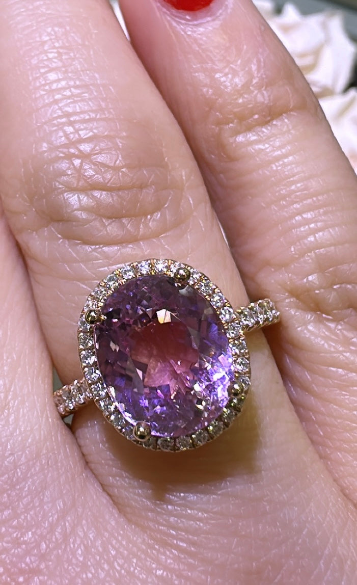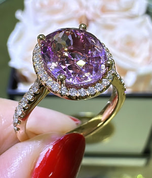 Indulge in luxury and elegance with our 5.39carat kunzit & diamond cocktail ring. This stunning piece features a glittering 5.39carat Kunzit gemstone, known for its calming energy and delicate pink hue. Accented with sparkling diamonds, this ring is sure to make a statement and elevate any outfit. Treat yourself or a loved one to the beauty and benefits of this unique and rare gemstone.