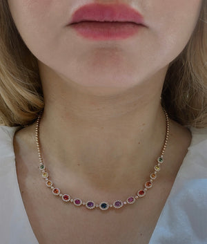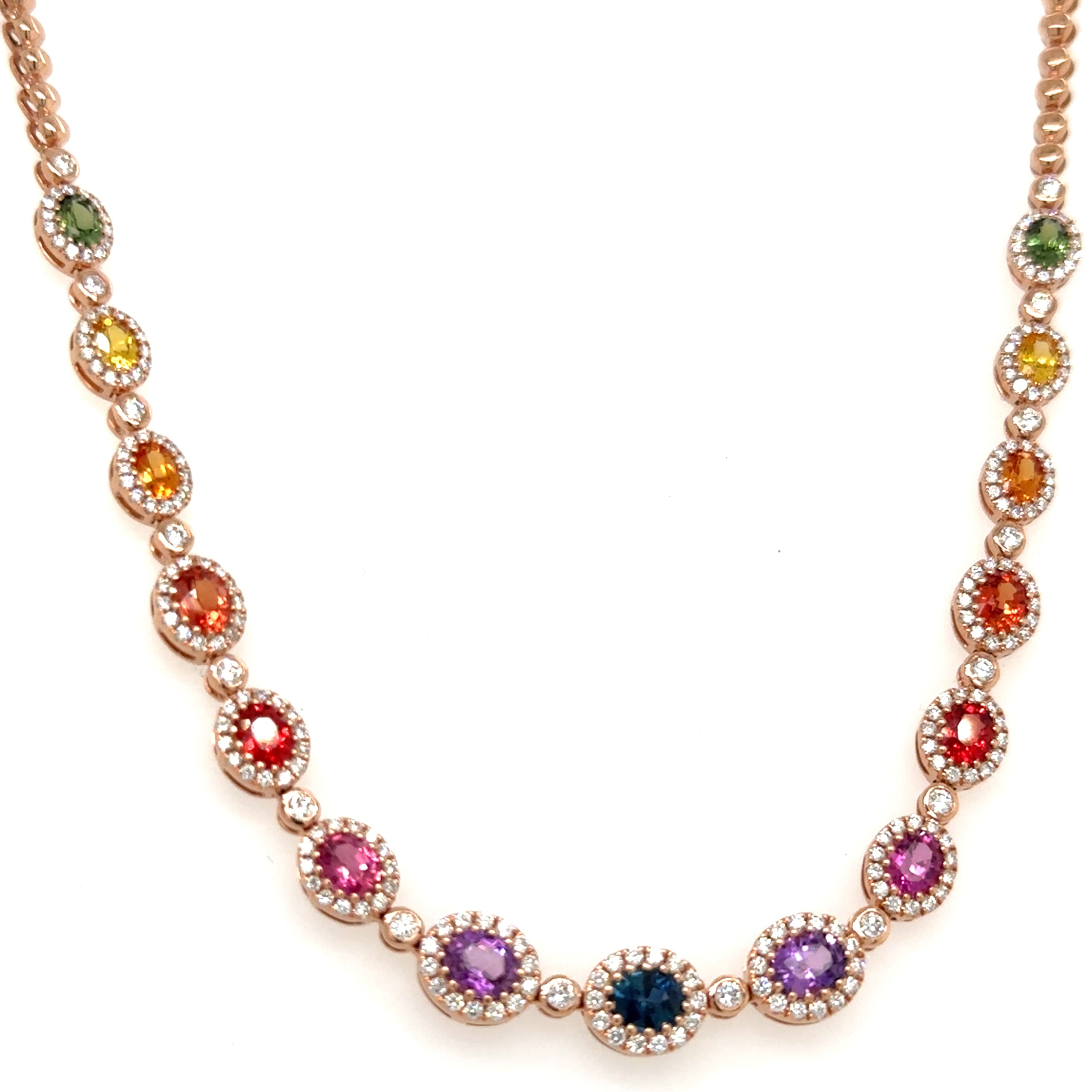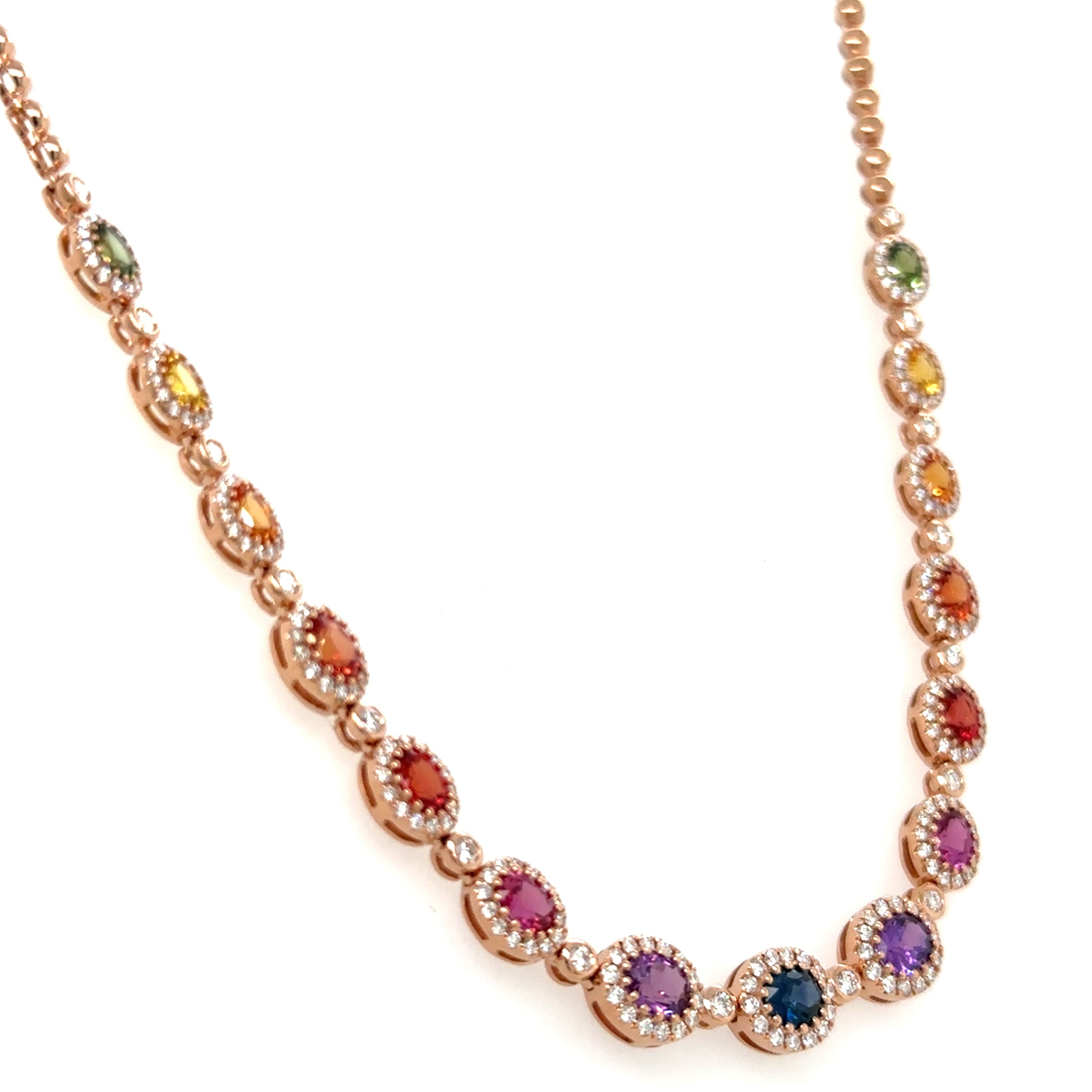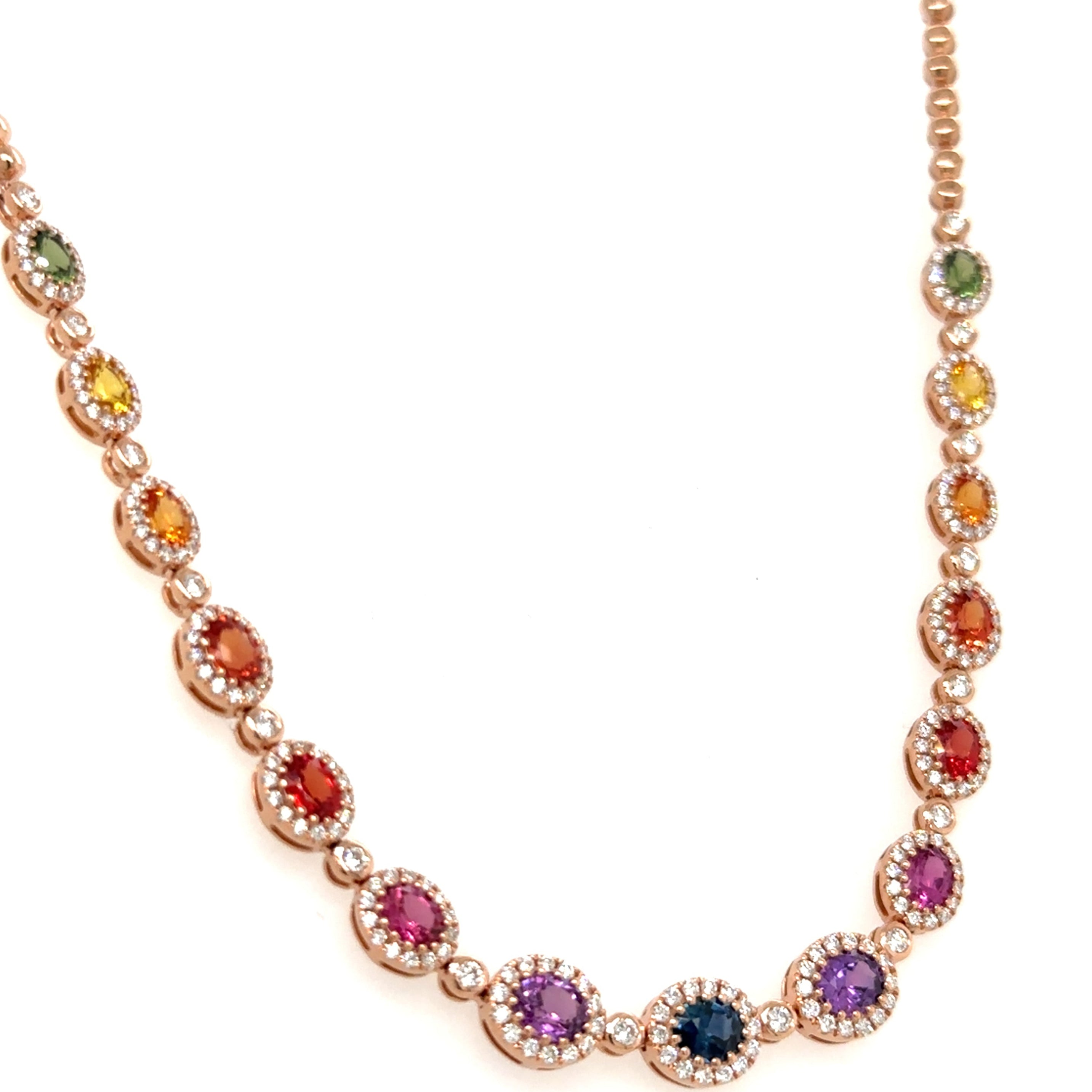 Add a vibrant touch to your jewelry collection with our 5.74ct tw oval-cut rainbow sapphire and diamond gem stone tennis necklace. Sparkling sapphires and diamonds create a colorful and elegant statement piece that will surely turn heads. Elevate any outfit with this stunning necklace.