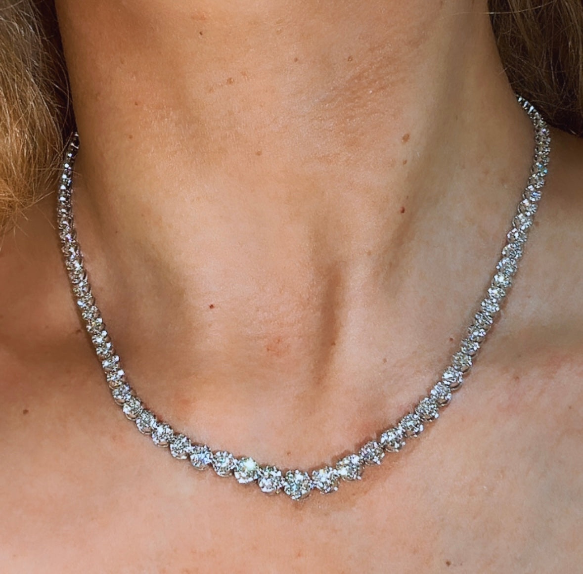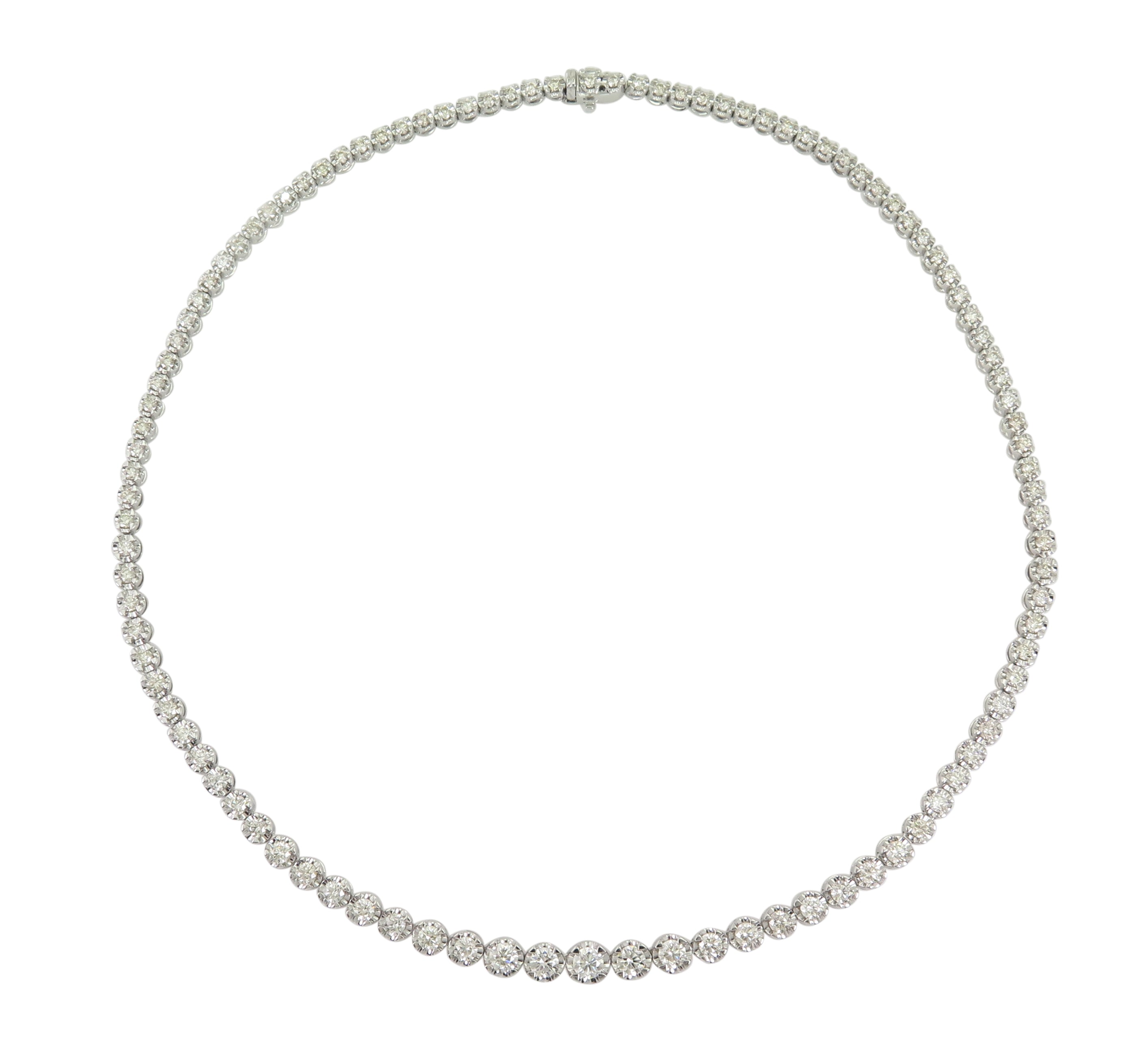Be the talk of the town with this stunning 7.07ct tw miracle set shows each diamond 20% larger diamond riviera line tennis statement necklace. Crafted with only the finest diamonds, this luxurious necklace is sure to turn heads and make a statement. Transform any ensemble into something special, and feel like a true fashionista with this one-of-a-kind piece!