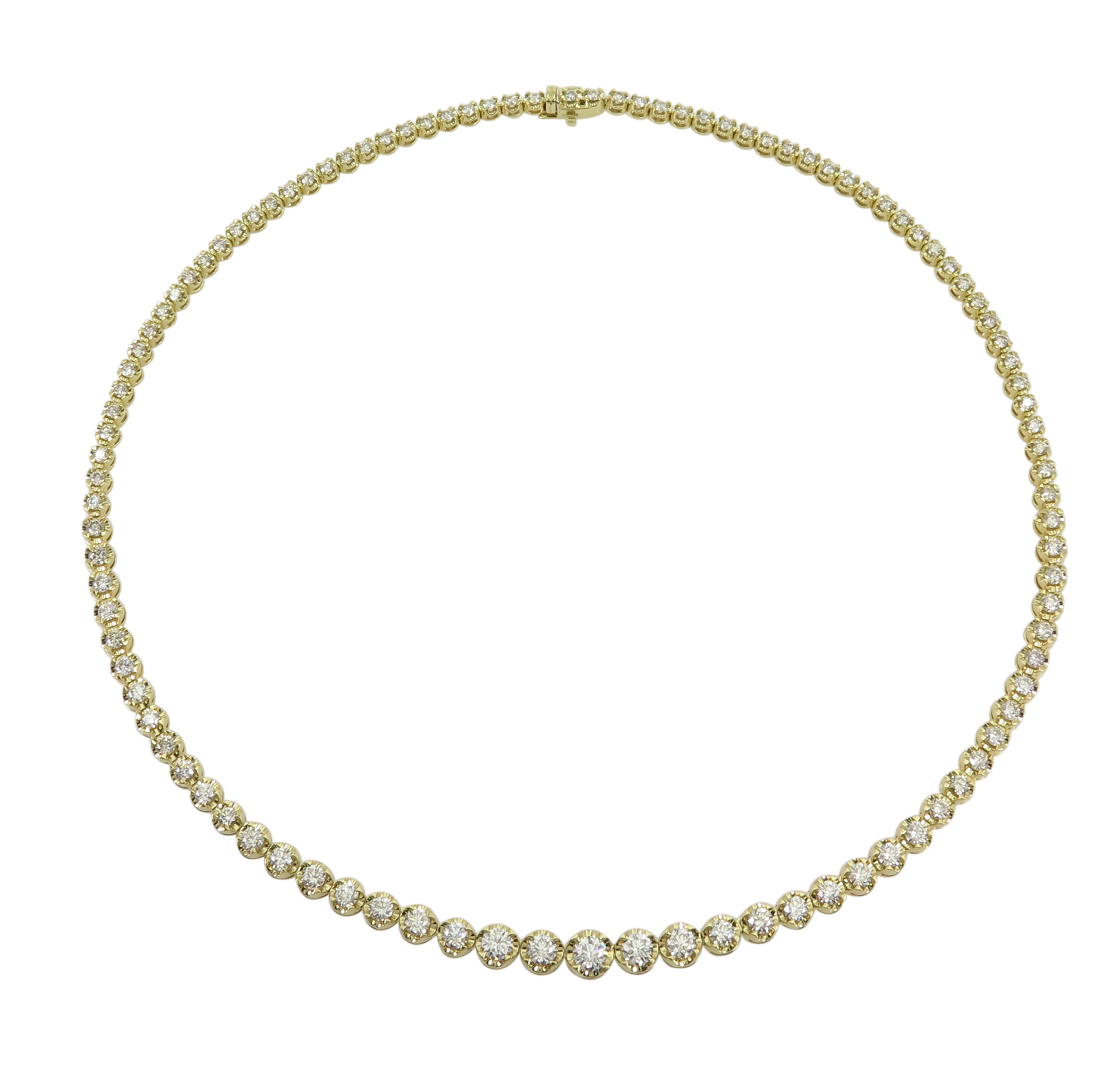 Be the talk of the town with this stunning 7.08ct tw miracle set shows each diamond 20% larger diamond riviera line tennis statement necklace. Crafted with only the finest diamonds, this luxurious necklace is sure to turn heads and make a statement. Transform any ensemble into something special, and feel like a true fashionista with this one-of-a-kind piece!