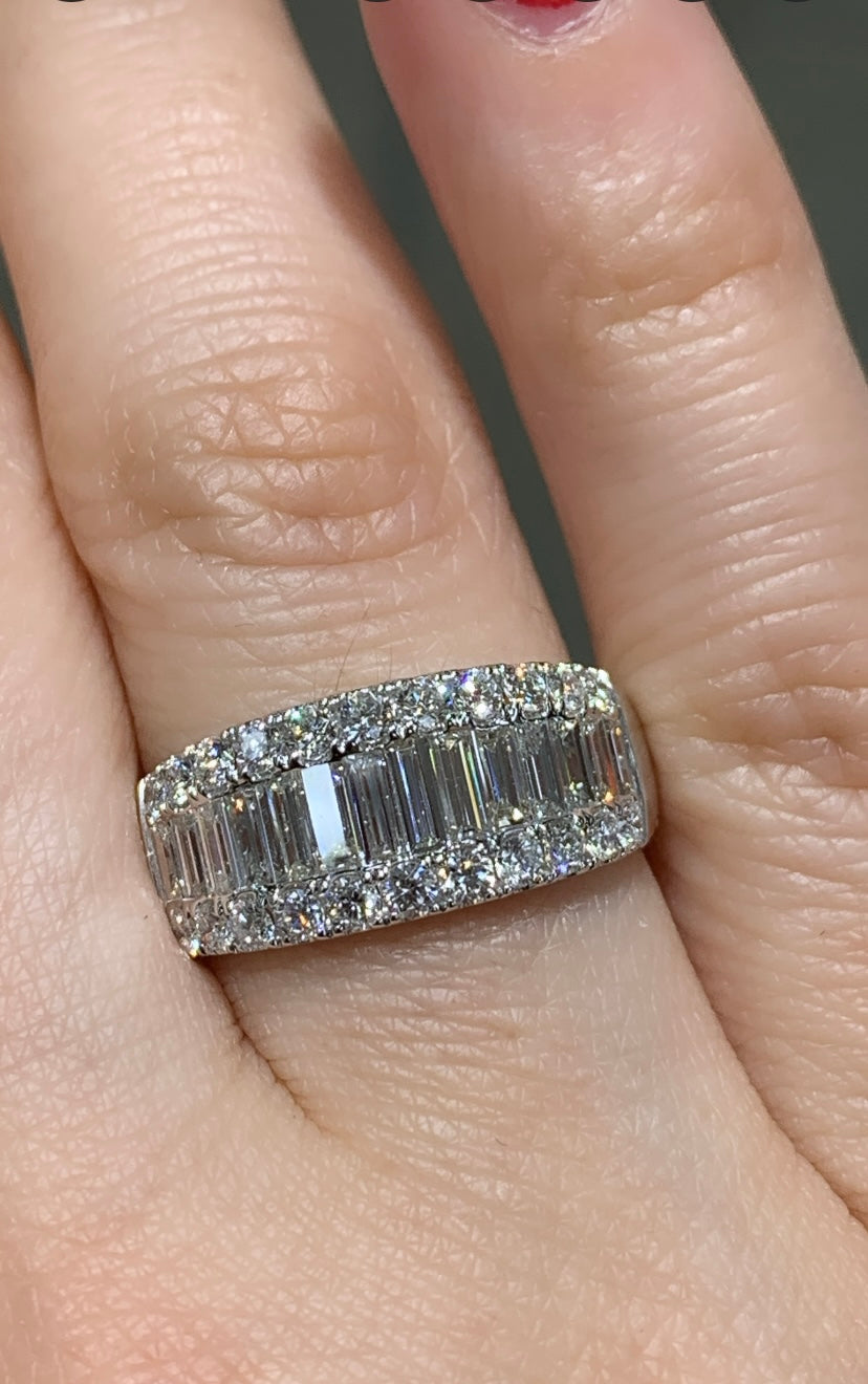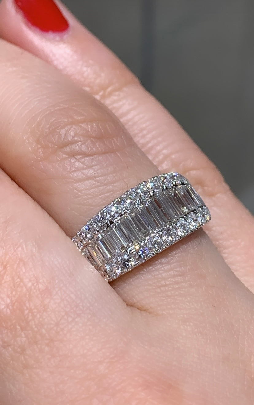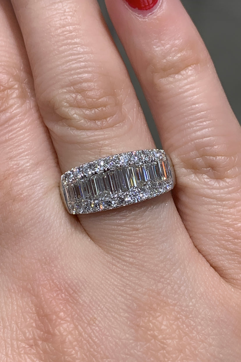 Looking for an anniversary band that has a fashionista in mind, but that manages to be classy at the same time? Then we think that we have the perfect diamond ring for you. This 1.58ct t.w. baguette and round diamond ring combine round and baguette-shaped stones. Its classic style adds lots of sparkle to any girl's finger. And what is great is that you can wear this as an anniversary ring, or simply as a fabulous accessory.