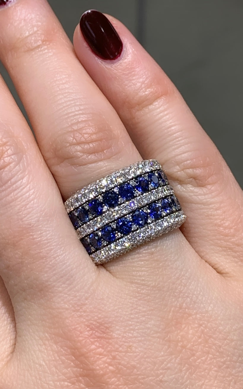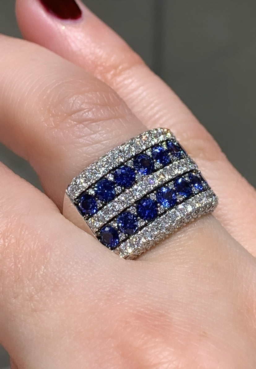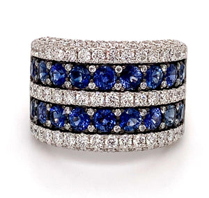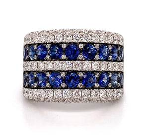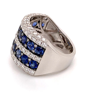 Blue Sapphire And Pave Diamond 5 Rows Wide Cocktail Ring
