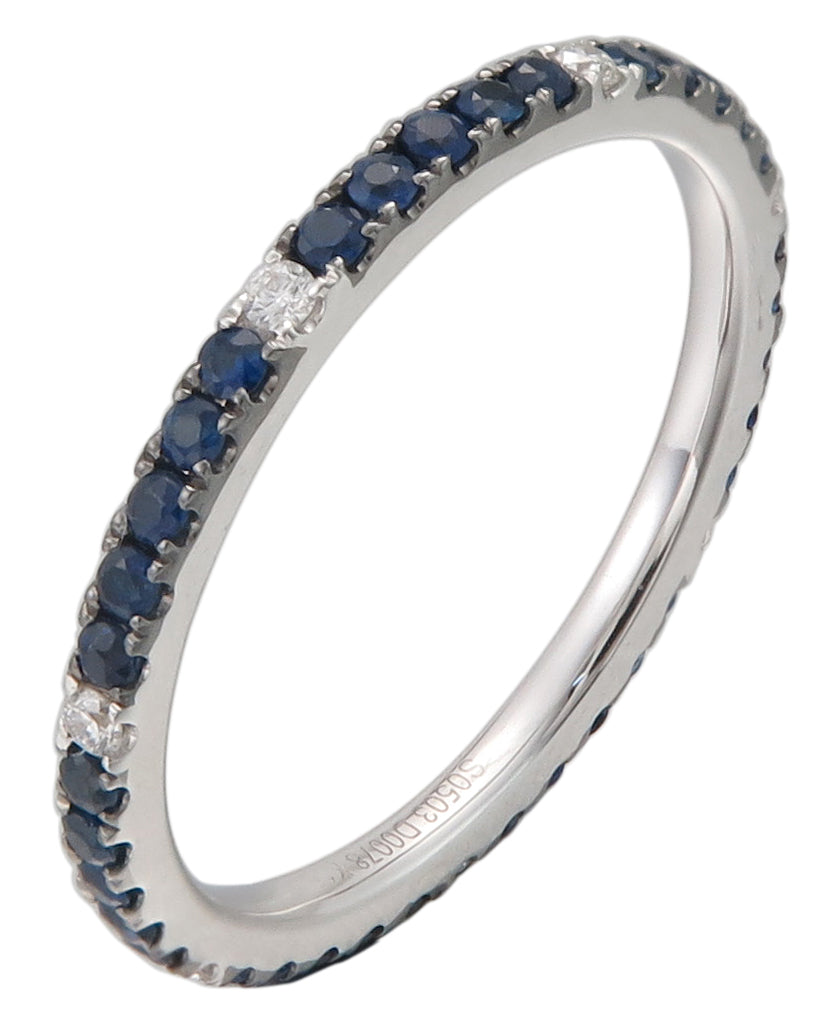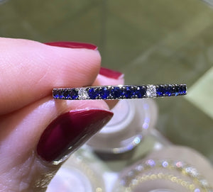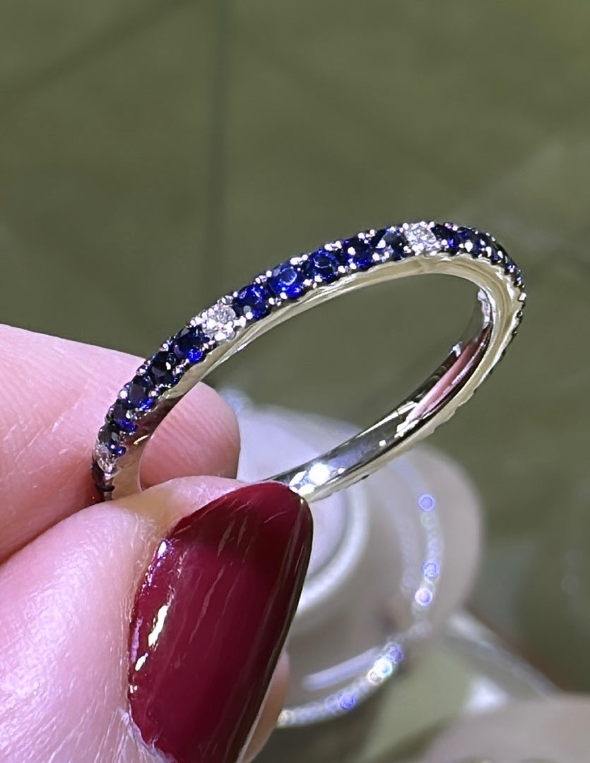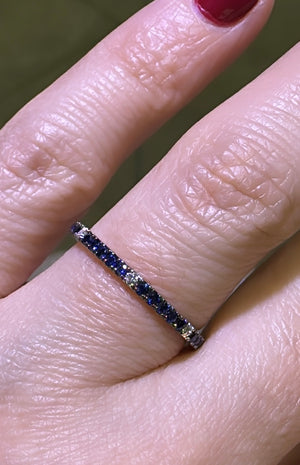 When it comes to stackable rings there can never be enough of them. This blue sapphire eternity band crafted in 18K gold and dipped in black rhodium is so chic and elegant. Wear it next to a diamond band and create a blue & white look that will make everyone green with envy.