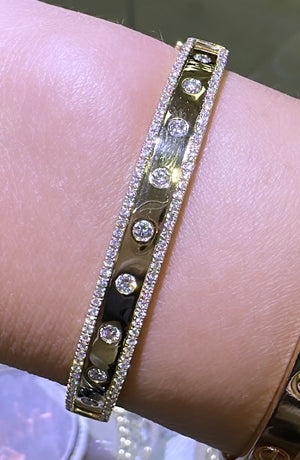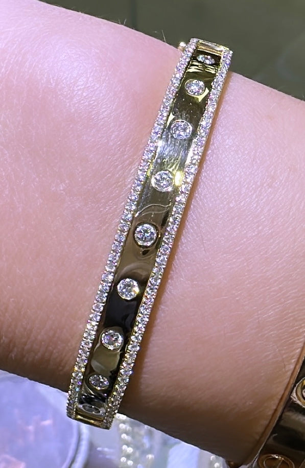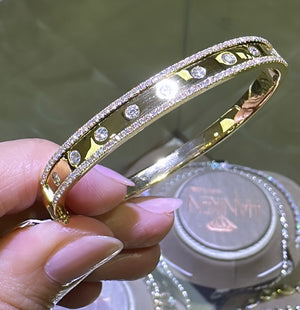 This best-selling style boasts a polished gold finished inlaid with 115 sparkling round-cut diamonds. Two rows of glittering diamonds line this bangle - a great piece to wear alone or as the anchor of a stack. An instant classic that will become your signature.