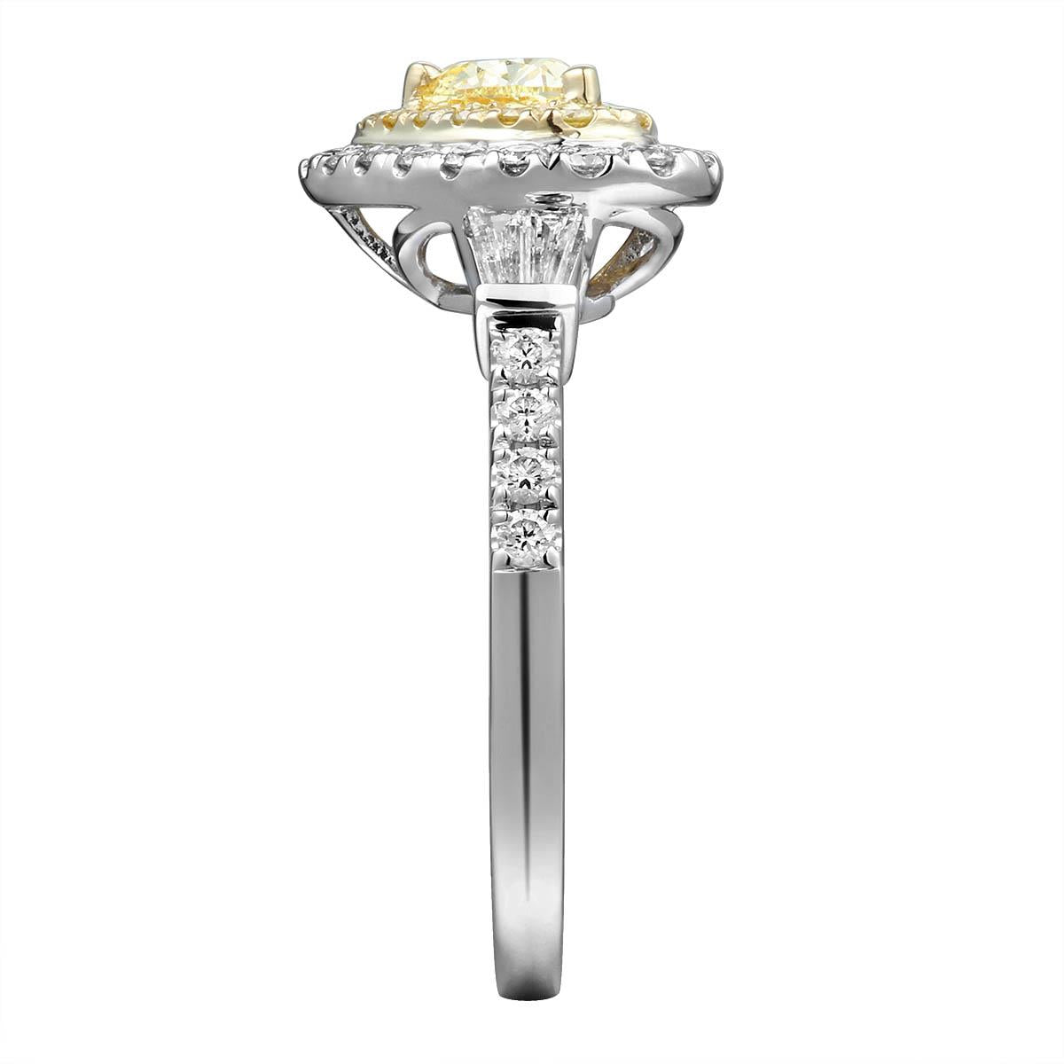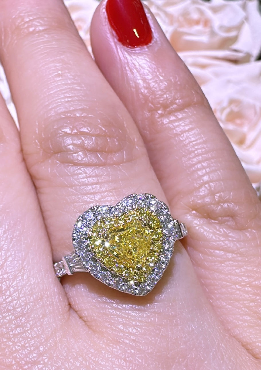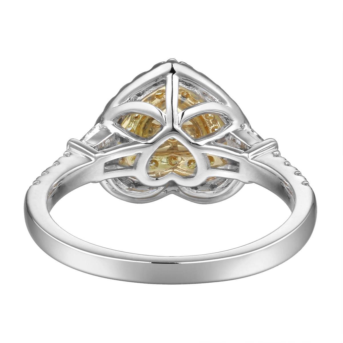 Elevate your style with our stunning canary fancy vivid yellow heart shape cut halo ring. With a brilliant 0.96ct total weight, this ring boasts a striking heart-shaped cut that will catch the eye of all who see it. Add a touch of elegance to any outfit with this beautiful statement piece.