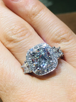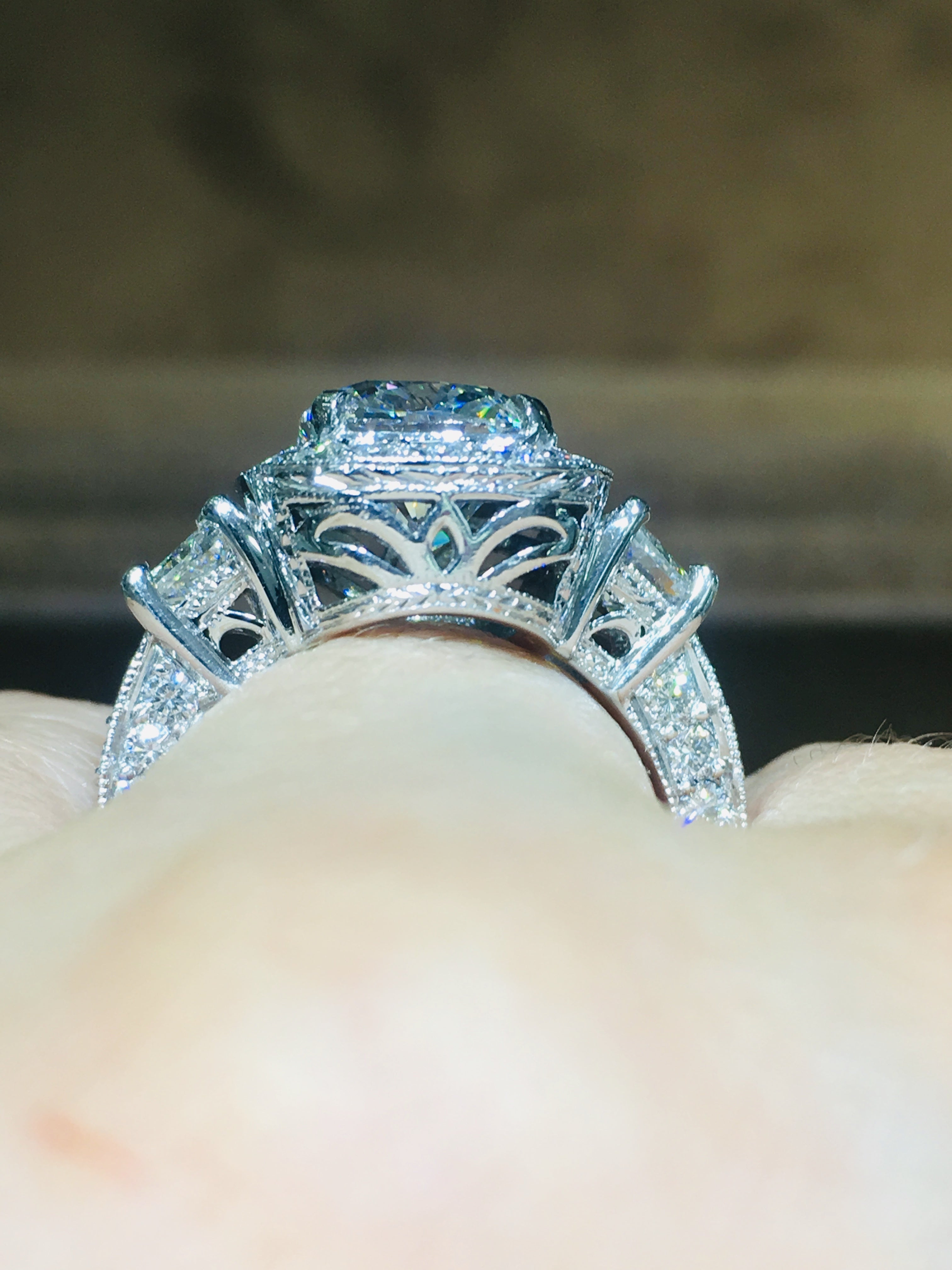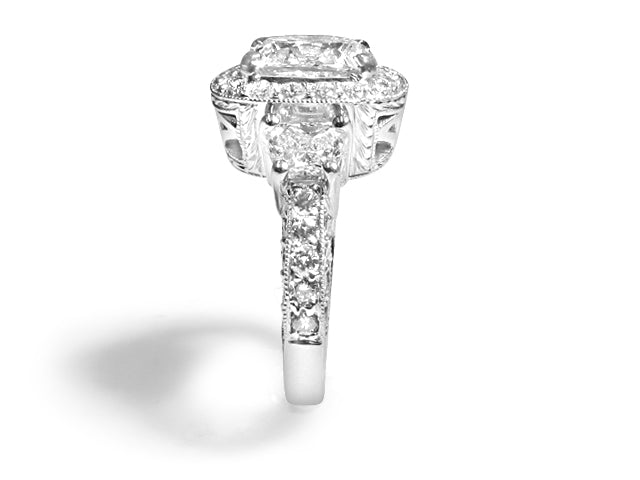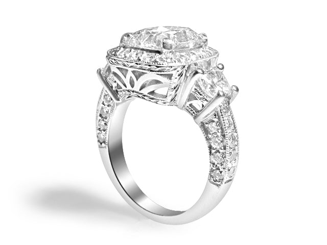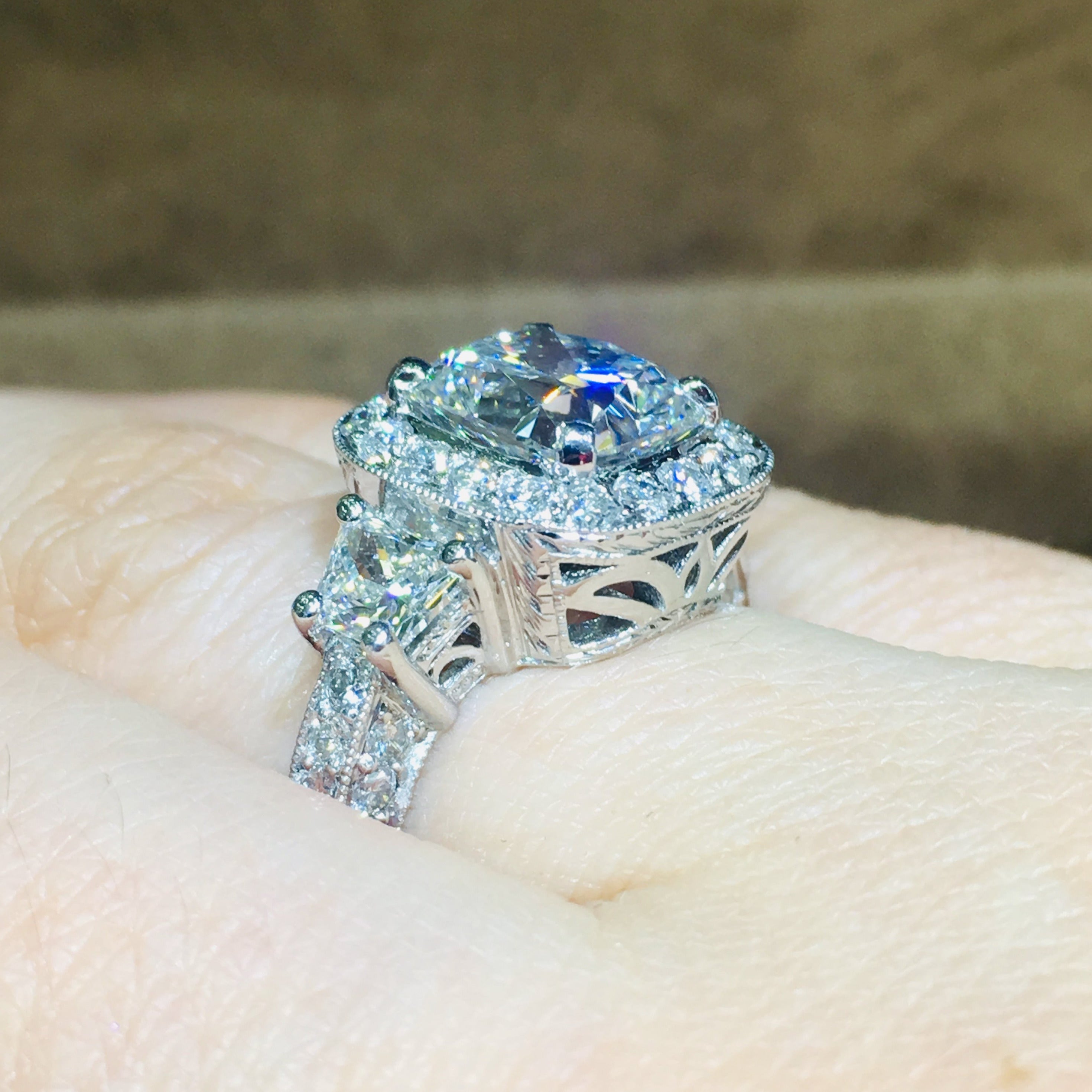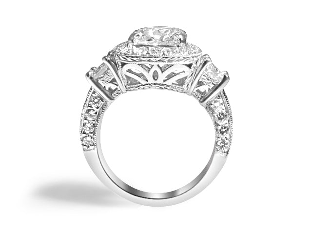 You will adore our Cushion Cut Three Stone Diamond Ring because of its fantastic sparkle and shine! Even more sparkle is added by pave set round diamonds along the shoulders. Totaling 4.92ct t.w. of sparkle we guarantee you'll never take this one off!