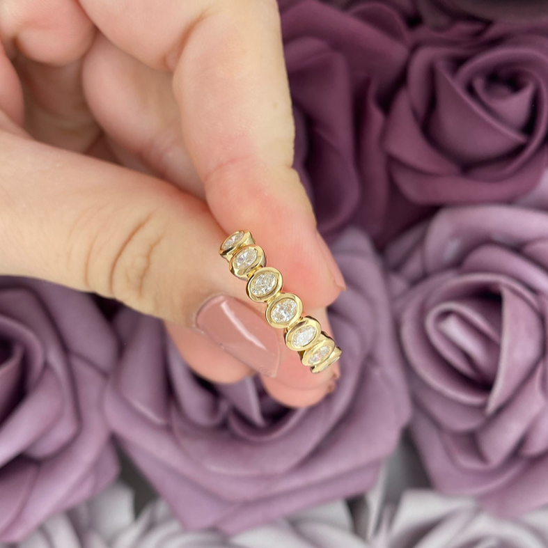 Elevate your style with our designer oval-cut bezel diamond partway band ring! With its stunning 0.86ct tw oval-cut diamonds, this ring is sure to turn heads. Its unique bezel design offers a modern twist on a classic band, perfect for adding a touch of luxury to any outfit. Make a statement and feel confident with this exquisite piece.