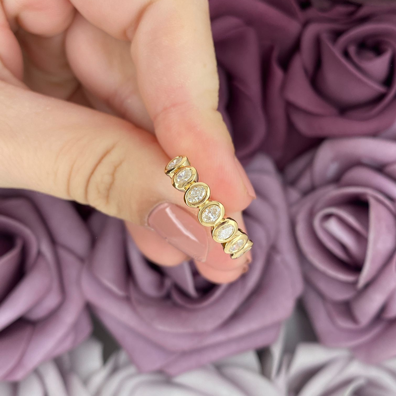 Indulge in timeless elegance with our designer oval-cut bezel diamond partway band ring 1.21ct tw. This stunning piece features a sparkling 1.21ct tw diamond set in a beautiful oval-cut bezel setting. The design is both classic and contemporary, making it the perfect statement piece for any occasion. Elevate your style and add a touch of luxury with this exquisite ring.