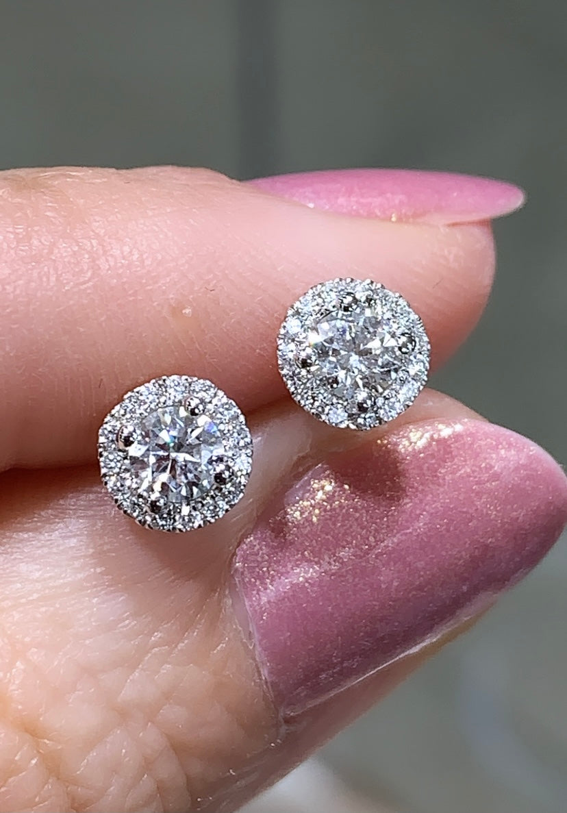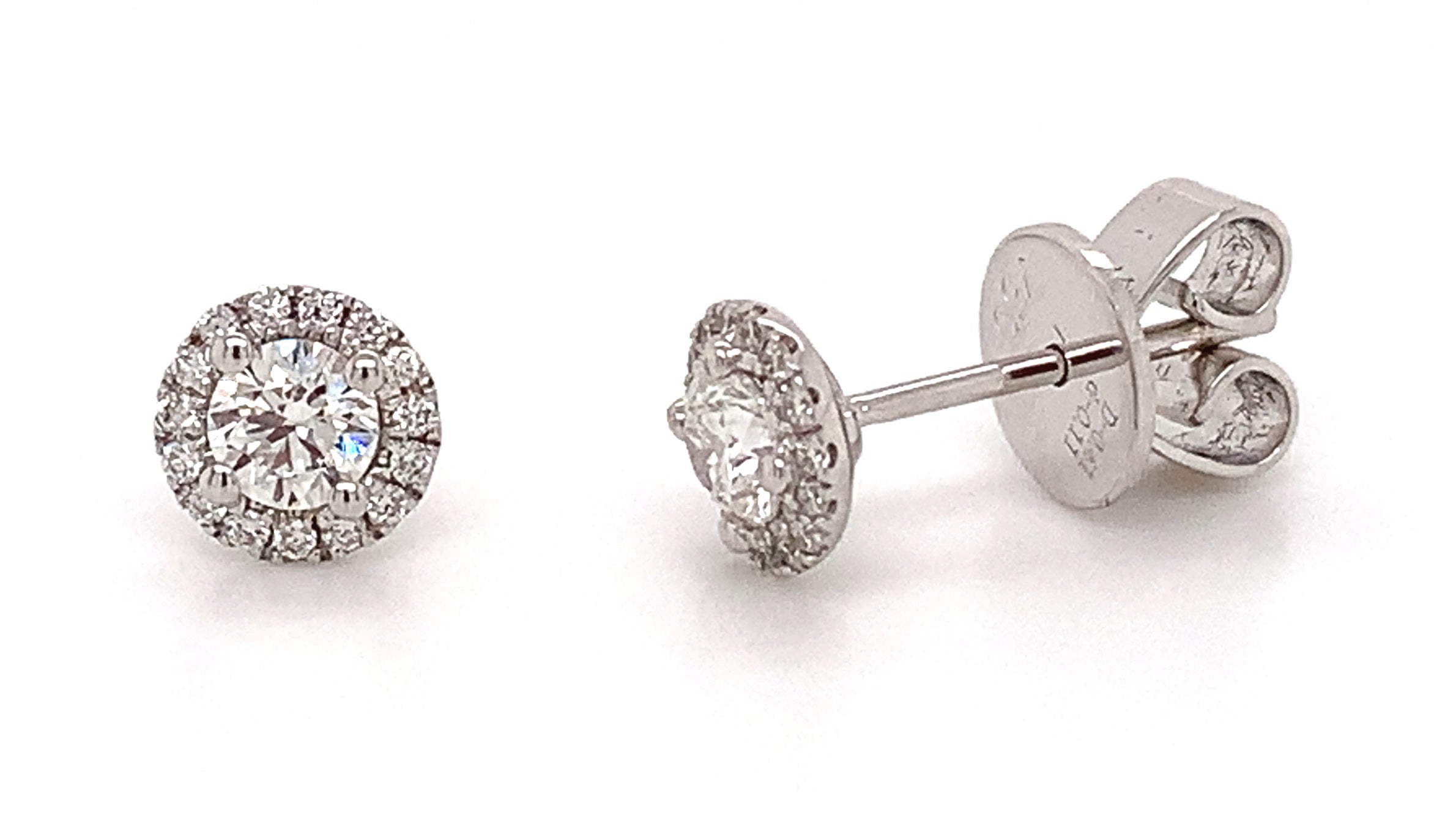 Mystical and enchanting, these stud like earrings feature beautiful round white diamonds. Center diamonds are surrounded by smaller round brilliant cuts which gives these studs a much bigger look for half the price. Crafted from lustrous 18kt white gold and 6mm in width you will find yourself wearing these every day.