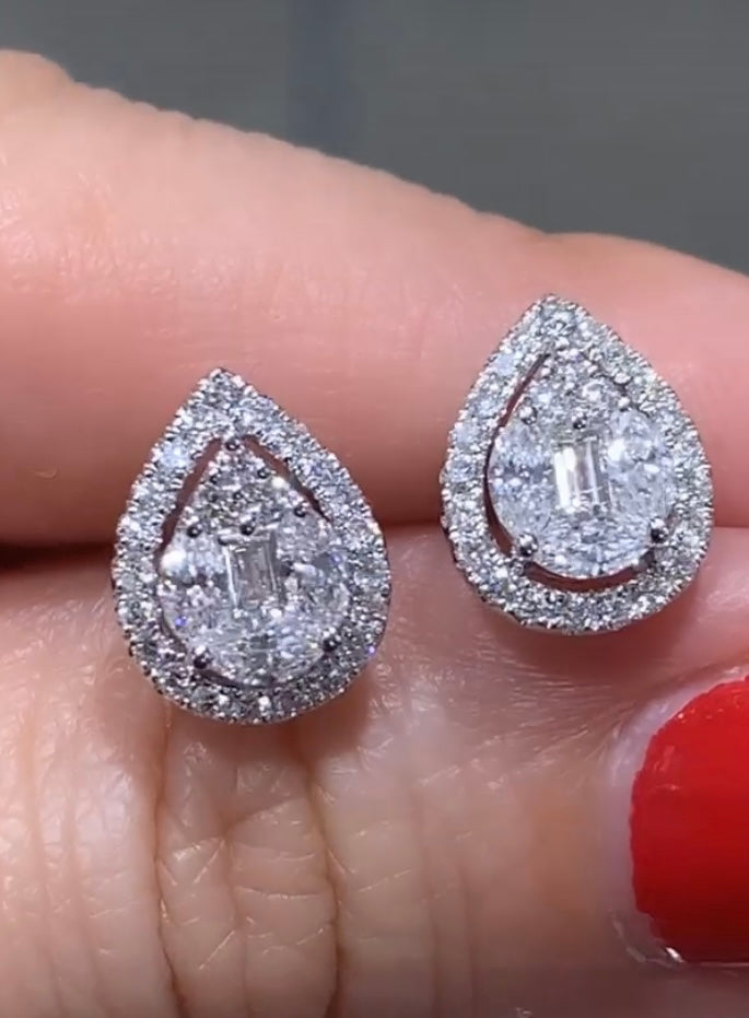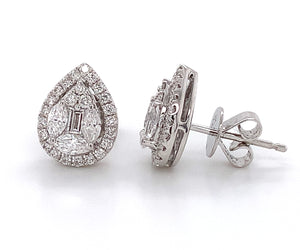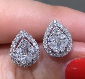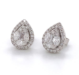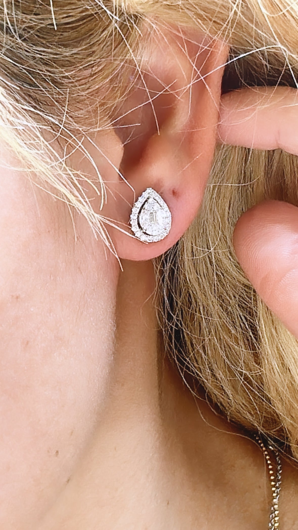 These stud earrings feature cluster, invisible set beautiful pear center diamond with a halo. Center pear cut center diamond is surrounded by smaller round brilliant cuts which gives these studs a much bigger look for half the price. Crafted from lustrous 18K white gold you will find yourself wearing these every day.