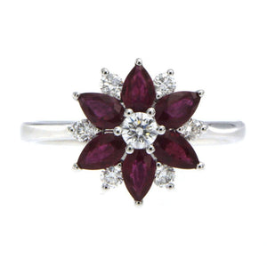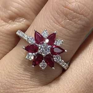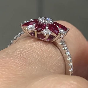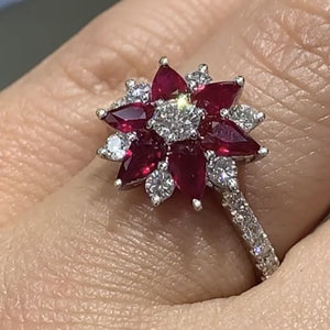 A dazzling, mystifying shade of red rubies with diamonds is in a class all by itself. This deep red right hand ring is as luxurious as it gets!