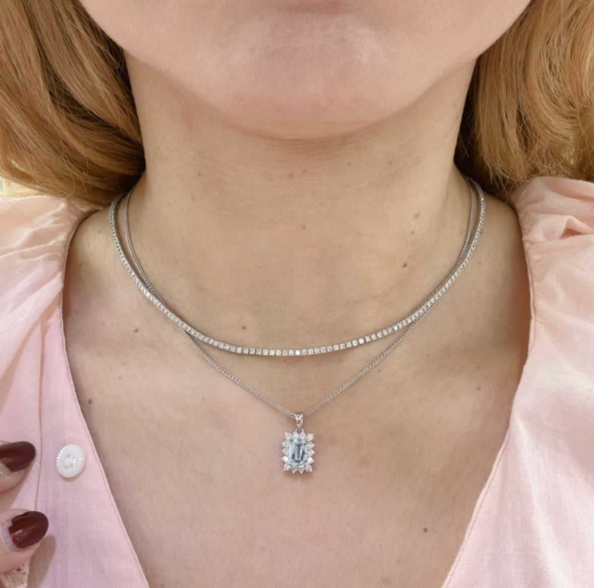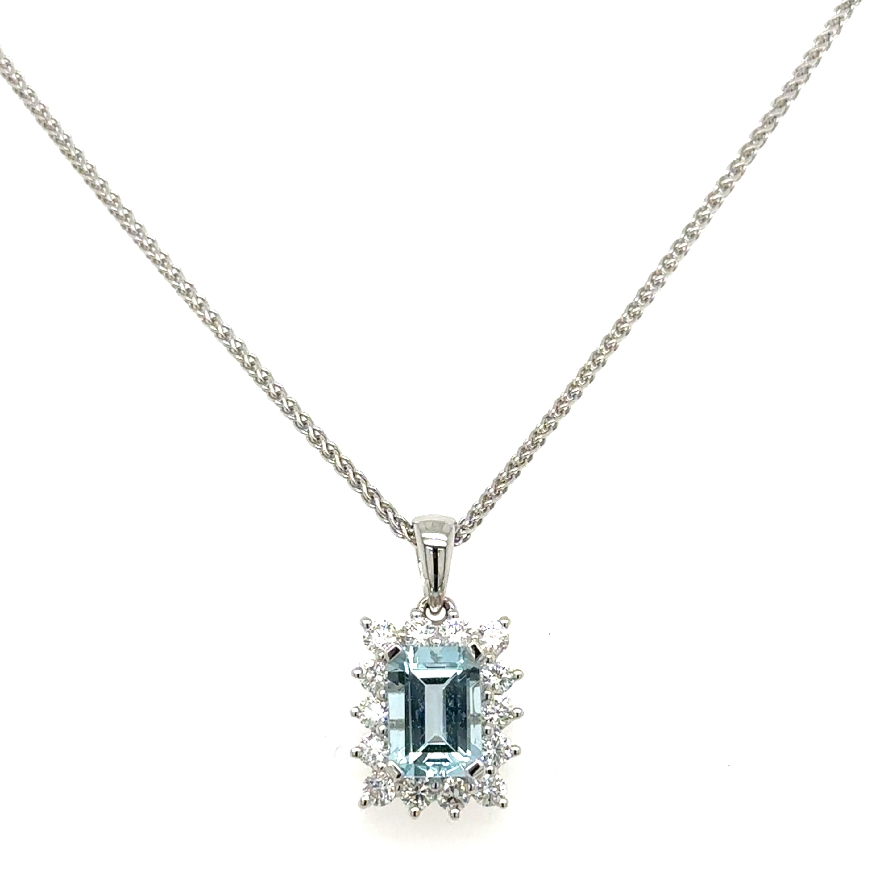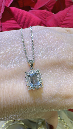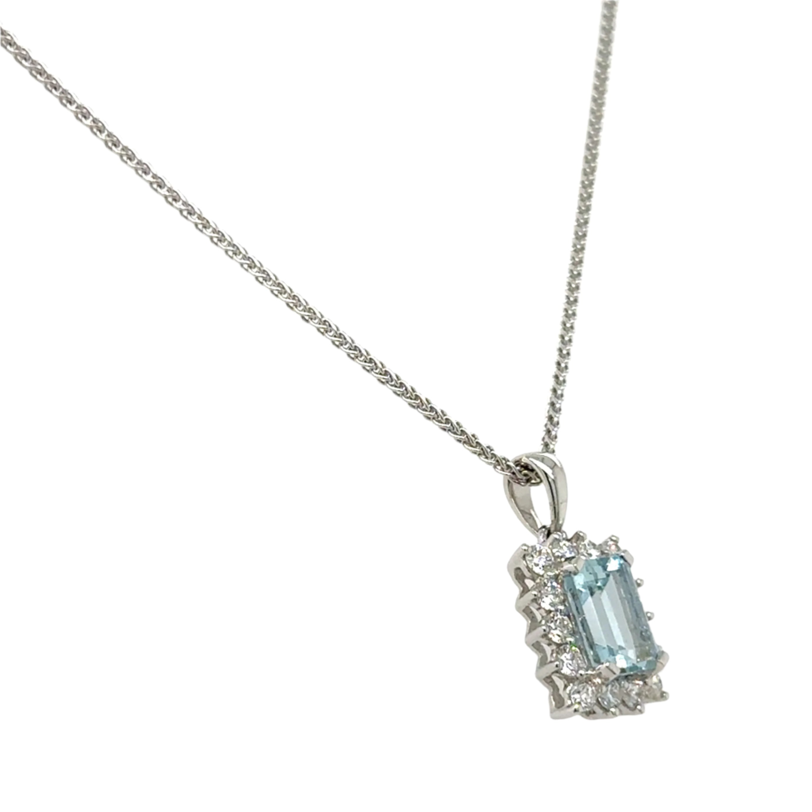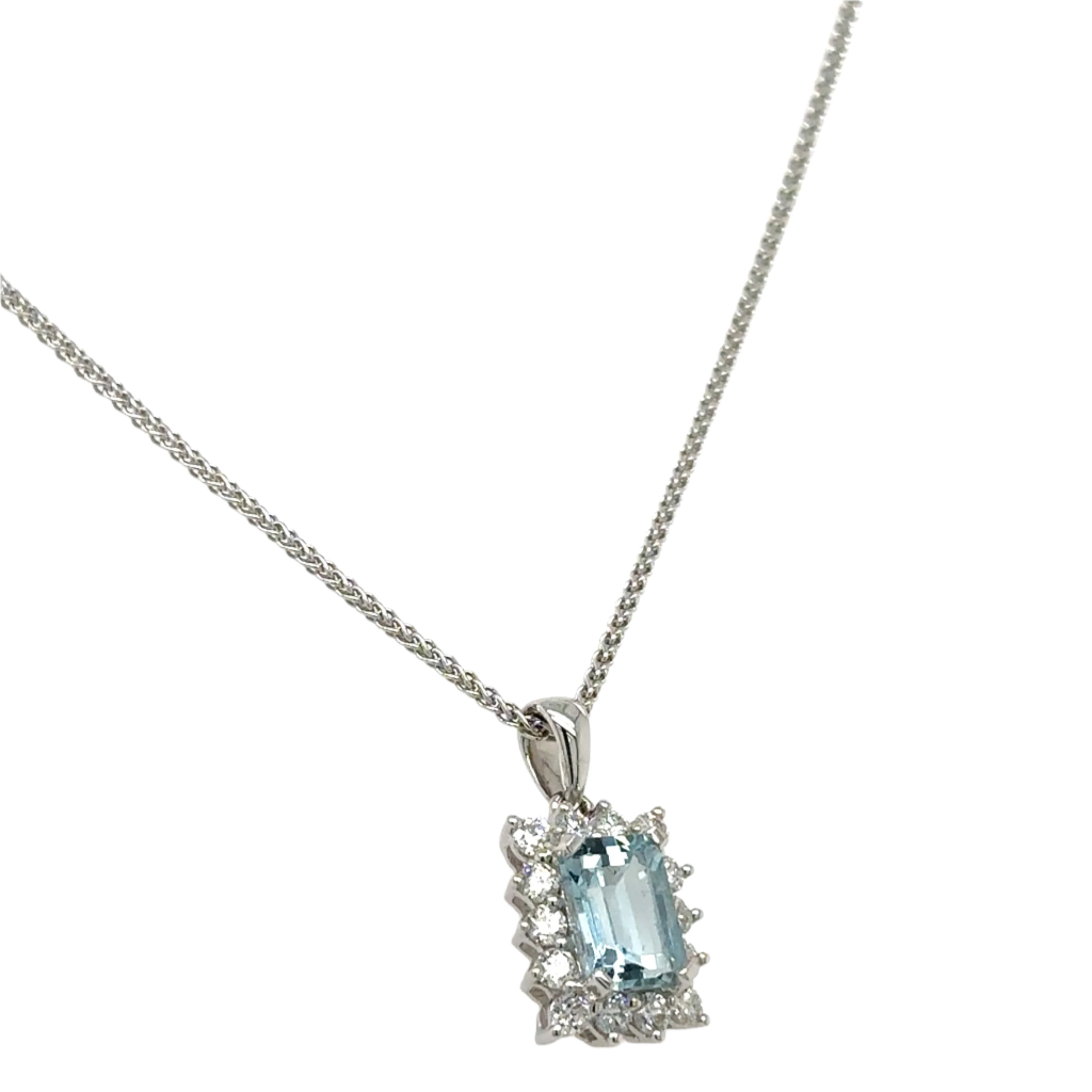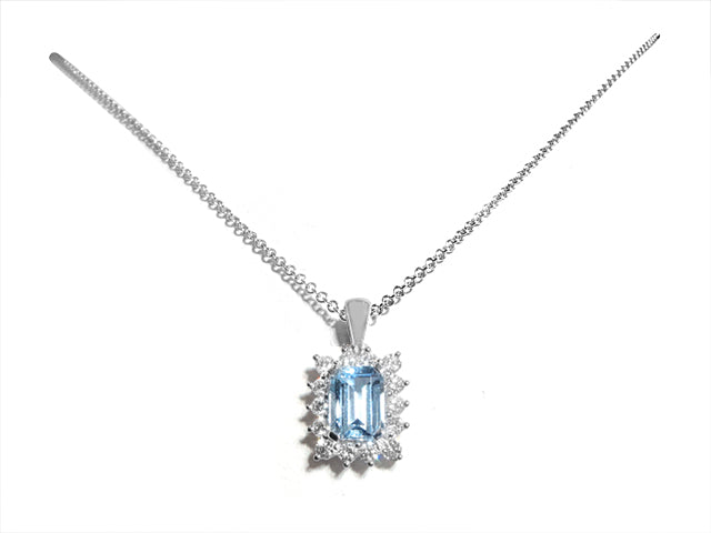 It's so hard to stop yourself from falling in love with this aquamarine pendant. A fabulous birthstone necklace as well as everyday fashion pendant. The necklace has a white gold chain and diamonds.
