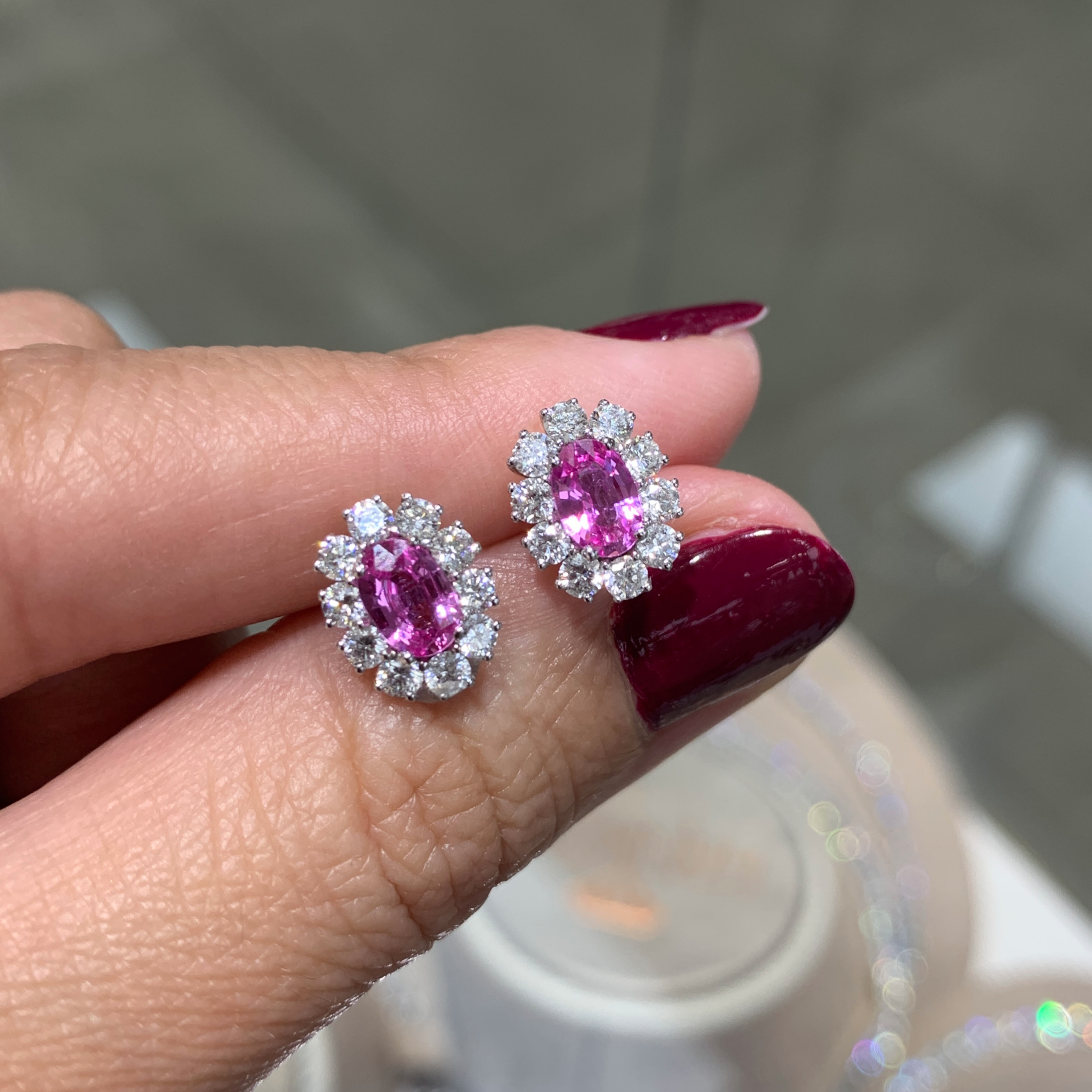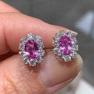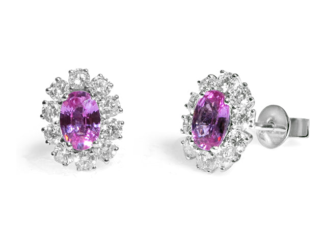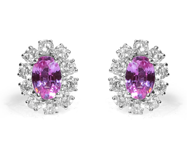 Pink sapphire earrings that are elegant and comfortable for every day wear. Pink Sapphires with vivid color that will match almost any outfit. Diamonds add a nice touch of sparkle and class