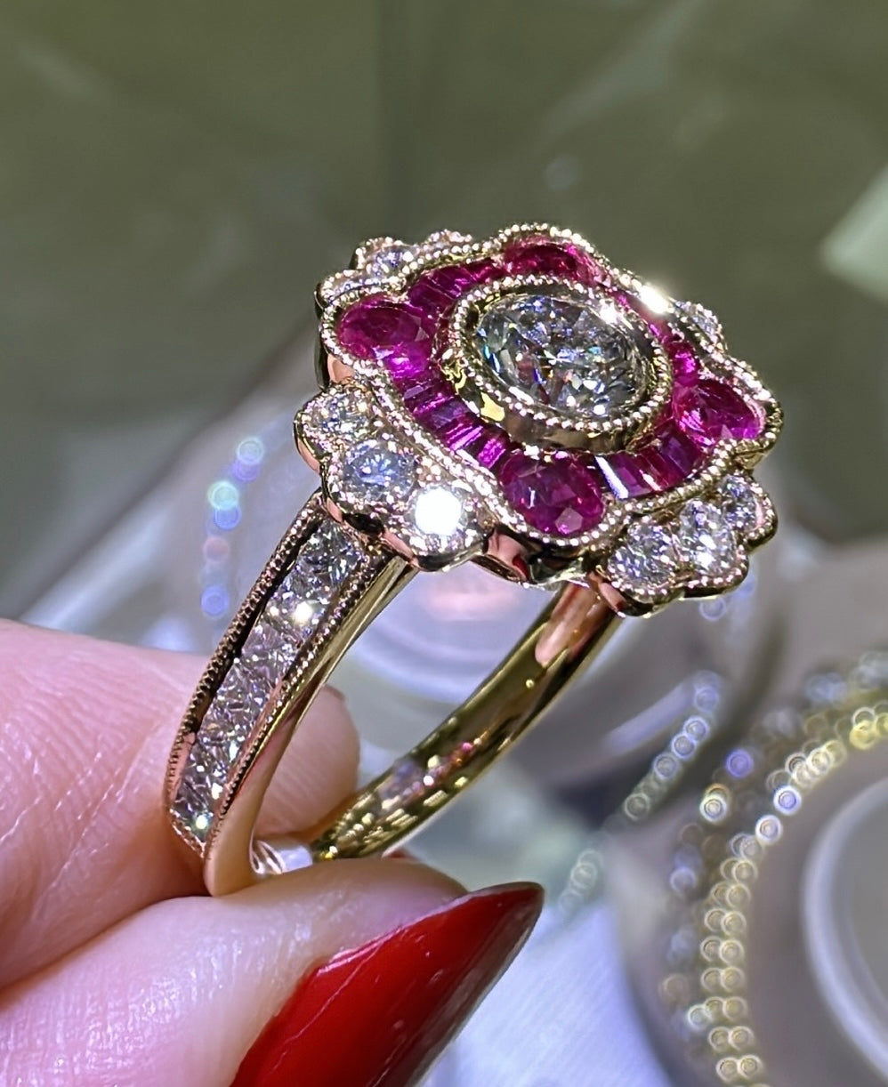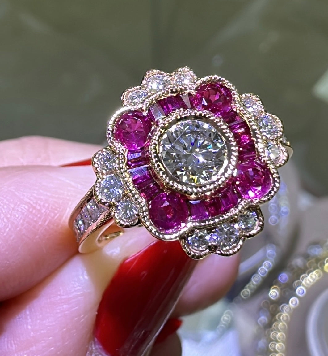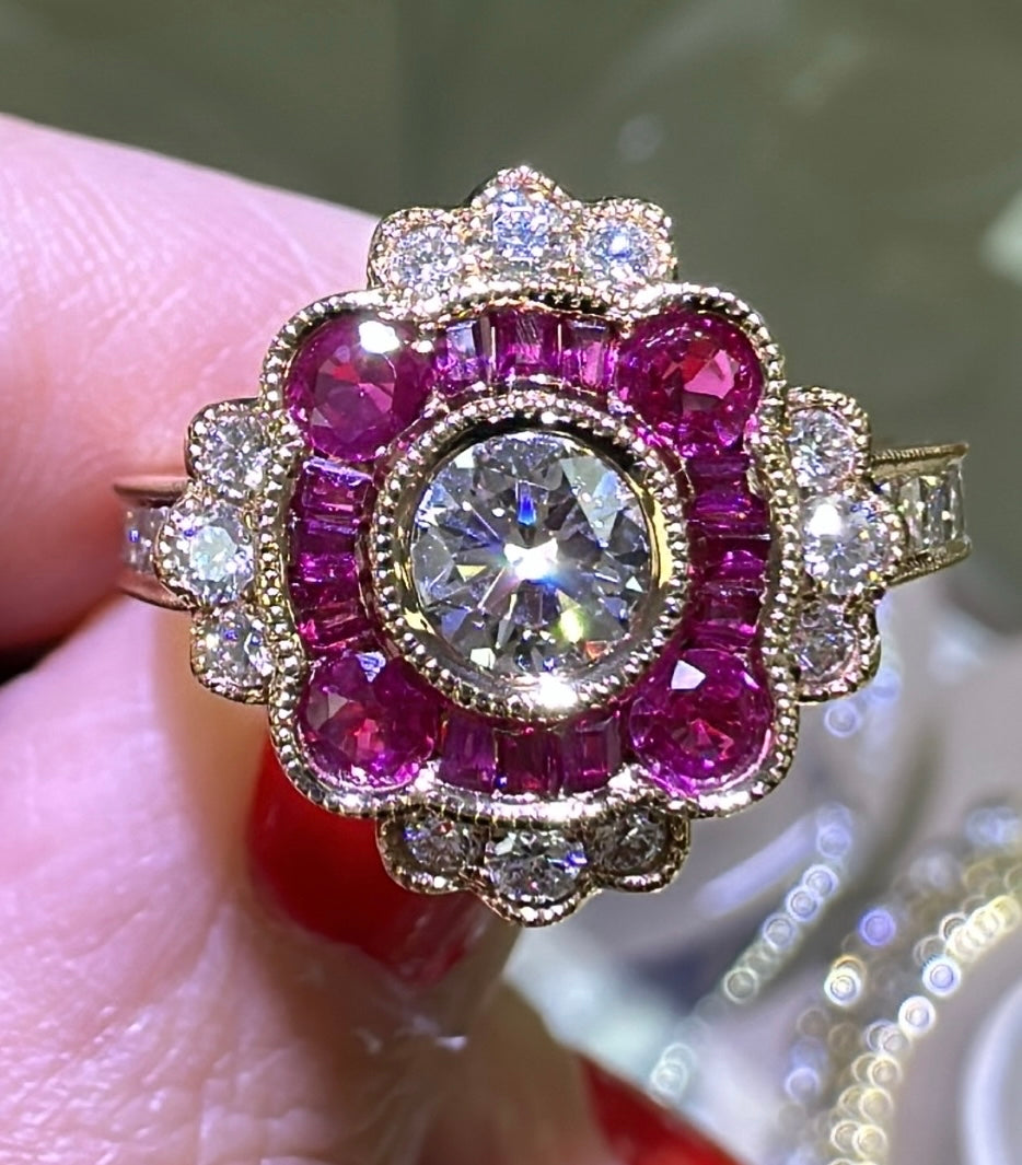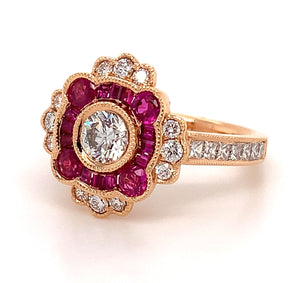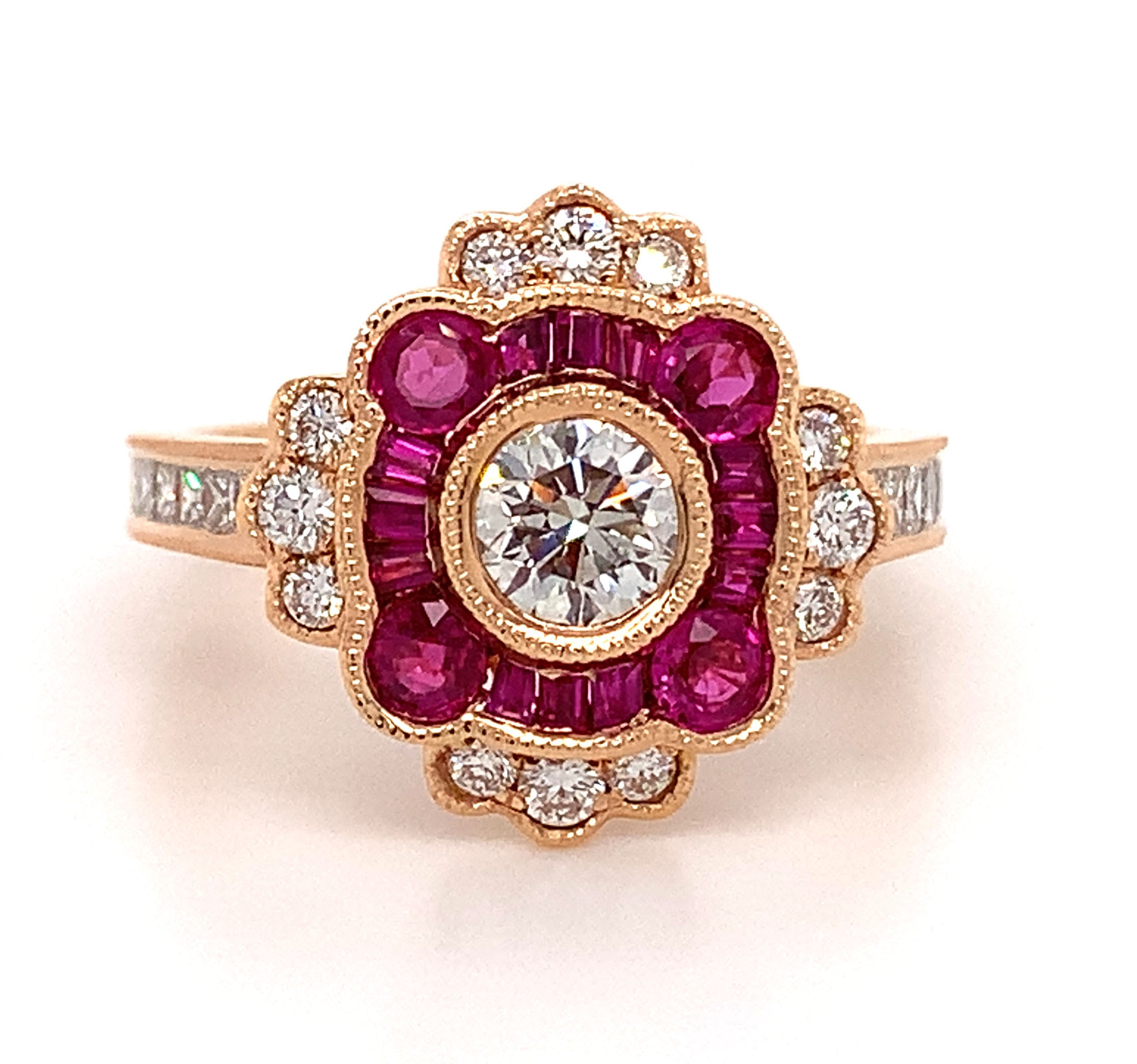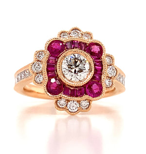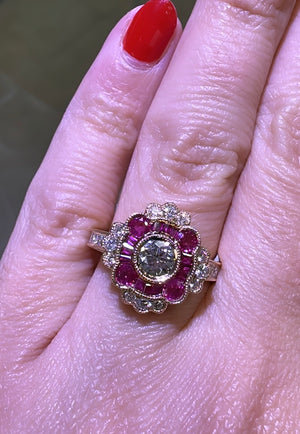 A dazzling, mystifying shade of red rubies with diamonds is in a class all by itself. This deep red right hand ring is as luxurious as it gets! Center round brilliant cut diamond is complimented by baguette, round cut rubies, round and princess cut diamonds. Milgrain edging is added all around to give this ring a true royal and antique look.