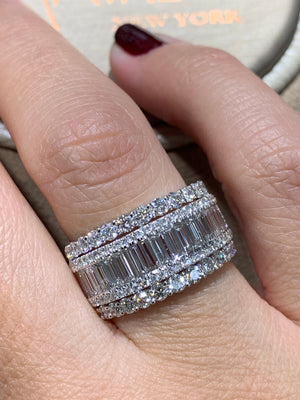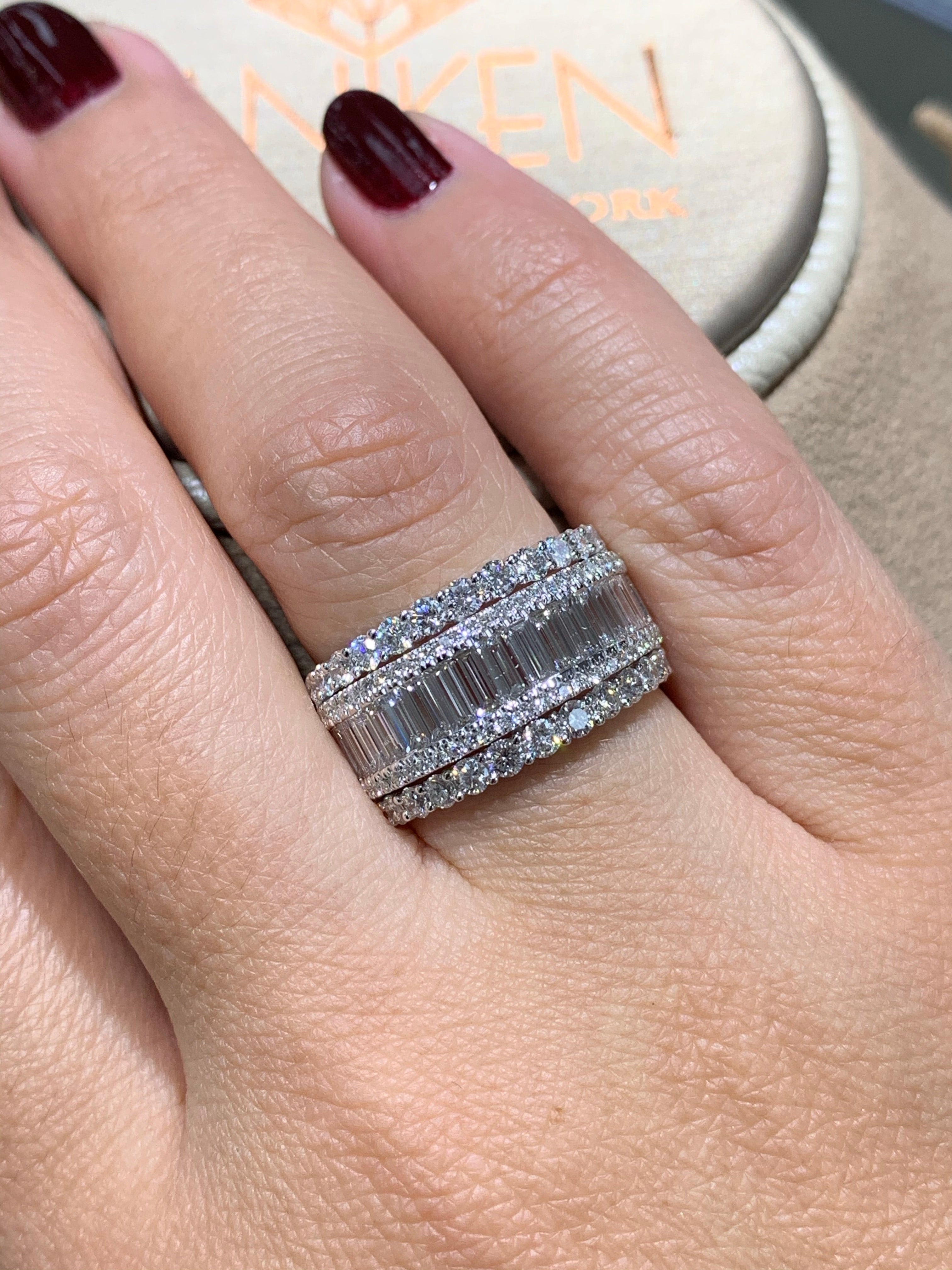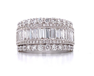 You'll definitely make a big statement with this wide diamond anniversary eternity band! This unique eternity band style is delicately crafted with 2.54carats of baguette and round diamonds that will encircle your finger with chic and elegance.