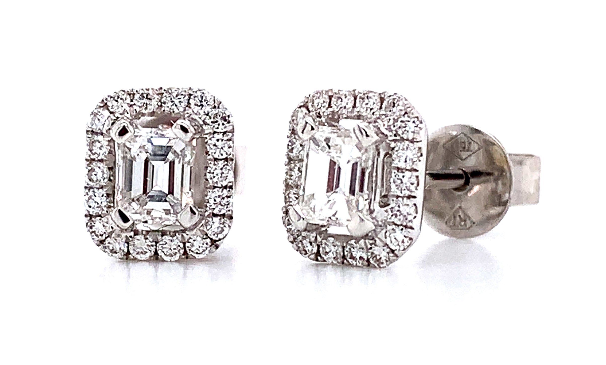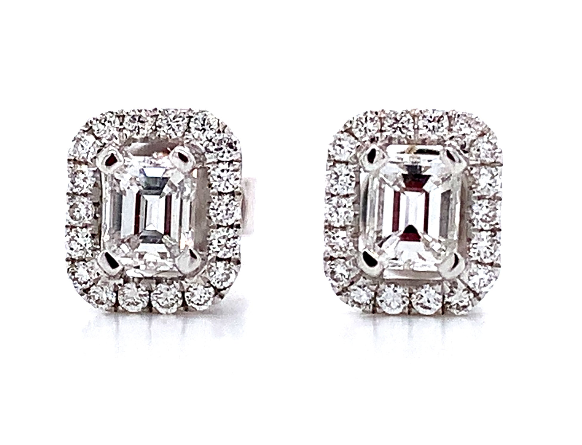 Ladies diamond earrings placed in 18k white gold, set with 0.43ctw emerald cut diamonds in the center and 0.16ct pave round diamonds on the sides. Push backing.