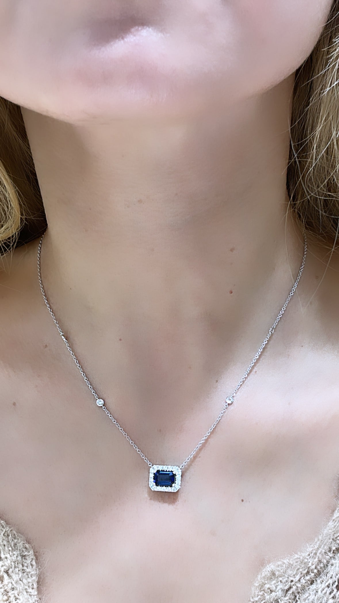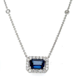 Add a touch of sophistication by putting on this sapphire & diamond pendant day and night. Encrusted with genuine emerald-cut blue sapphire center with diamonds that are round in shape. Pendant is placed on a 16" chain.